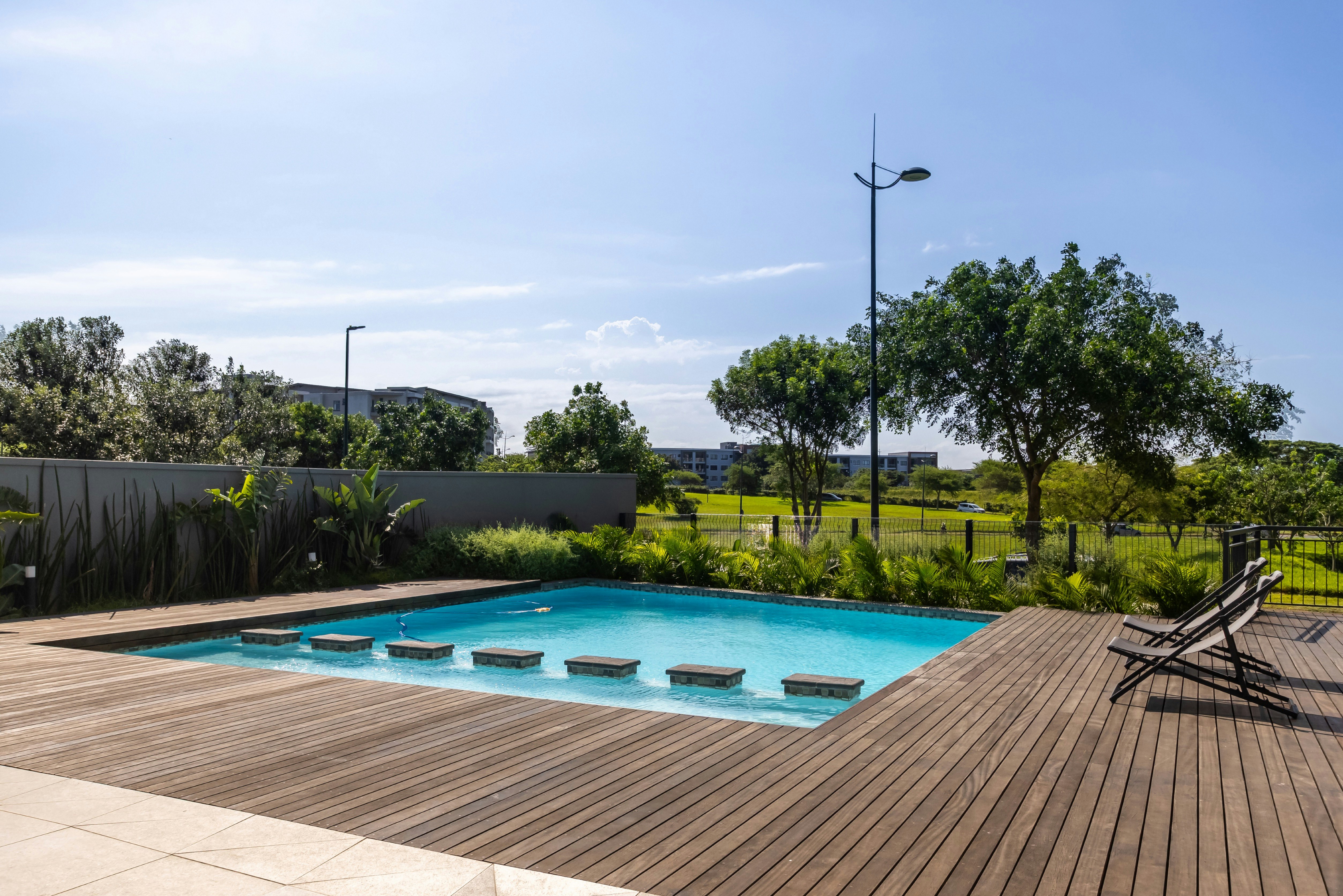 Guests can enjoy the communal swimming pool and dining area.
