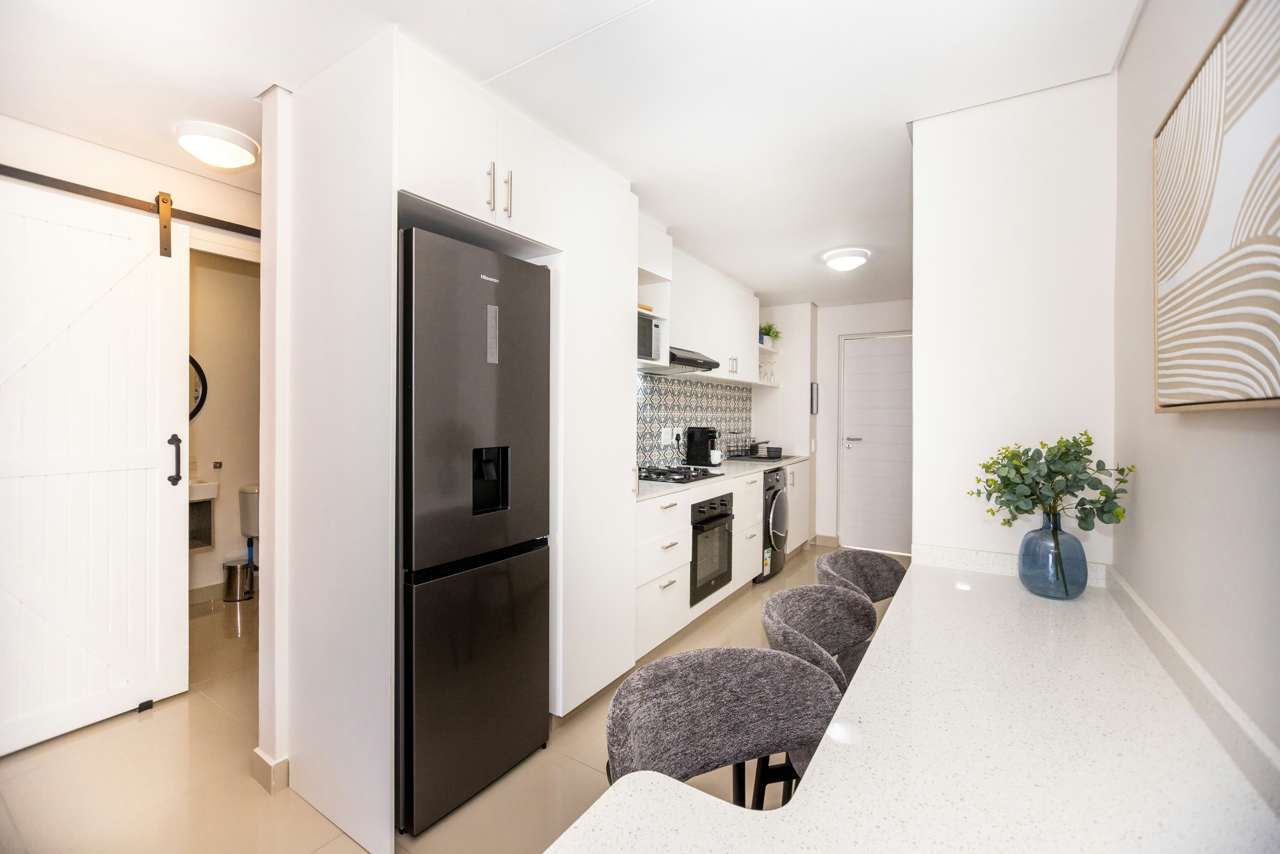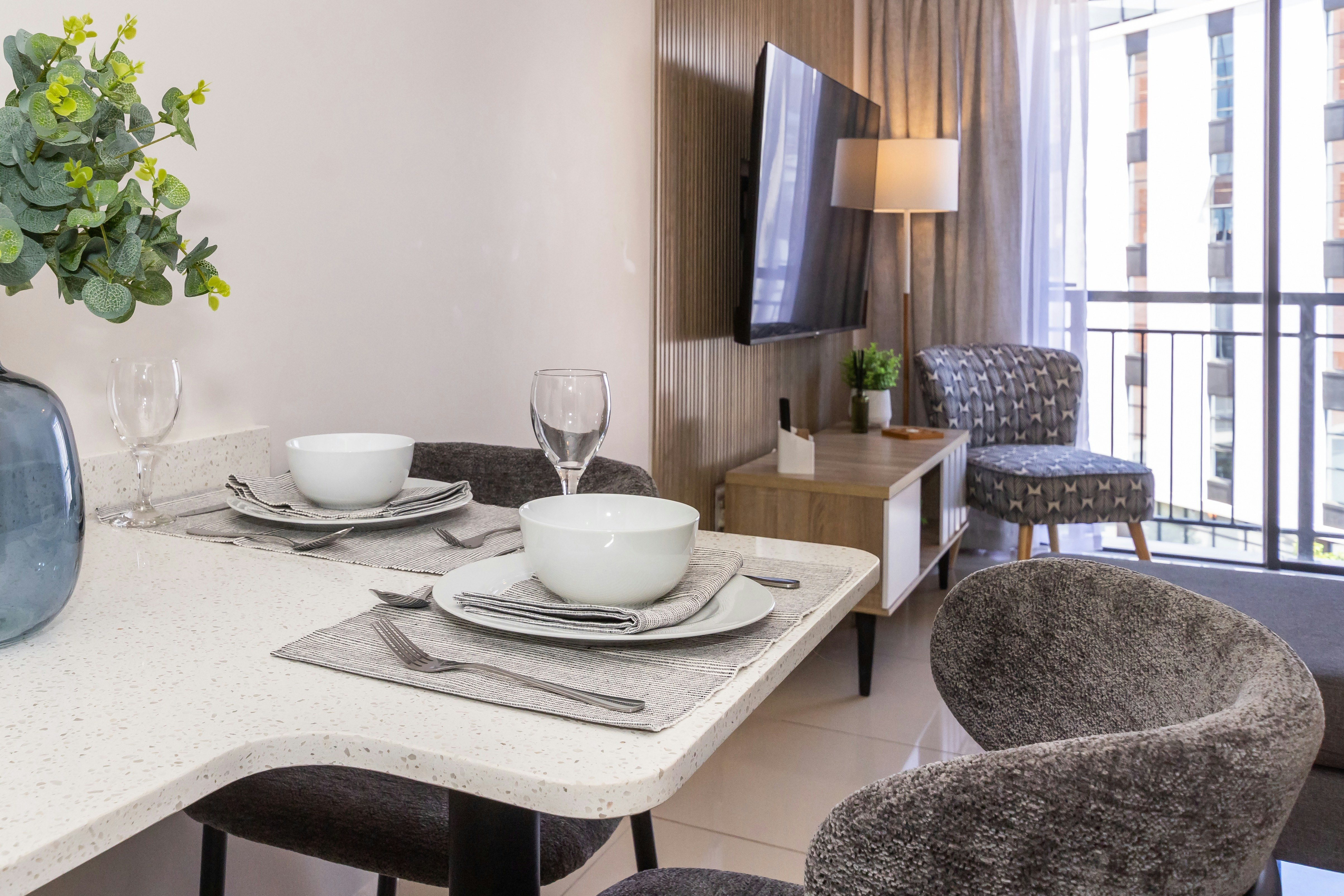 The open-plan living area offers a fully equipped kitchen with a stove, oven, cutlery, crockery, utensils, washing machine, kettle, microwave, fridge-freezer, and a breakfast counter or work space. The kitchen flows to the lounge area, furnished with comfortable seating, a TV with streaming options, DStv, and Wi-Fi for your entertainment.