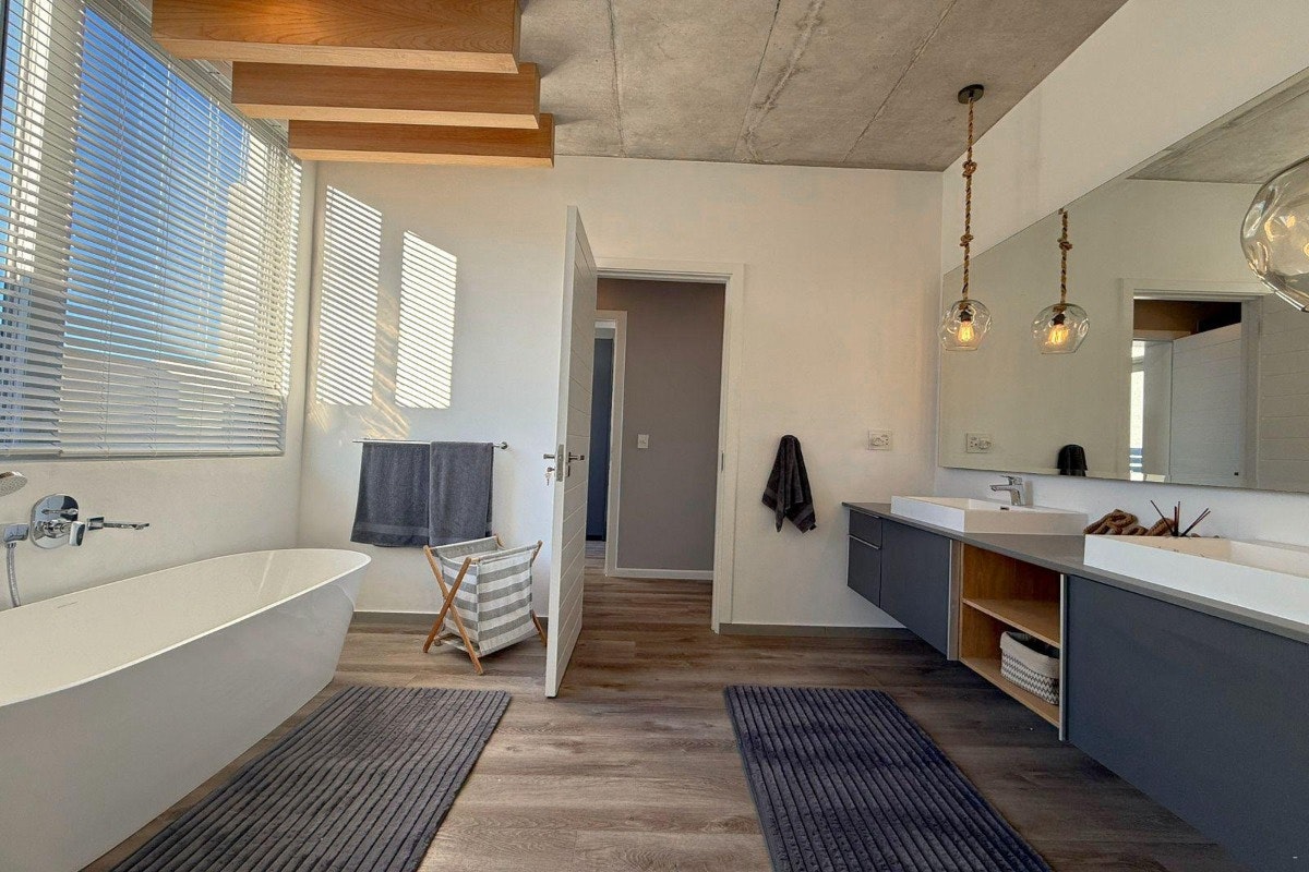 The living areas include a modern kitchen equipped with a fridge-freezer, gas stove, microwave, cutlery and crockery, tea- and coffee-making facilities, and a breakfast bar with stools. A dishwasher, washing machine, and tumble dryer are also available for added convenience. Adjacent to the kitchen is a dining area with an 8-seater dining table. The house offers two cosy lounges, each with comfortable couches and smart TVs with streaming services. Complimentary Wi-Fi is available throughout the house.