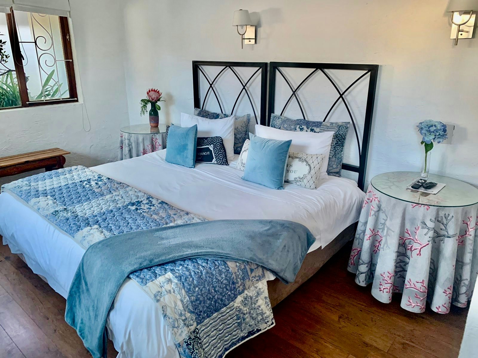 All rooms open out onto the lush garden with solar-heated, salt water pool. Each unique room offers an en-suite bathroom with bath, shower and heated towel rails, bar fridge, free broadband Wi-Fi internet access, Flat-screen television, tea and coffee facilities.