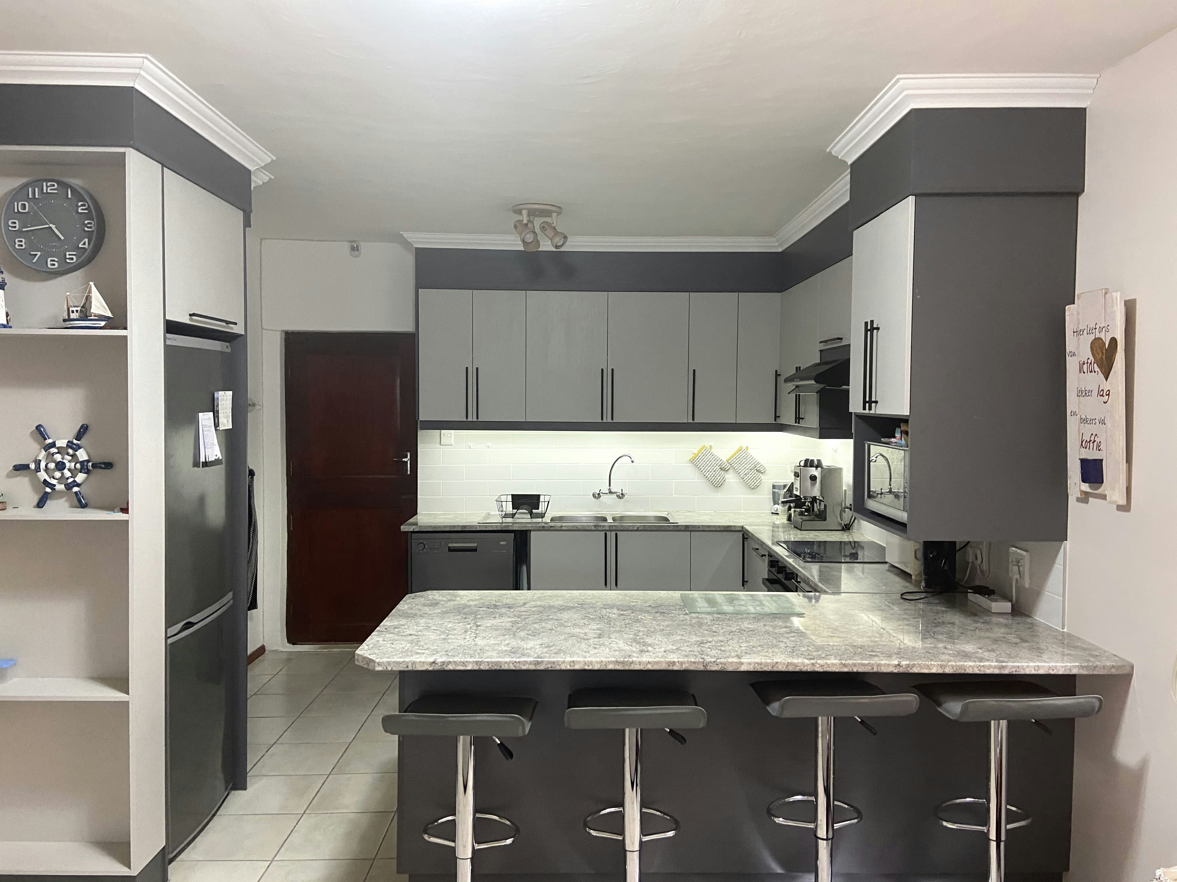The kitchen is fully equipped with a fridge-freezer, separate freezer, microwave, stove, oven, dishwasher, washing machine, and tumble dryer. The living area includes comfortable seating, a TV with DStv, and Wi-Fi. An alarm system is installed for added security.
