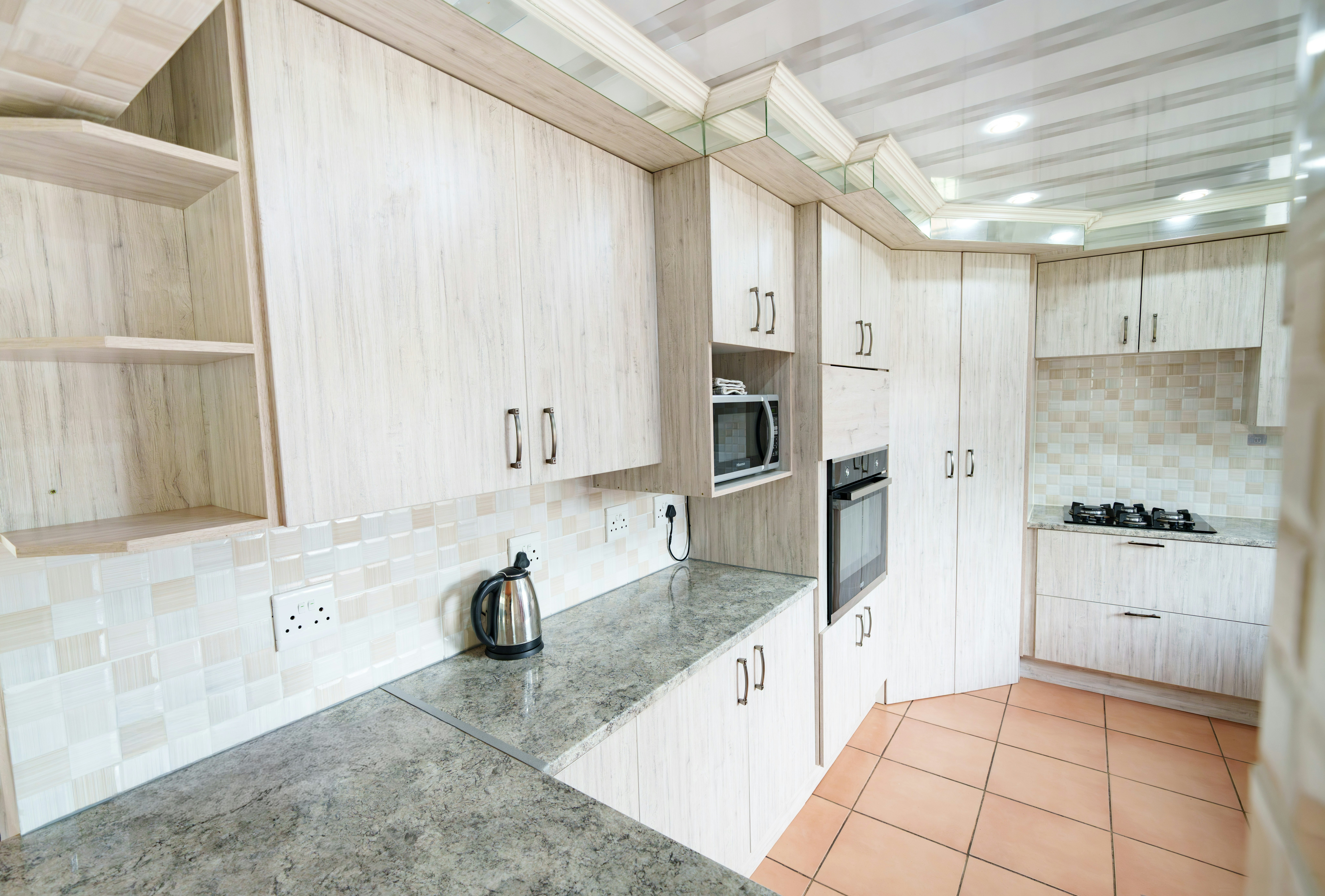 underroof outside kitchen, dish washing area and table top.