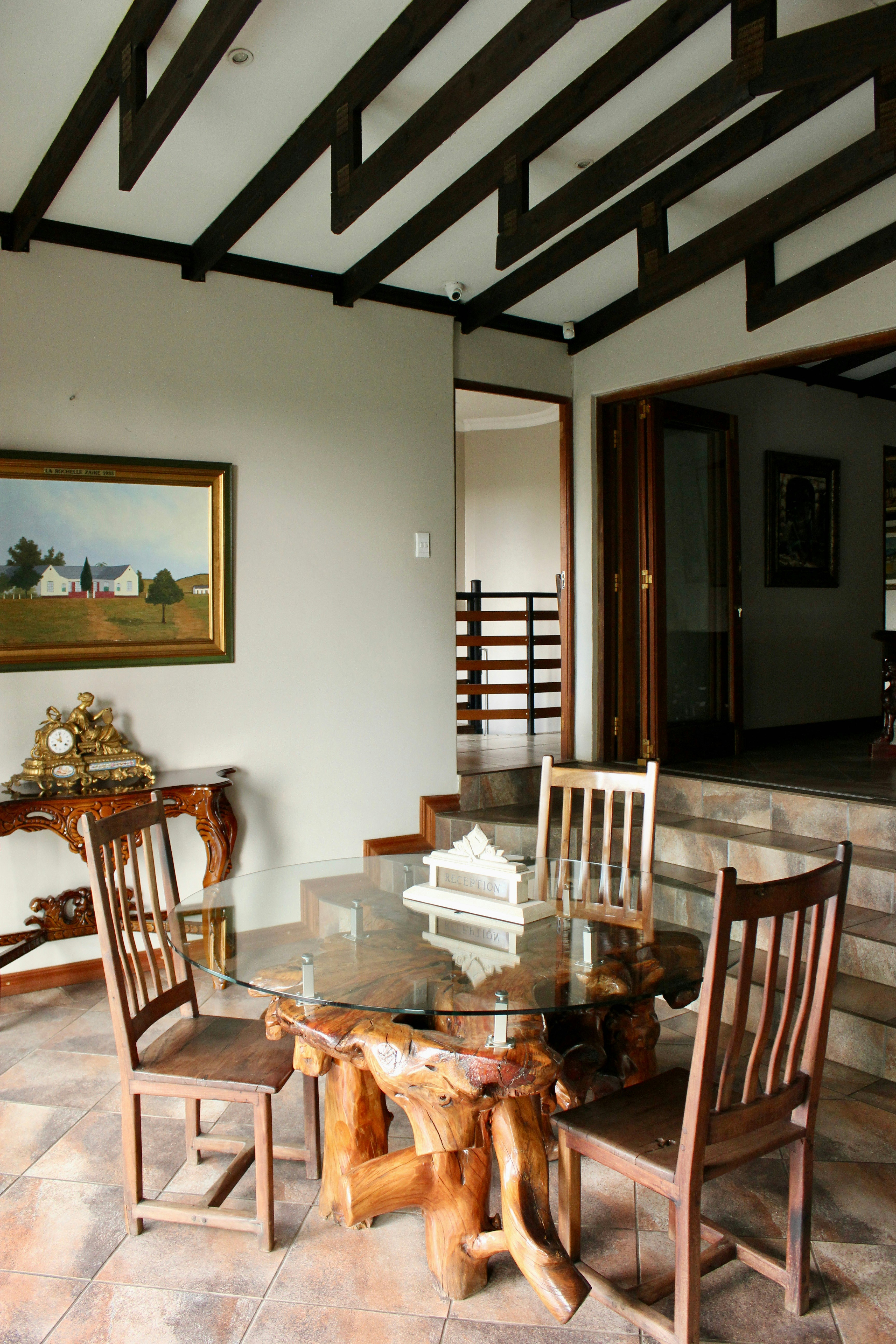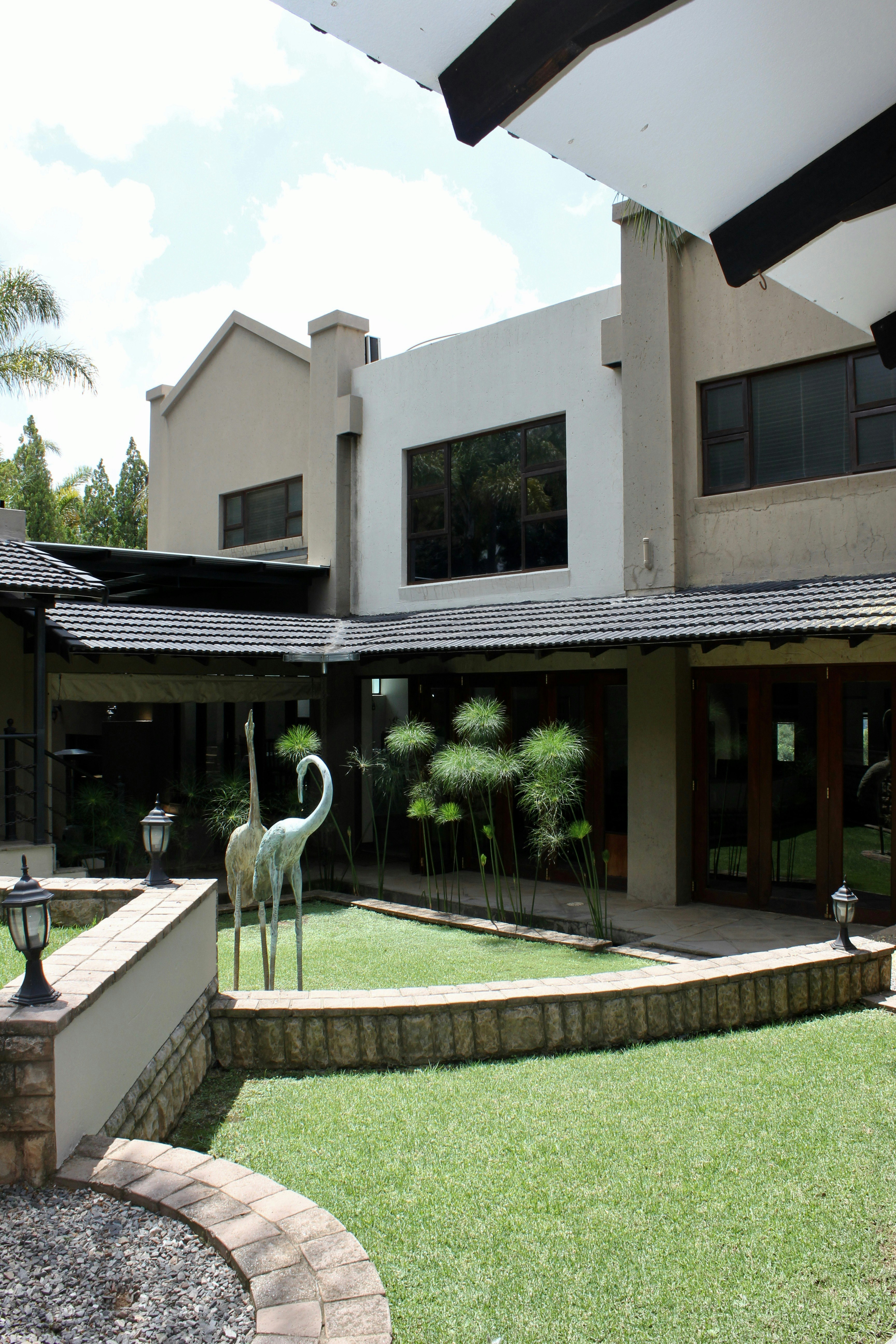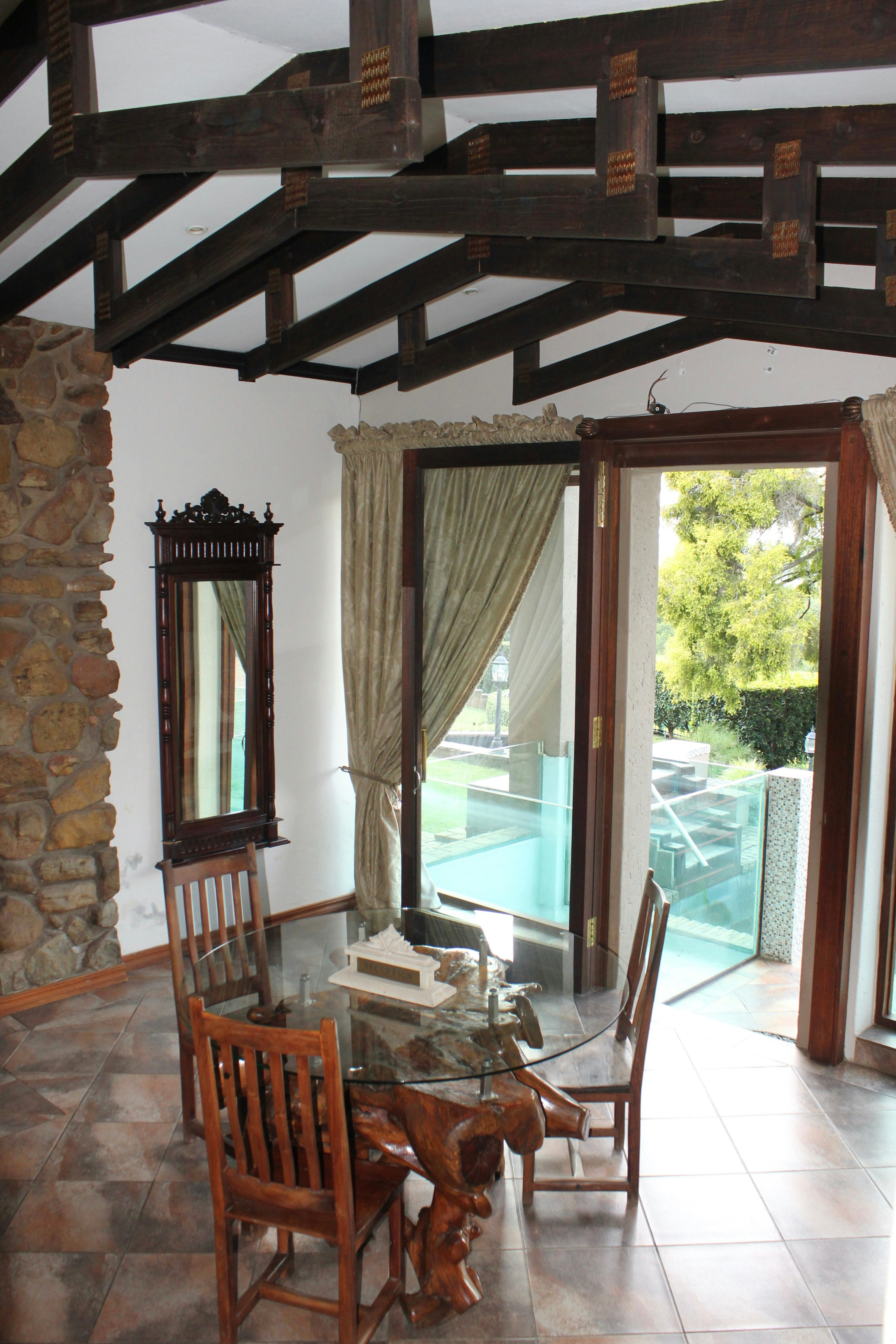 Guests can enjoy meals at an additional charge in the communal dining room, which offers ample seating for relaxed gatherings. The guesthouse also boasts a sparkling swimming pool with a partial glass floor and a bar built beneath the pool, a large Jacuzzi, and tranquil water features including a waterfall. A koi pond with swans and waterfowl adds to the serene atmosphere.