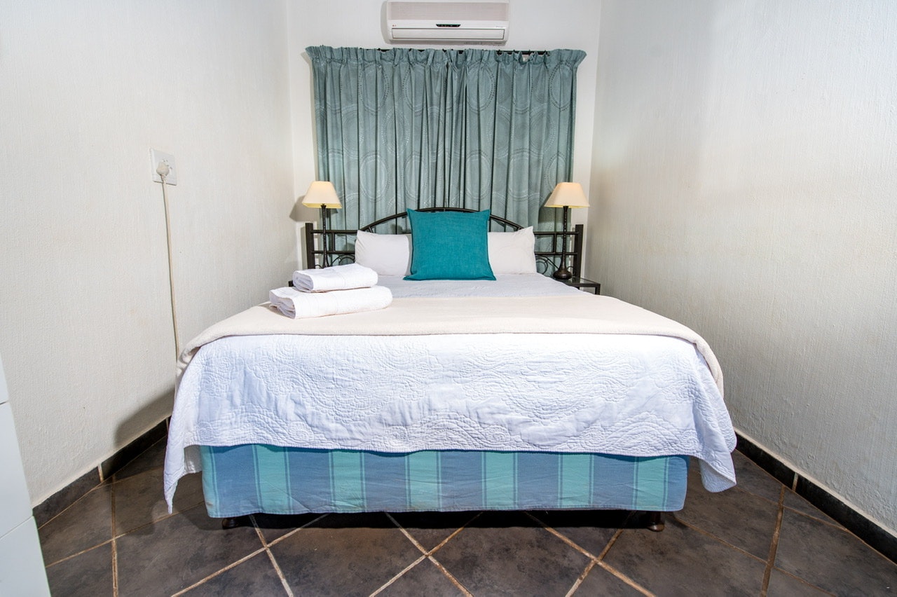 The Double En-suite rooms are furnished with double beds and en-suite bathrooms fitted with a shower, toilet and sink. There is also air conditioning, a fan, a TV with limited DStv channels, WiFi, a fridge-freezer, microwave oven, coffee and tea making facilities, crockery and cutlery.