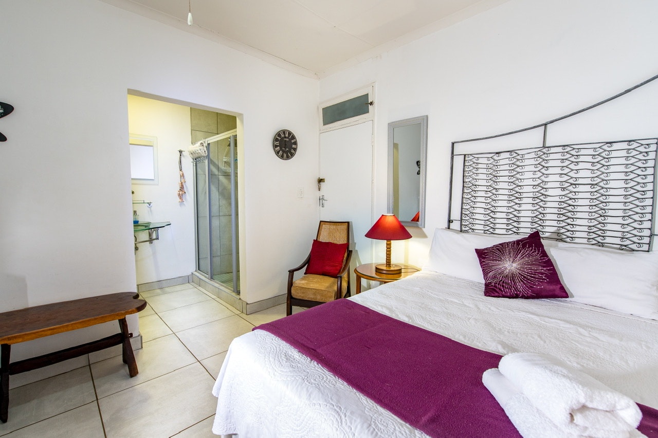 The studio apartment has a sleeping area with a double bed and an en-suite bathroom with a shower, toilet and sink. There is an open-plan living area with a single sofa bed and a kitchenette equipped with a fridge-freezer, microwave, 2-plate stove-oven, tea-and-coffee-making facilities, crockery and cutlery. The unit also has air conditioning, a fan, a TV with selected DStv channels, and Wi-Fi. Guests have access to a private entrance and a veranda.