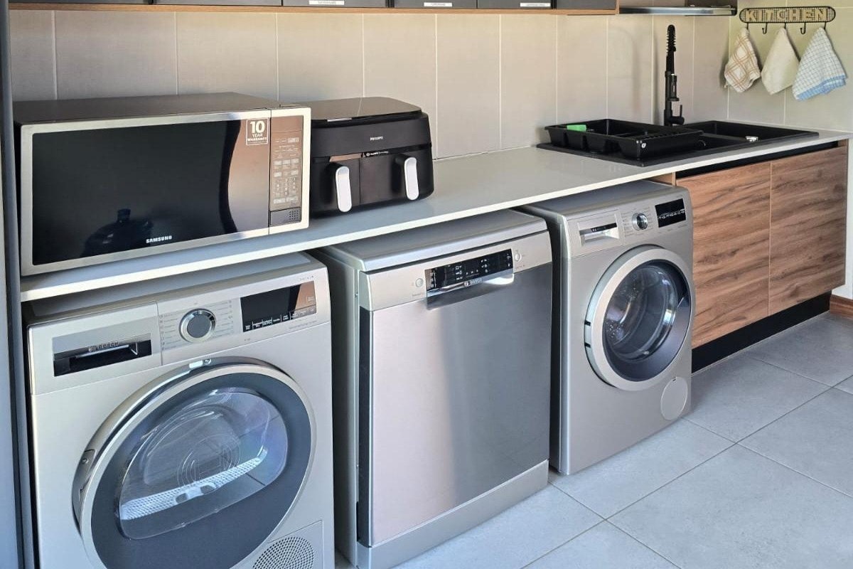 Die leefarea bied asemrowende panoramiese uitsigte en sluit 'n kombuis met 'n yskas-vrieskas, gasstoof, elektriese oond, mikrogolfoond, lugbraaier, eetgerei en breekware, tee- en koffiemaakgeriewe en 'n sentrale ontbyt-eiland met stoele in. Die aparte opwaskamer is toegerus met 'n skottelgoedwasser, wasmasjien en tuimeldroër vir ekstra gerief. Langs die kombuis beskik die sitkamer oor 'n etenstafel met sitplek vir 8, oorgenoeg gemaklike sitplek, 'n slim-TV met stromingsdienste, 'n volledige reeks DSTV-kanale en komplimentêre WiFi-toegang.