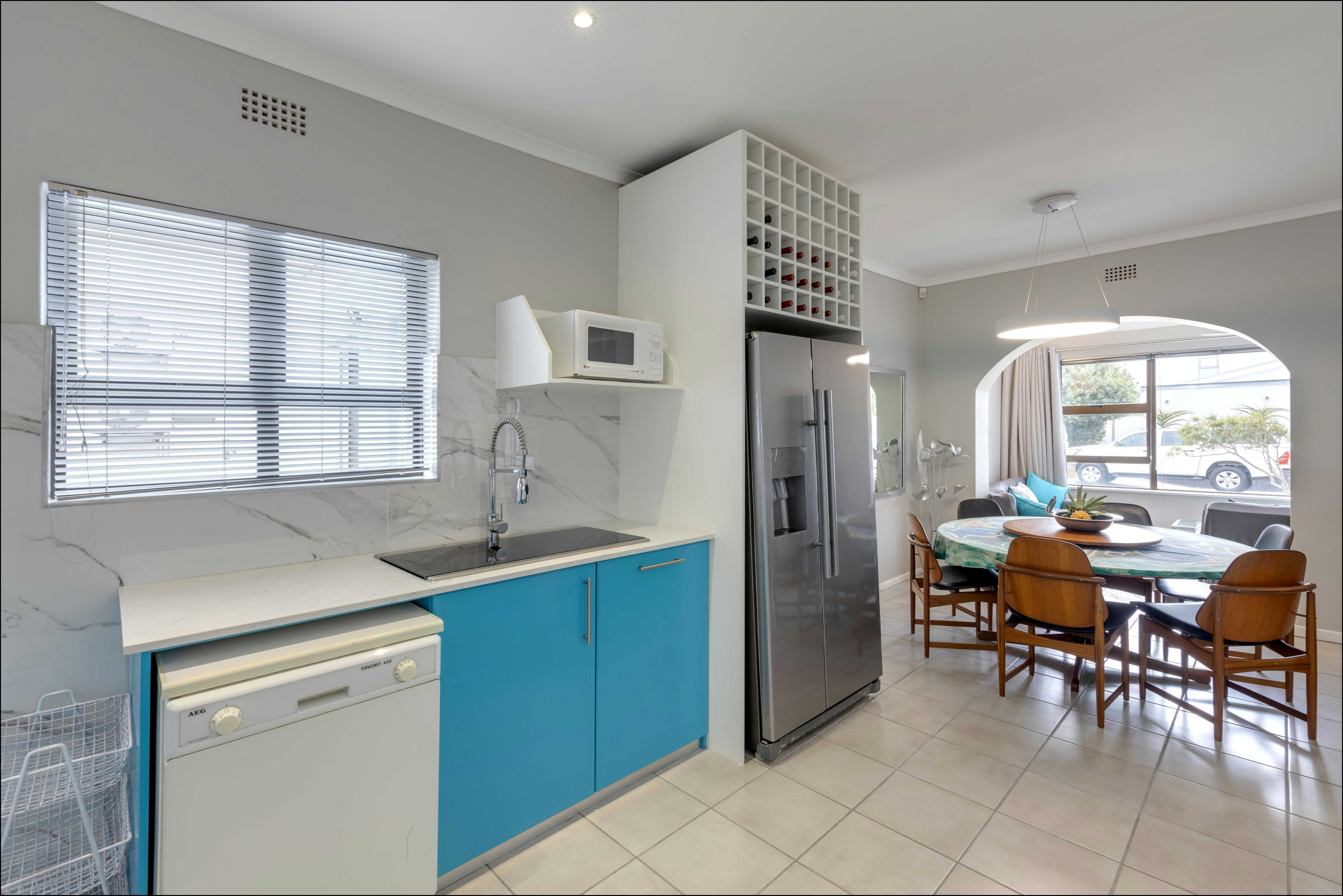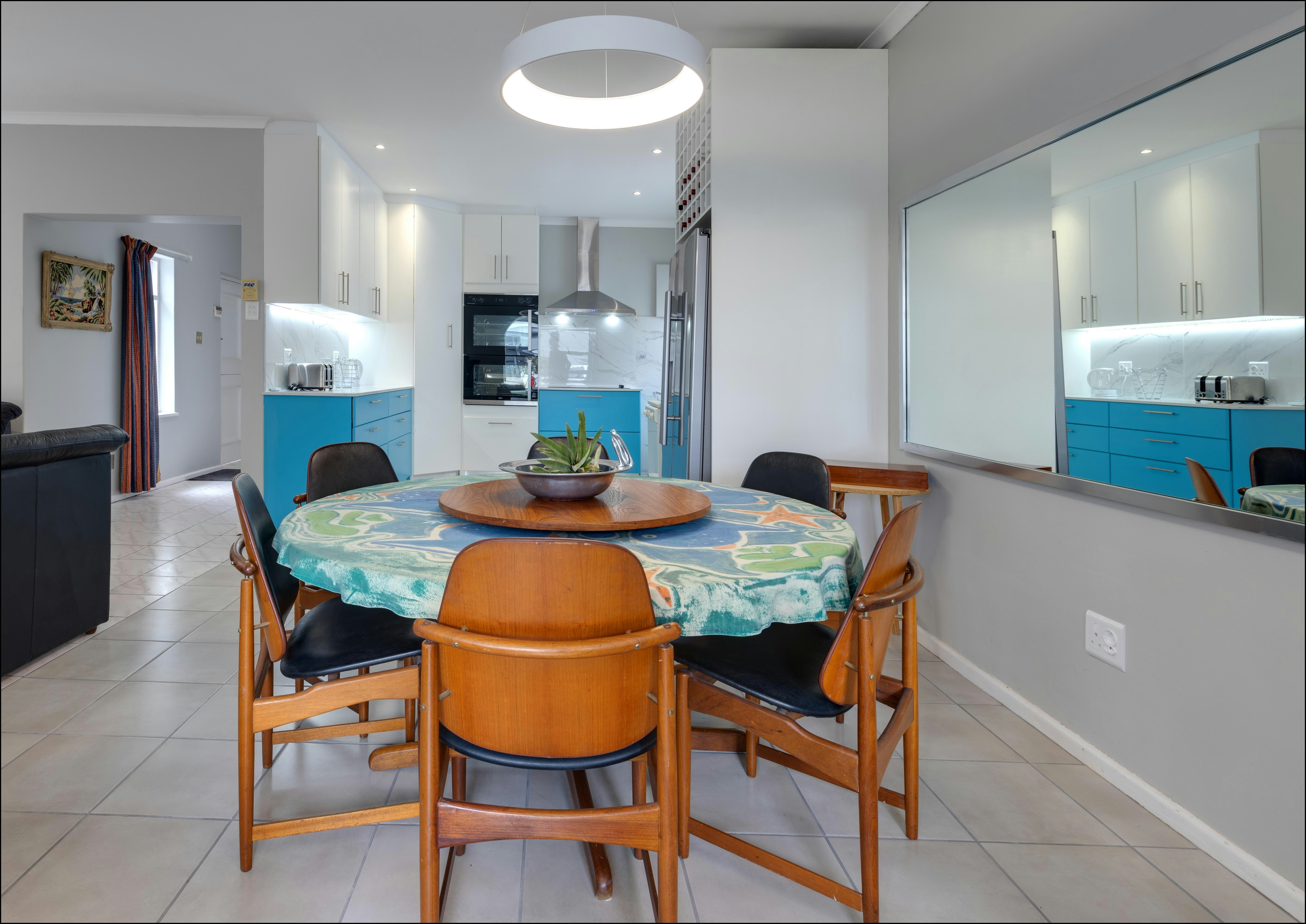 Die kombuis is toegerus met 'n yskas, stoof, oond, mikrogolfoond, eetgerei, breekware en tee- en koffiemaakgeriewe, en beskik oor 'n skottelgoedwasser, terwyl 'n wasmasjien ook beskikbaar is vir ekstra gerief. Dit strek tot by die eetarea en verder na die sitkamer gemeubileer met gemaklike sitplek, 'n TV en 'n knus kaggel.