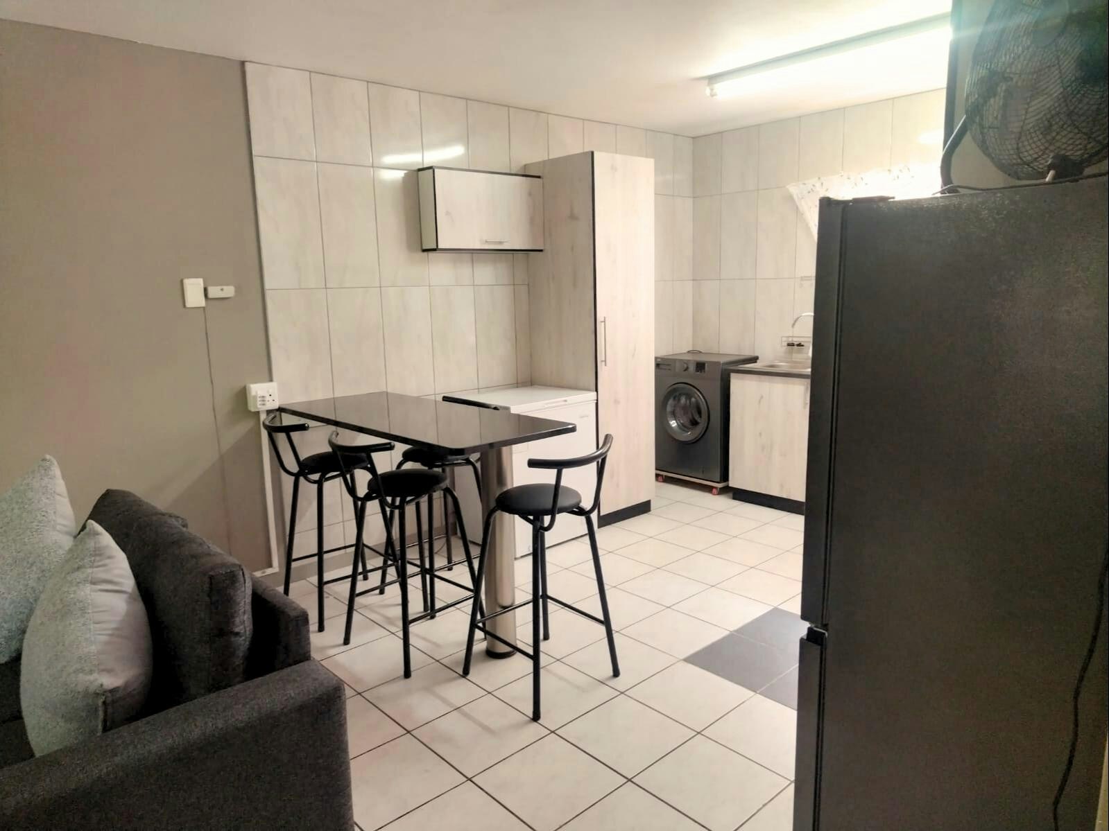 The kitchen is open-plan to the living area and is well-equipped with a fridge-freezer, microwave, oven, gas stove, air fryer, washing machine, cutlery, crockery, and tea- and coffee-making facilities. The living area includes a dining table, a TV with DStv, and comfortable couches.