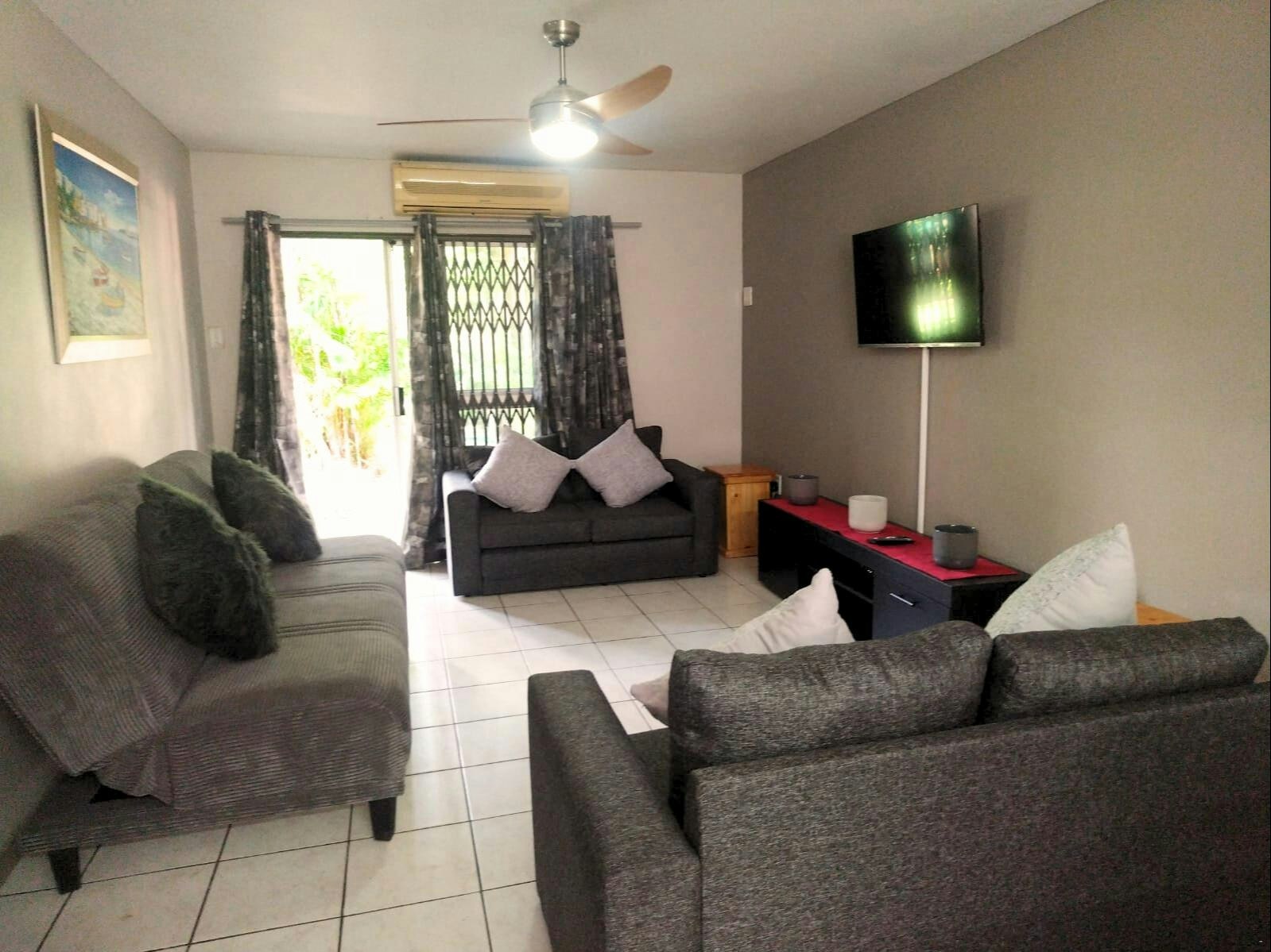 The apartment consists of 2 bedrooms and a shared bathroom, which can comfortably accommodate up to 5 guests. The main bedroom is furnished with a queen bed, while the second bedroom is furnished with 2 single beds. The bathroom is fitted with a shower, toilet, and washbasin. The fifth guest can be accommodated on the double sleeper couch in the lounge.