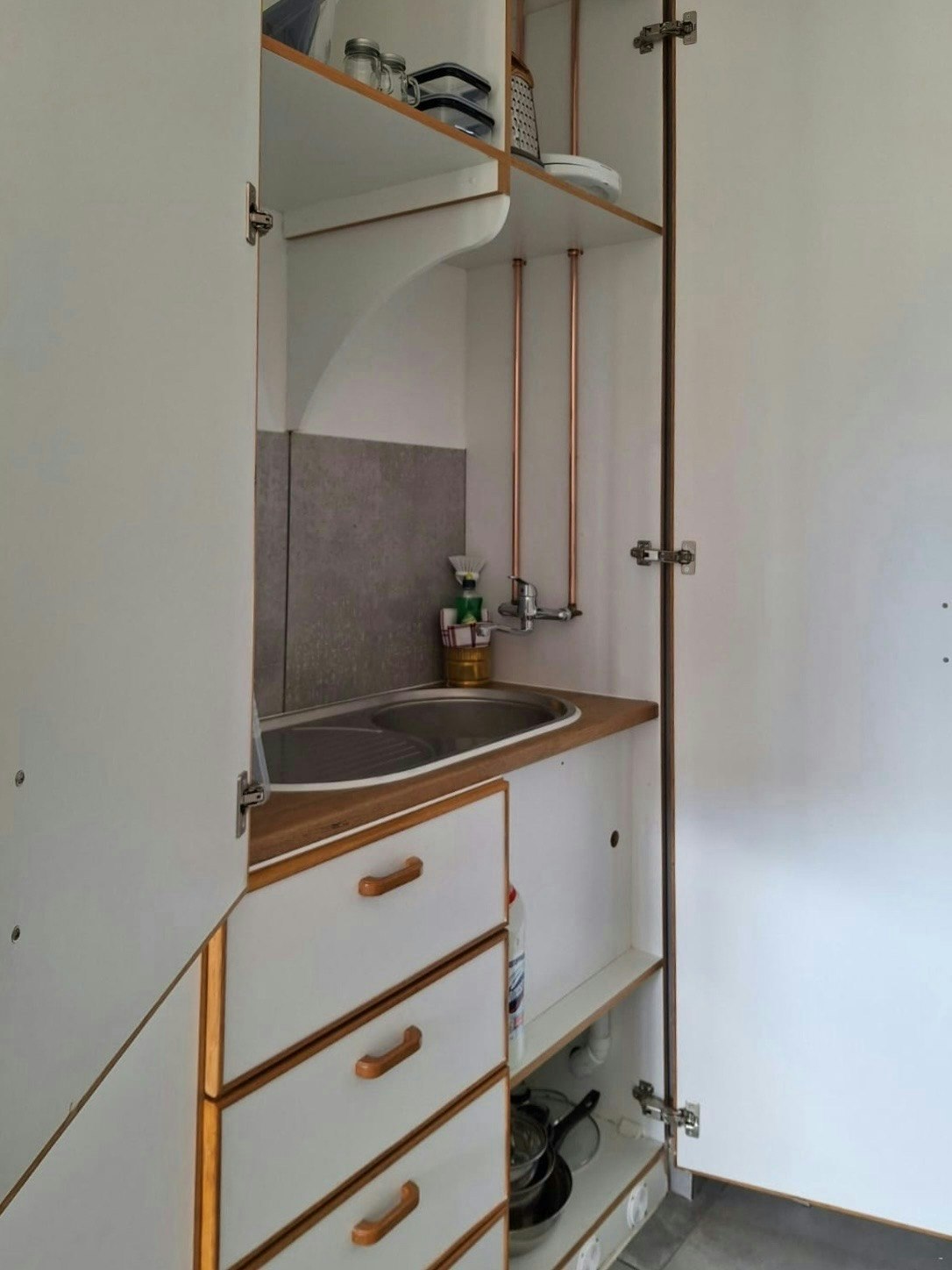 The Hartenbos 1 unit comprises an open-plan kitchen, living area, and sleeping area. There is no separate bedroom, and the unit can accommodate up to 2 guests on a double bed and 2 single beds. The unit is sufficient for 2 adults and 2 children. There is a full, separate bathroom fitted with a bath and a shower. Please note that we do not provide towels, so guests have to bring their own bath and swimming towels along.
