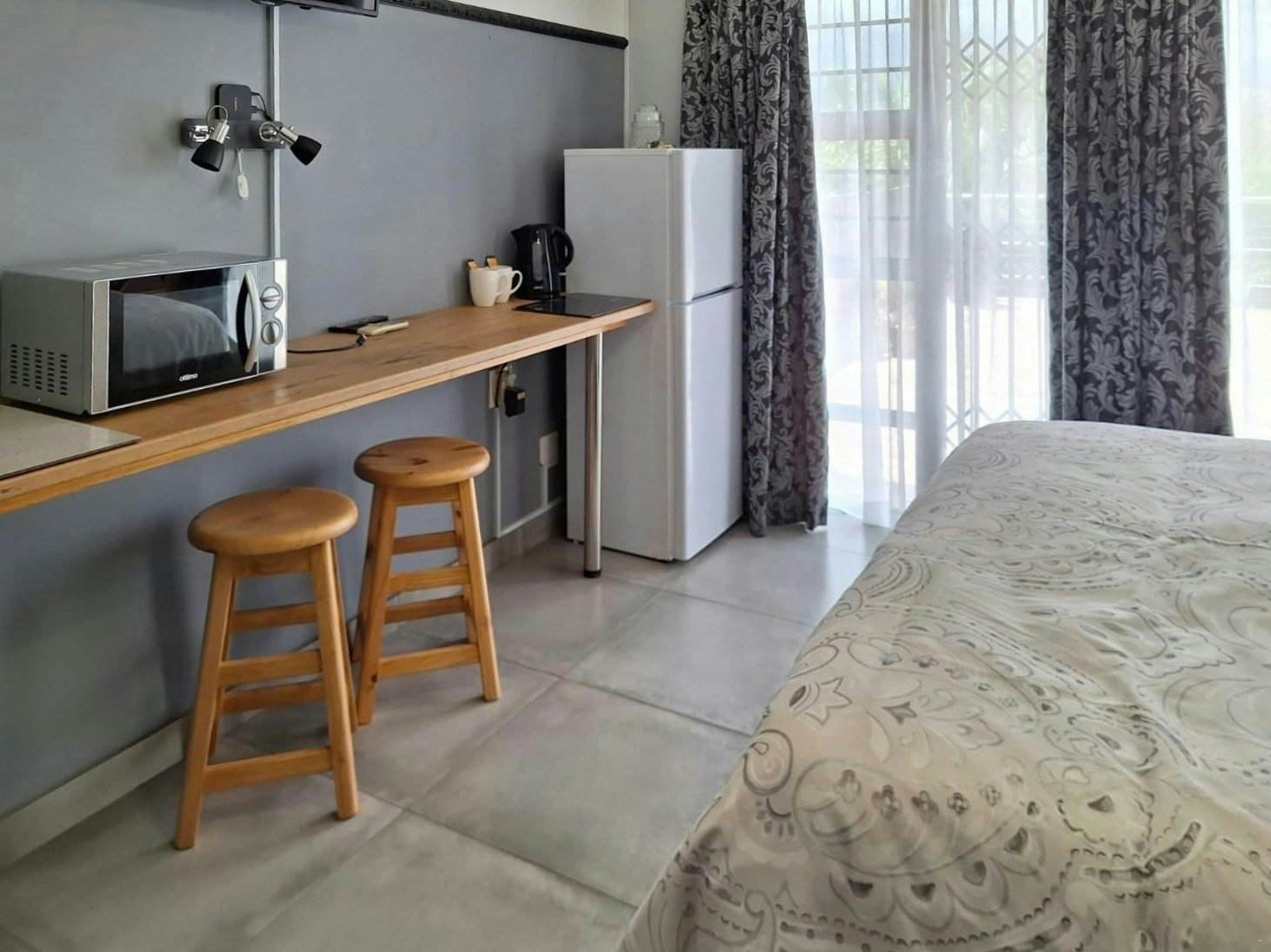 The Hartenbos 2 unit comprises a sleeping area, bathroom, lounge area, and kitchenette. There is no separate bedroom, and the unit can accommodate up to 2 guests on a queen-size bed. The unit is suitable for 2 adults. There is a separate bathroom fitted with a shower. Please note that guests are required to bring their own swimming towels.