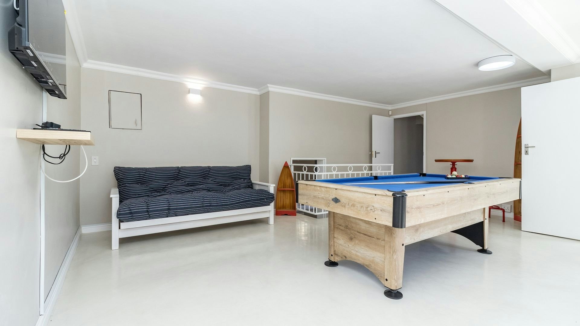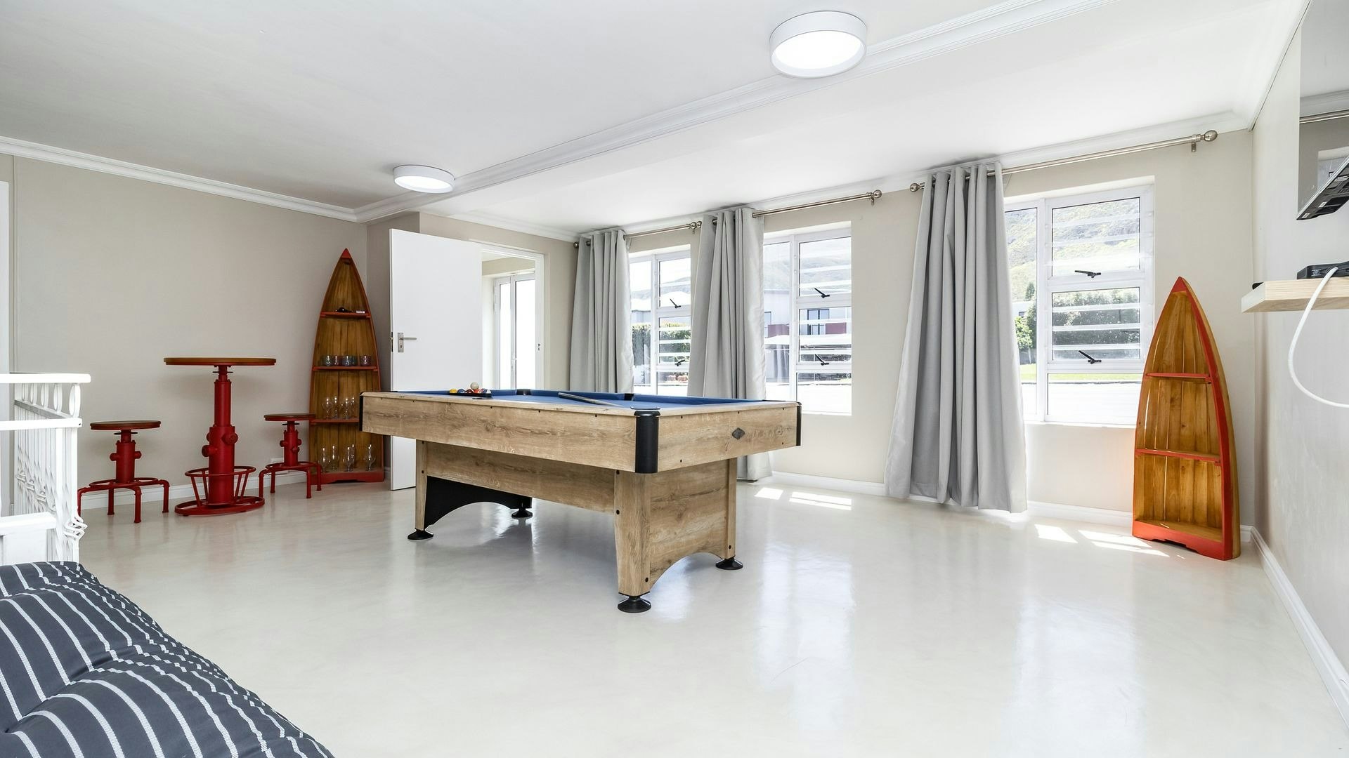 The kitchen is equipped with a fridge-freezer, stove, oven, microwave, cutlery, crockery, and tea- and coffee-making facilities, and includes a lovely dining set for shared meals. It flows into the lounge, which is furnished with comfortable seating and a TV. An indoor braai area adds to the convenience. The entertainment area features a pool table to keep guests engaged and offers a welcoming space for spending quality time together.