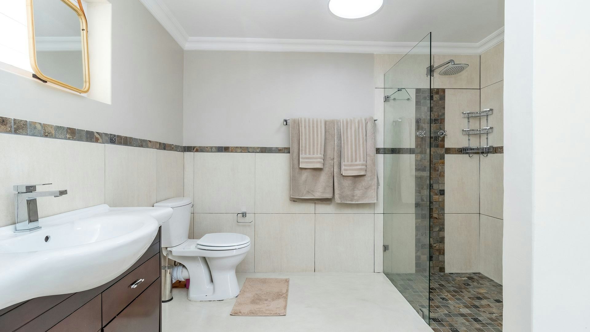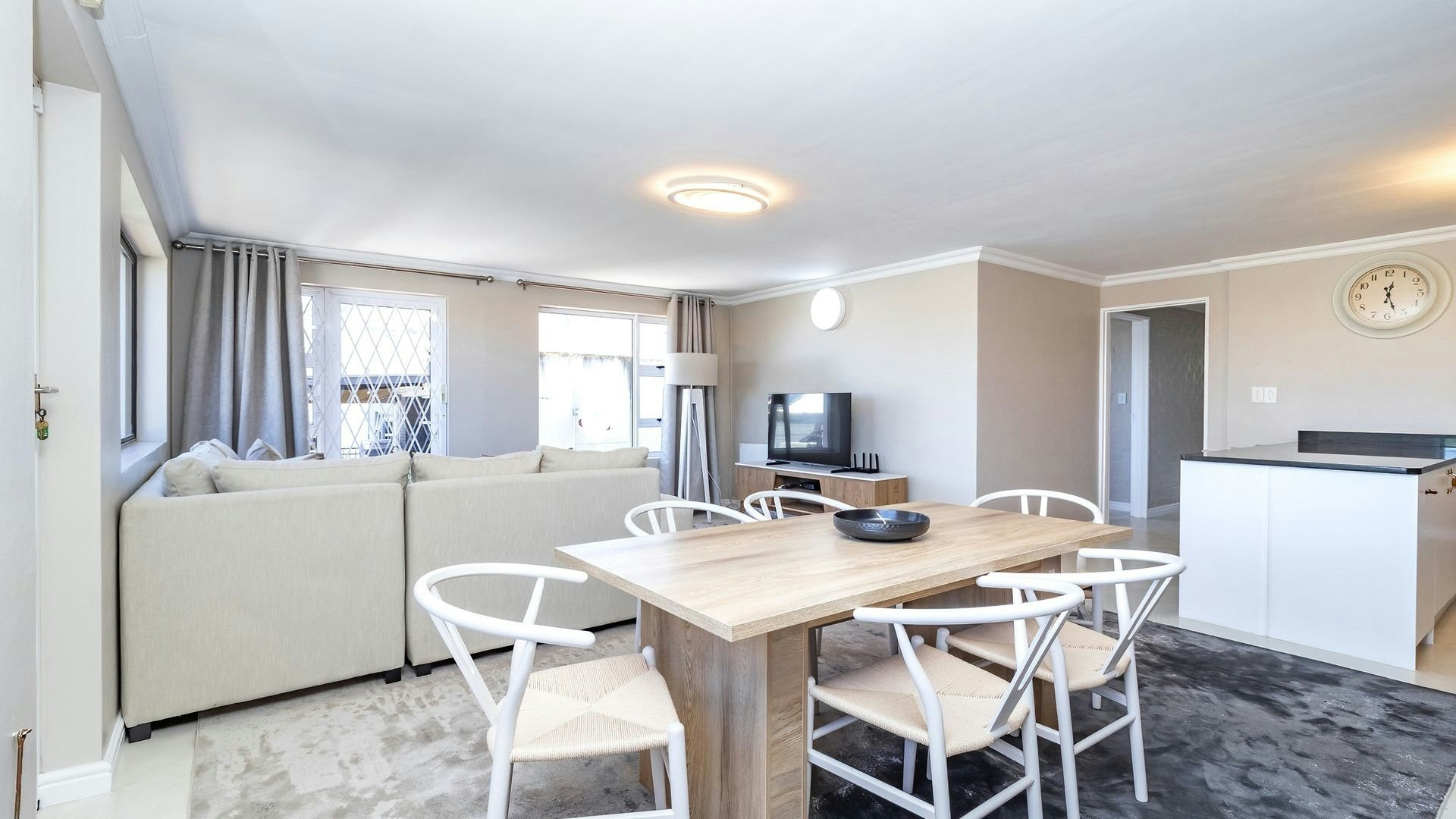 The home can comfortably accommodate up to 10 guests, making it perfect for extended families or 2 families sharing. Upstairs, there are 3 bedrooms and 2 bathrooms. The main bedroom is furnished with a queen-size bed and has an en-suite shower, basin, and toilet. The second bedroom has a double bed, while the third has a bunk bed. They share a bathroom fitted with a bath, shower, basin, and toilet. Downstairs, the fourth bedroom has a queen-size bed with an en-suite shower, while the fifth bedroom has a double bed with a separate bathroom fitted with a bath, shower, basin, and toilet. There is also a separate guest toilet. Linen and towels are provided.