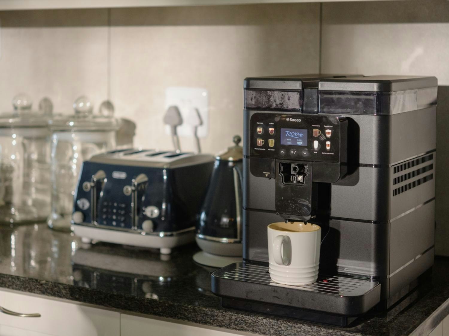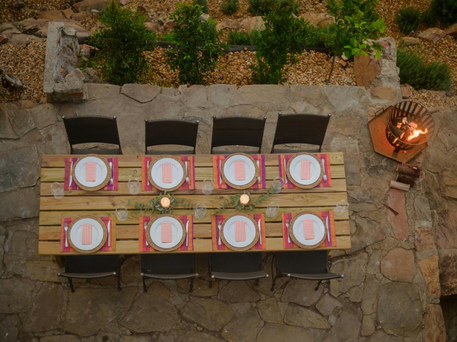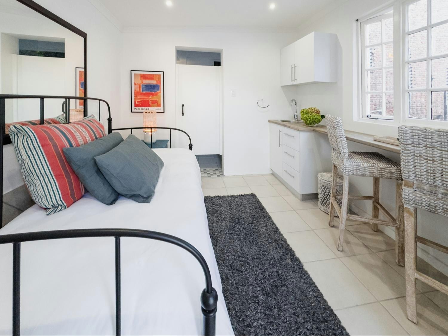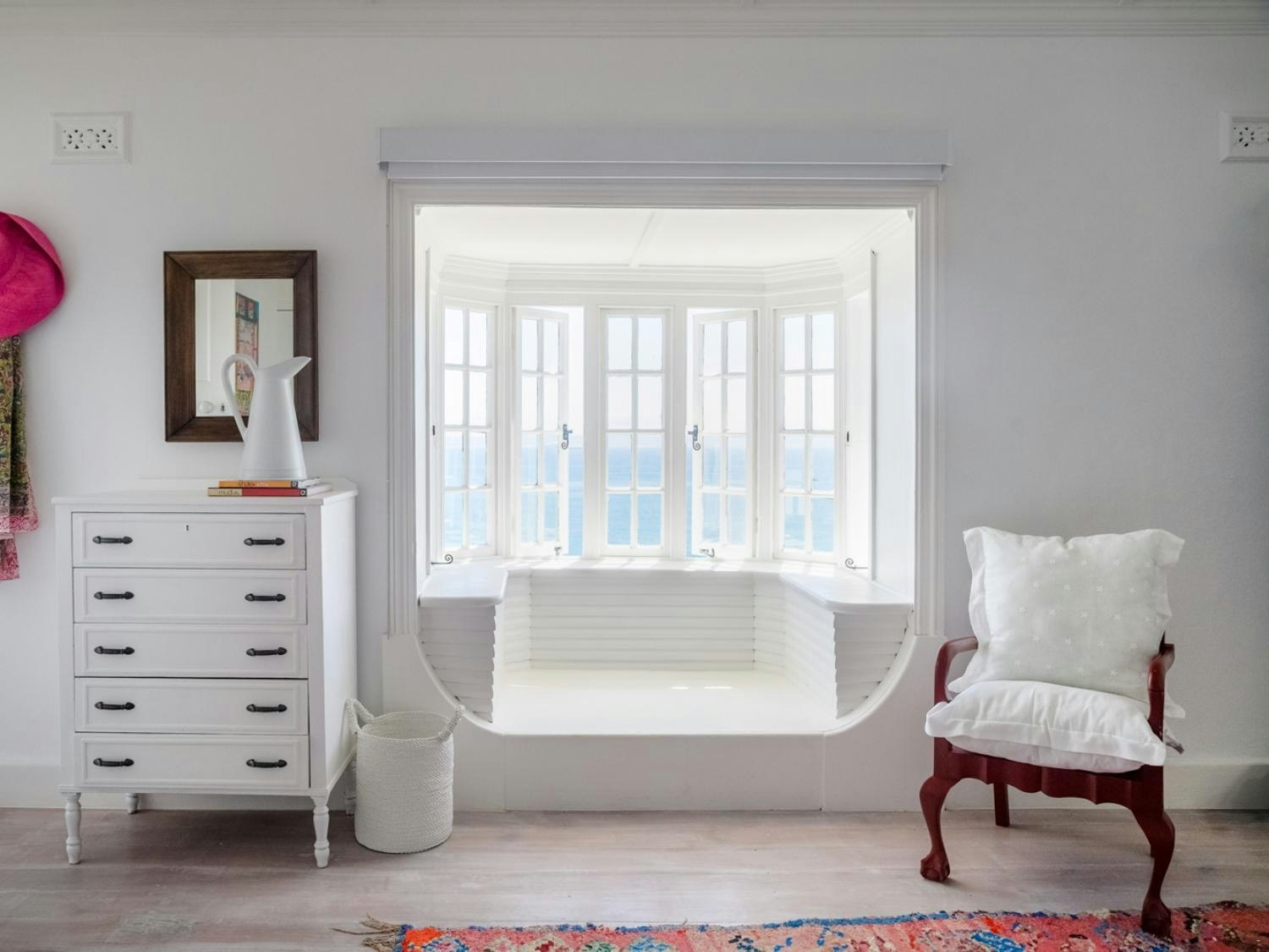 The open-plan living area boasts expansive windows offering a 180-degree view of the harbour and ocean, along with plush seating, a TV with DStv channels, and dining tables. The well-equipped kitchen includes a fridge-freezer, oven, microwave, and coffee- and tea-making facilities. An additional dining and lounge area features a built-in combustion fireplace and leads out to another outdoor space with braai facilities and alfresco dining. The property is fully secured with an electrical fence and 24-hour armed response, complemented by an alarm system. Solar panels and inverters ensure uninterrupted power supply.