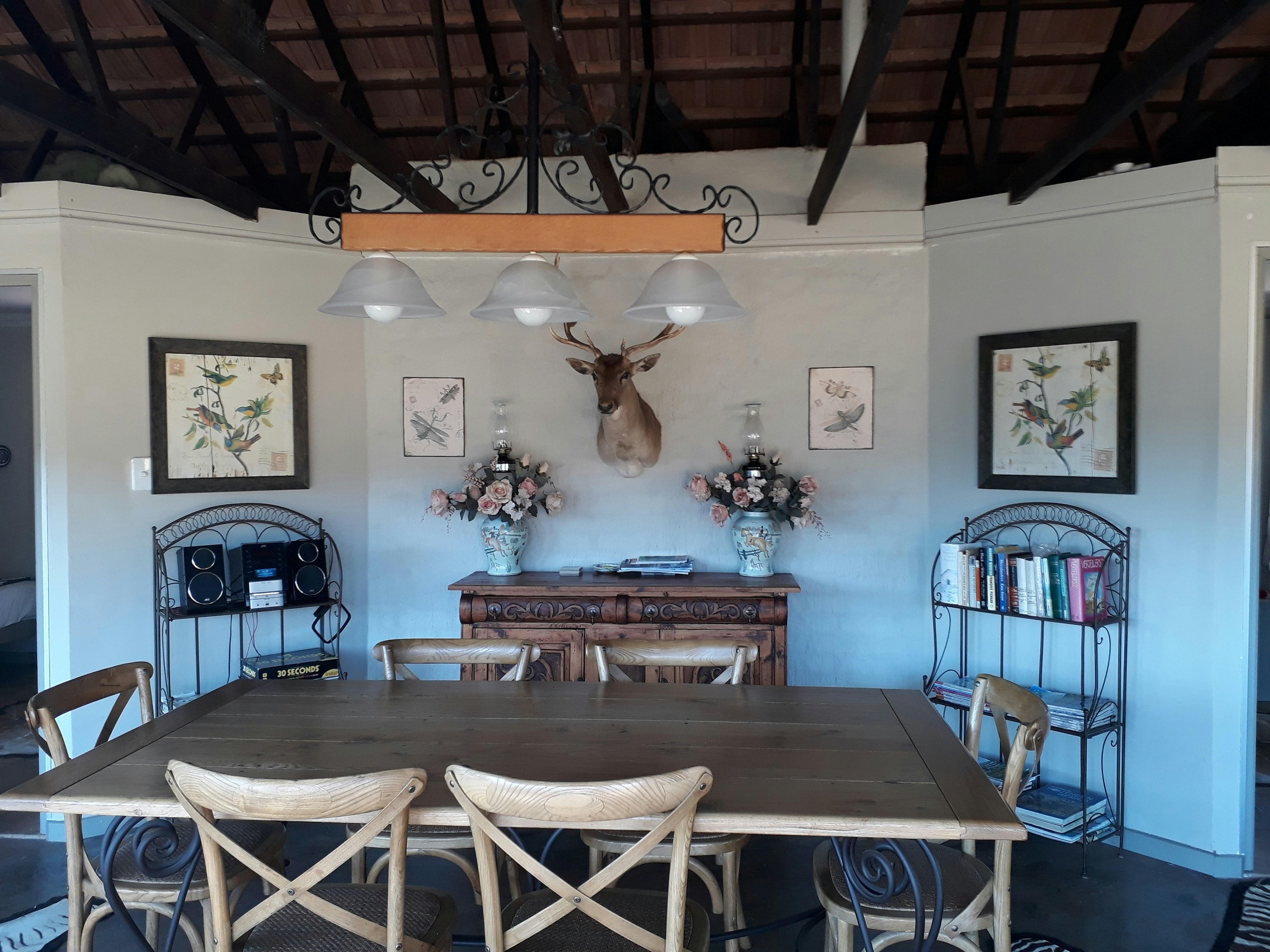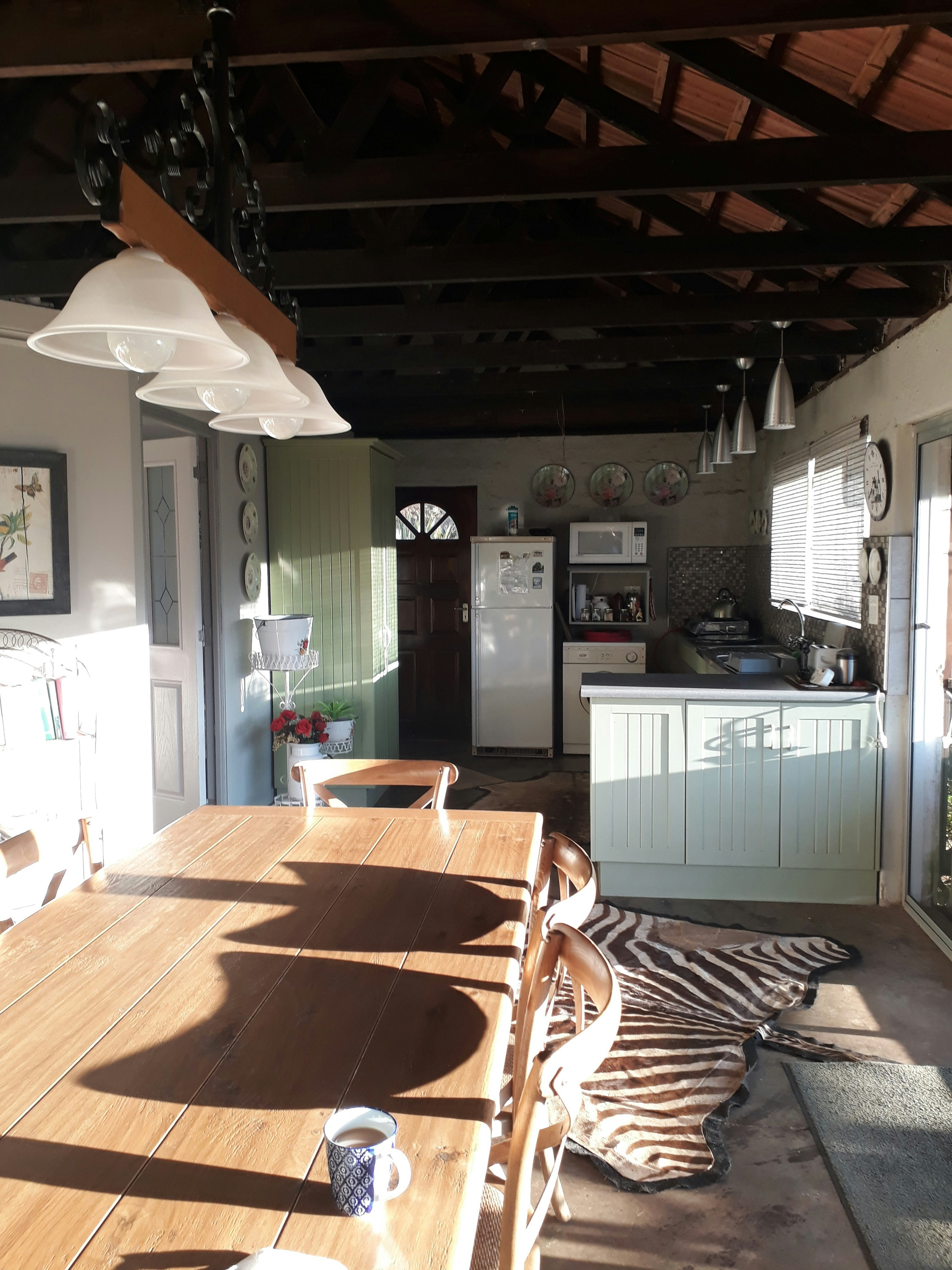 Leading from the kitchen is a 6-seater dining table where guests can enjoy their meals together. Through the sliding doors, there is a wooden deck with outdoor seating where guests can relax with a sundowner and completely admire the beautiful surrounding views.