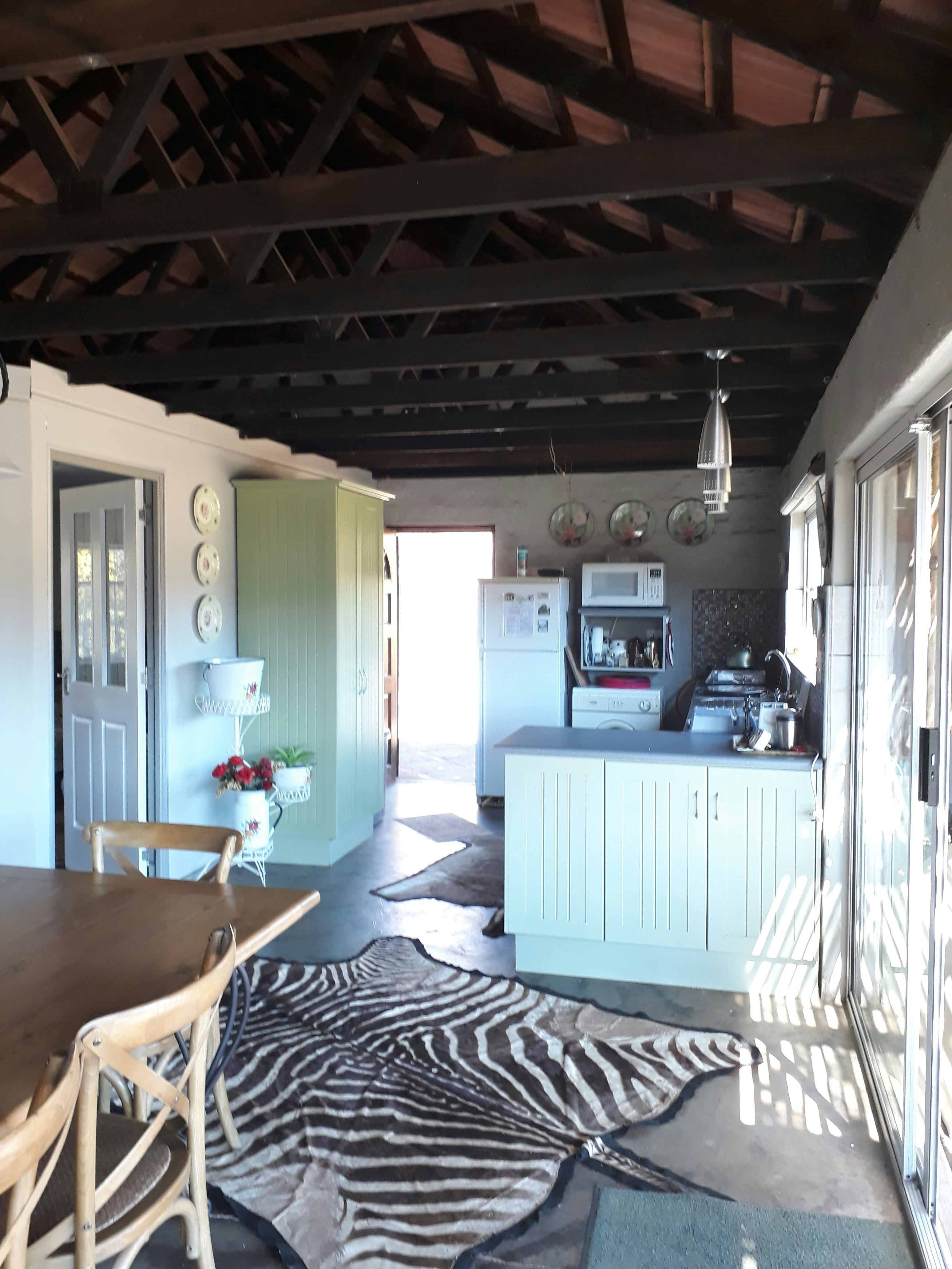 The main living area features an open-plan design with a kitchen, dining space and cosy lounge area with a large indoor braai. The kitchen is equipped with a 2-plate gas stove, microwave, fridge-freezer, cutlery and crockery as well as tea- and coffee-making facilities.