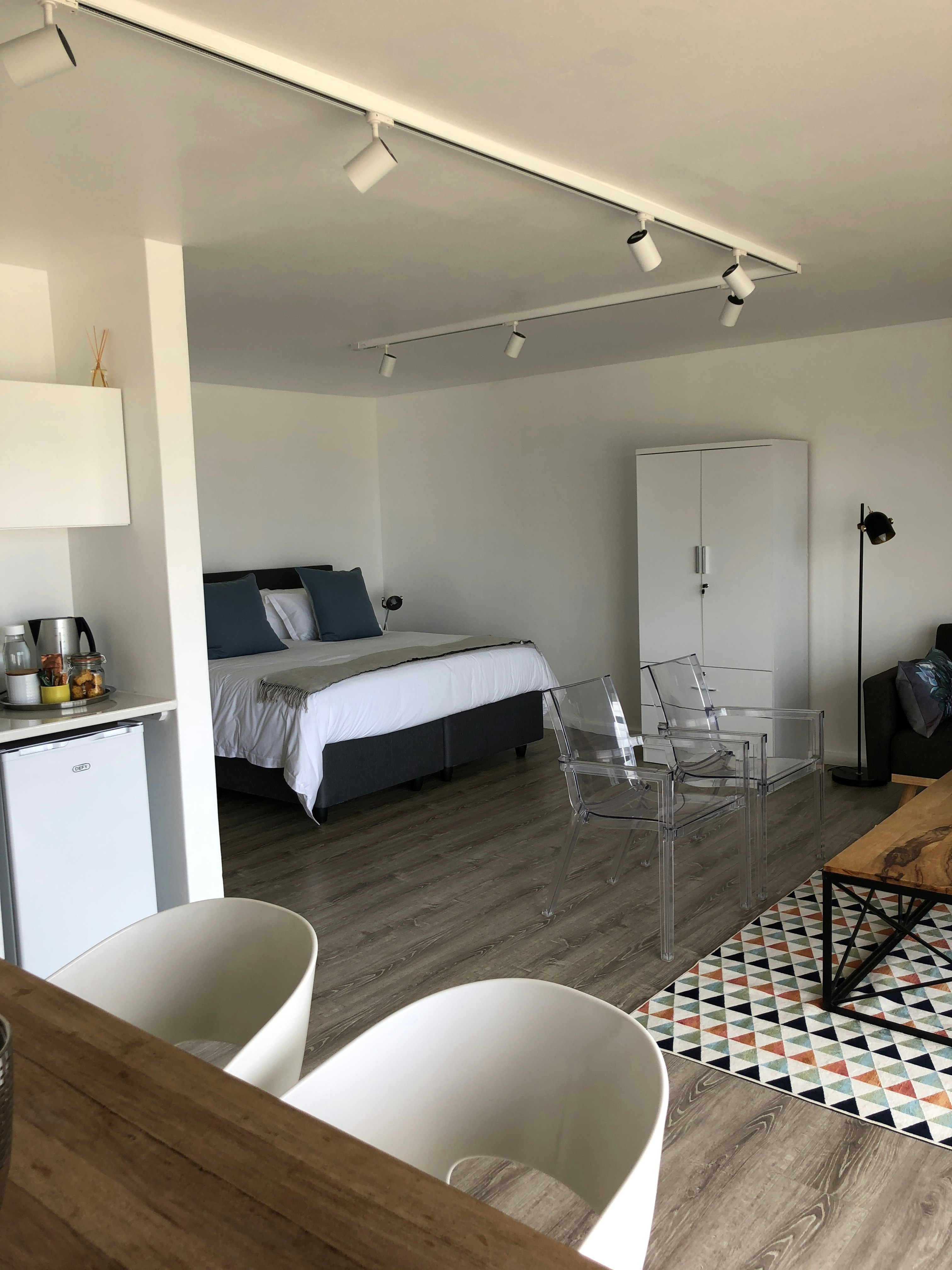 Dié oopplan-suite het 'n koninggrootte-bed en 'n en suite-badkamer met 'n stort. Die kombuisie is met 'n mikrogolfoond, broodrooster, yskassie, stoofplaat en 'n ketel toegerus. Ander geriewe sluit 'n TV met sekere DStv-kanale, 'n etenstafel met sitplek vir 4, gehalte-linne en -handdoeke, gratis WiFi en 'n privaat patio in.