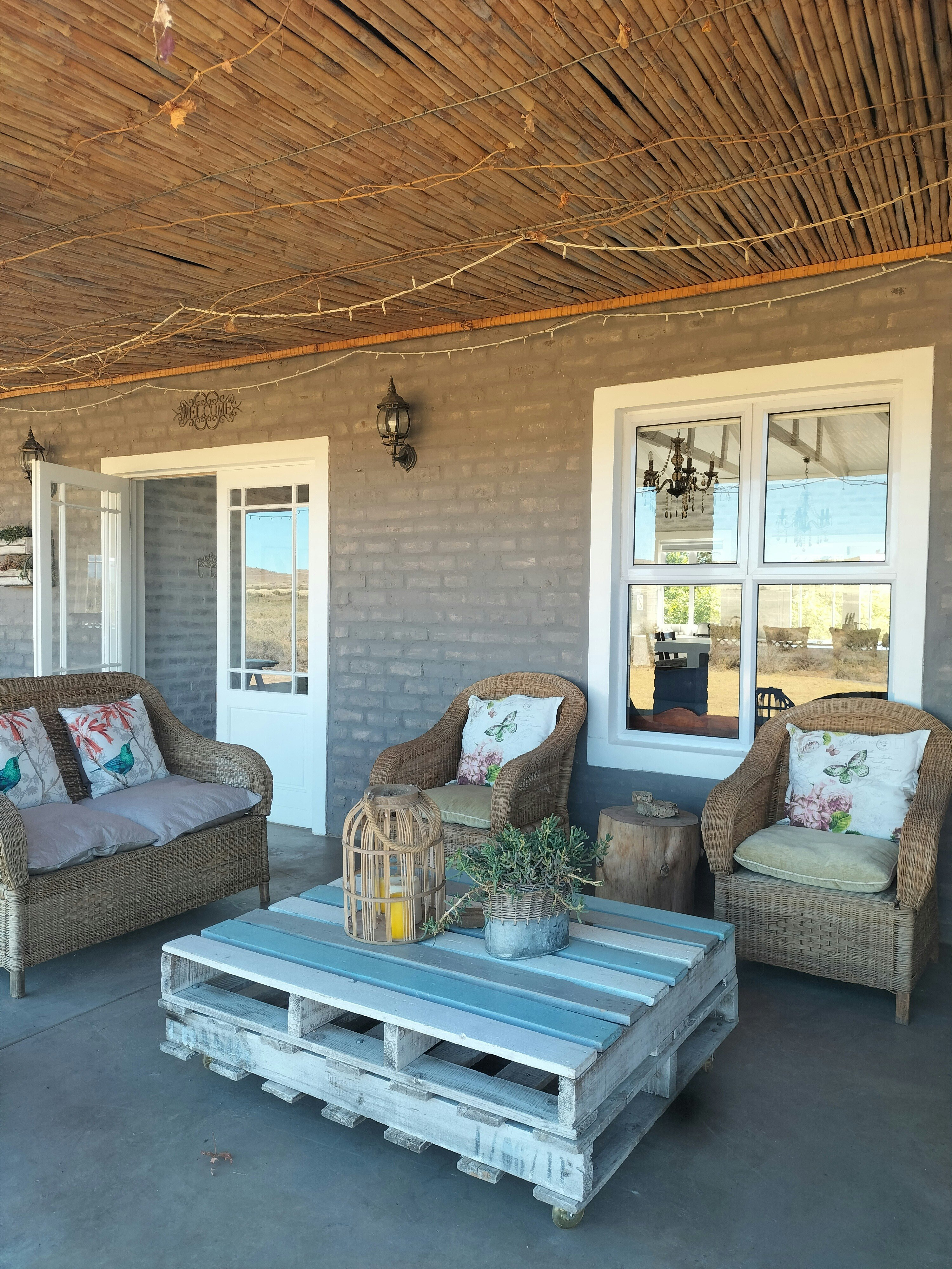 Die kothuis het 'n pragtige stoep met braaigeriewe en 'n Dover-stofie en 'n uitsig oor die Karoo se vlaktes kan van die stoep af geniet word.