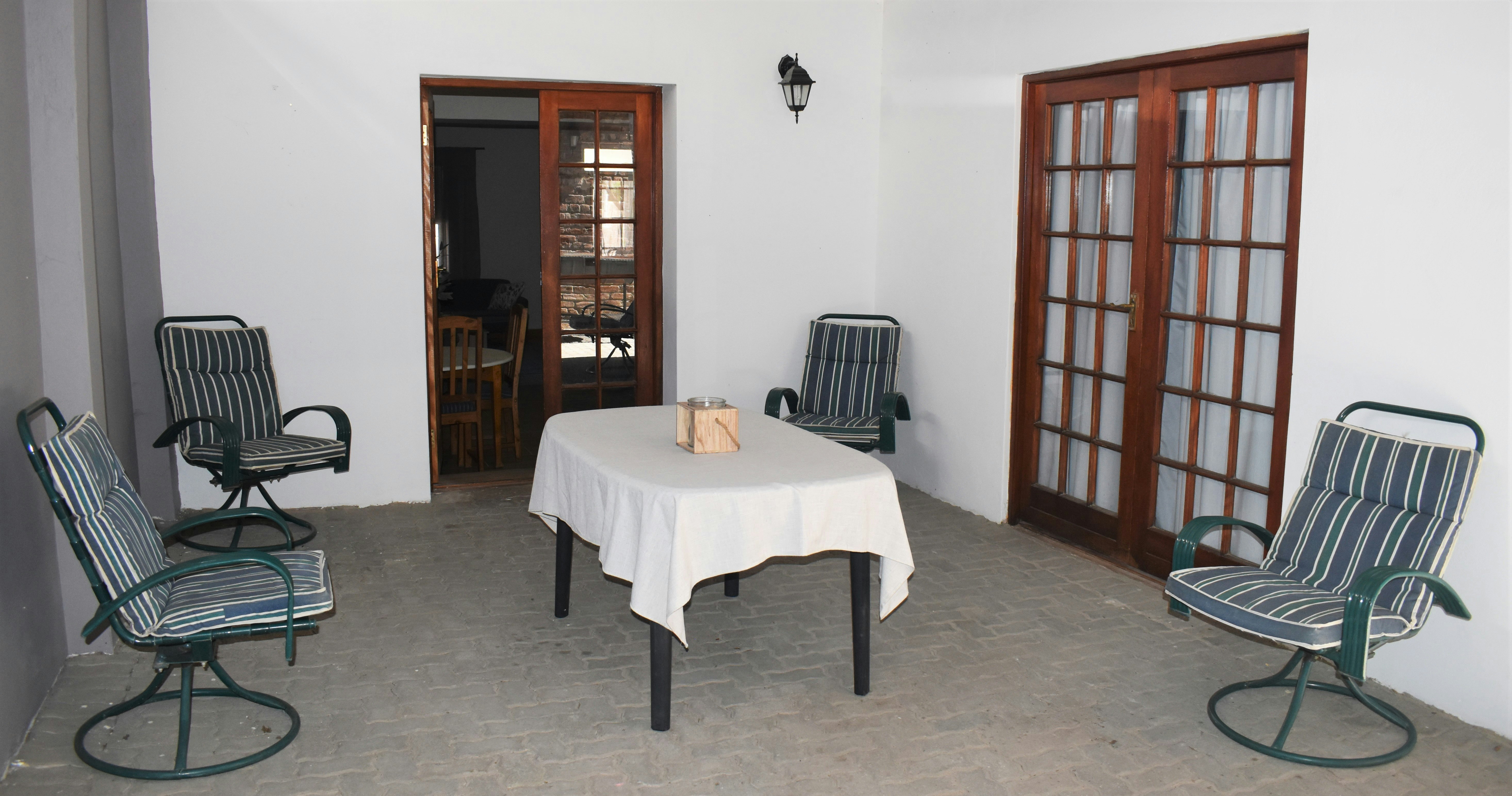 Die eetarea lei na die onderdakstoep met 'n tafel, stoele en 'n draagbare braai. Die huis het nie 'n tuin nie en die parkeerplek is voor die huis op straat. Daar is ‘n stoeplig wat op die straat skyn.