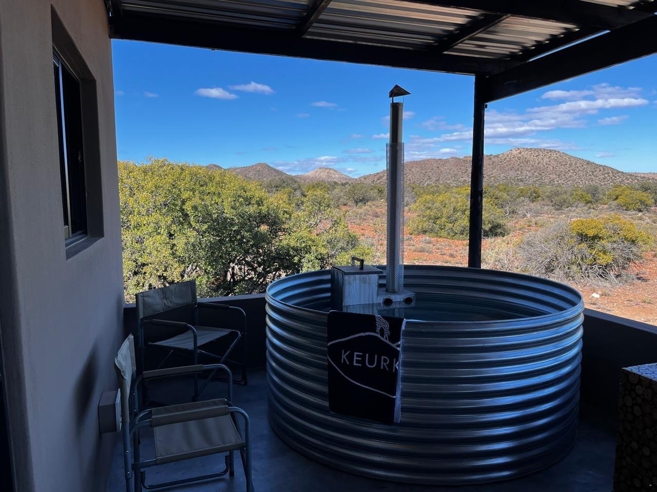 Outside each villa, guests can relax on the patio, light the outdoor braai, and enjoy the private wood-fired hot tub, which can also be used as a plunge pool, an ideal way to unwind under the starry Klein Karoo skies. Carport parking is available.