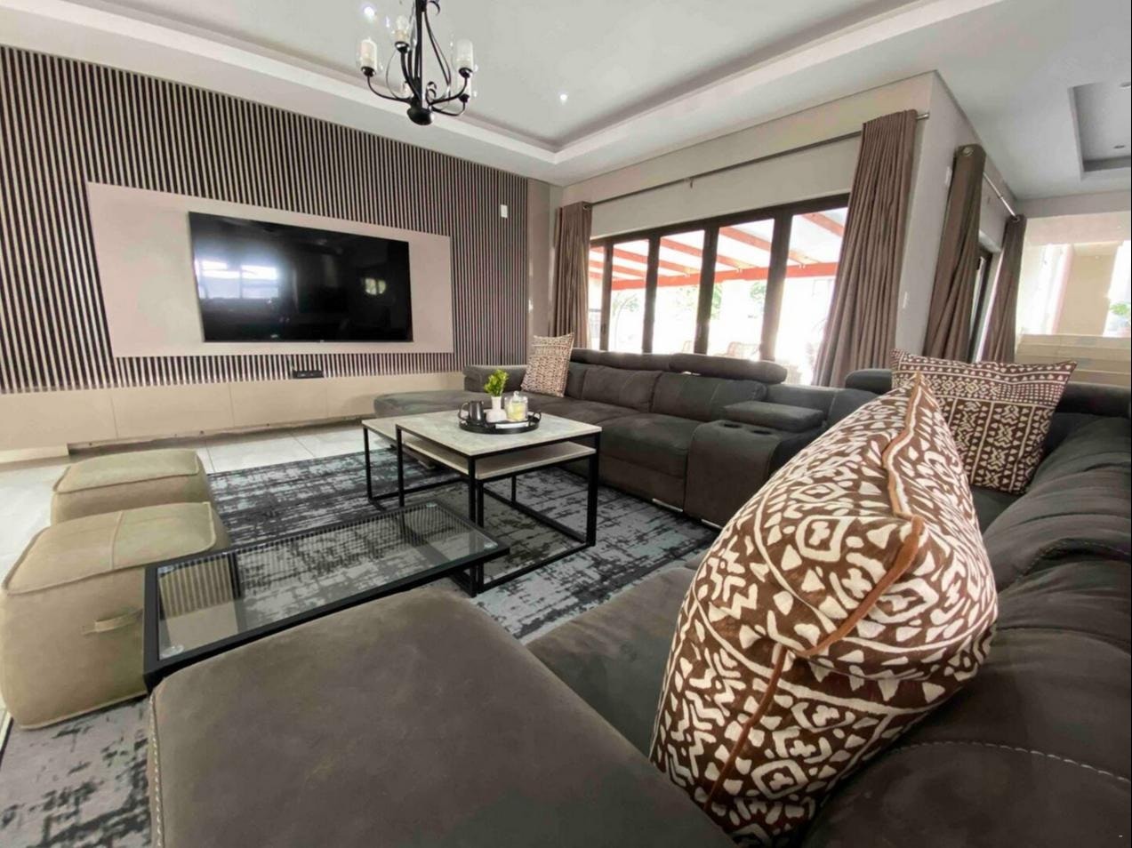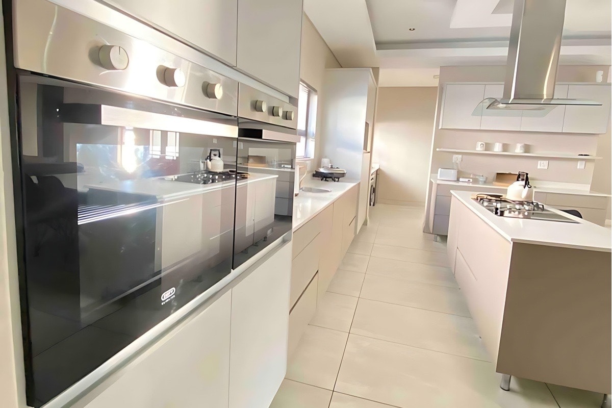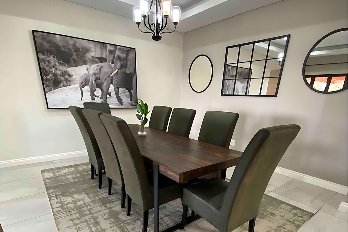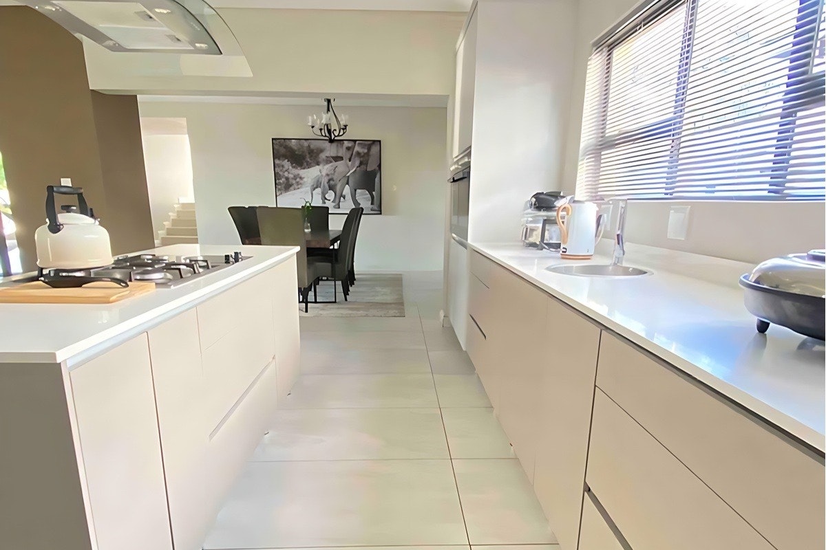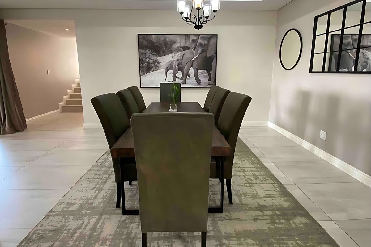 The home boasts a fully equipped kitchen that includes a 4-plate gas stove, 2-plate electric stove, electric oven, microwave, kettle, toaster, fridge-freezer, dishwasher, and washing machine. The lounge and dining area have comfortable seating for guests to dine and relax. For guests' entertainment, a TV with DStv channels, streaming channels, and access to free Wi-Fi is available.