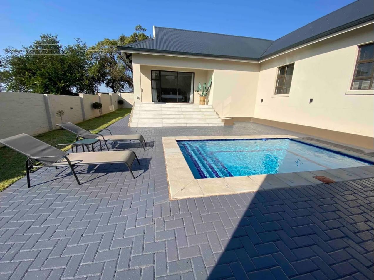 The living area opens onto a covered patio with comfortable outdoor seating and a built-in braai. The patio leads to a well-kept garden, swimming pool, and sun loungers. This property has solar power and is not affected by power outages; it also comes with daily housekeeping. Secure parking is available.