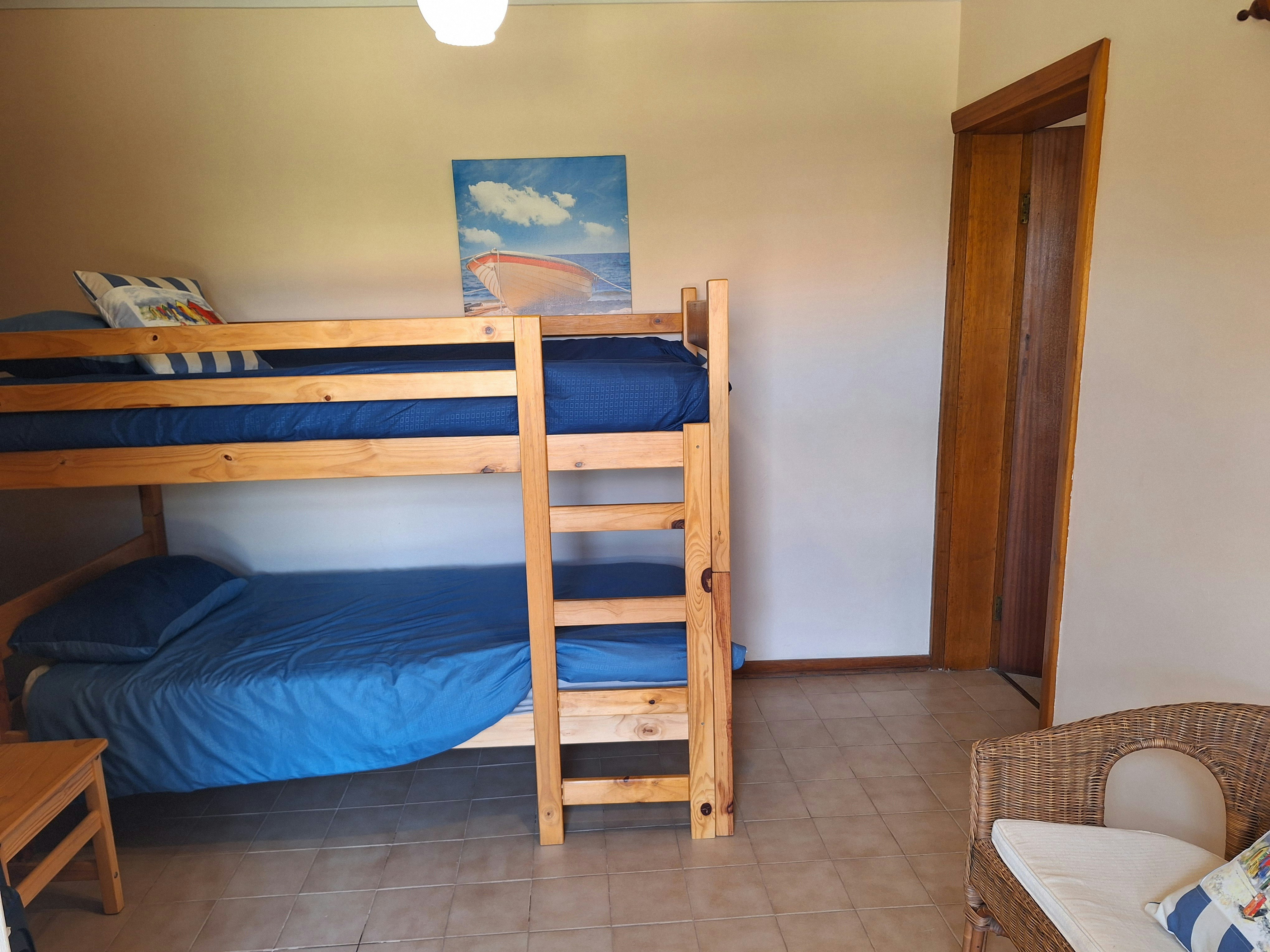 This enclosed property can accommodate 9 guests and comprises 3 bedrooms, 2 bathrooms as well as a guest toilet. The first bedroom is furnished with a queen-size bed, the second bedroom has a double bed and the third bedroom contains a single bed as well as a bunk bed. There are 2 living spaces which each has a single bed. Both bathrooms are fitted with a bath, shower, and washbasin.