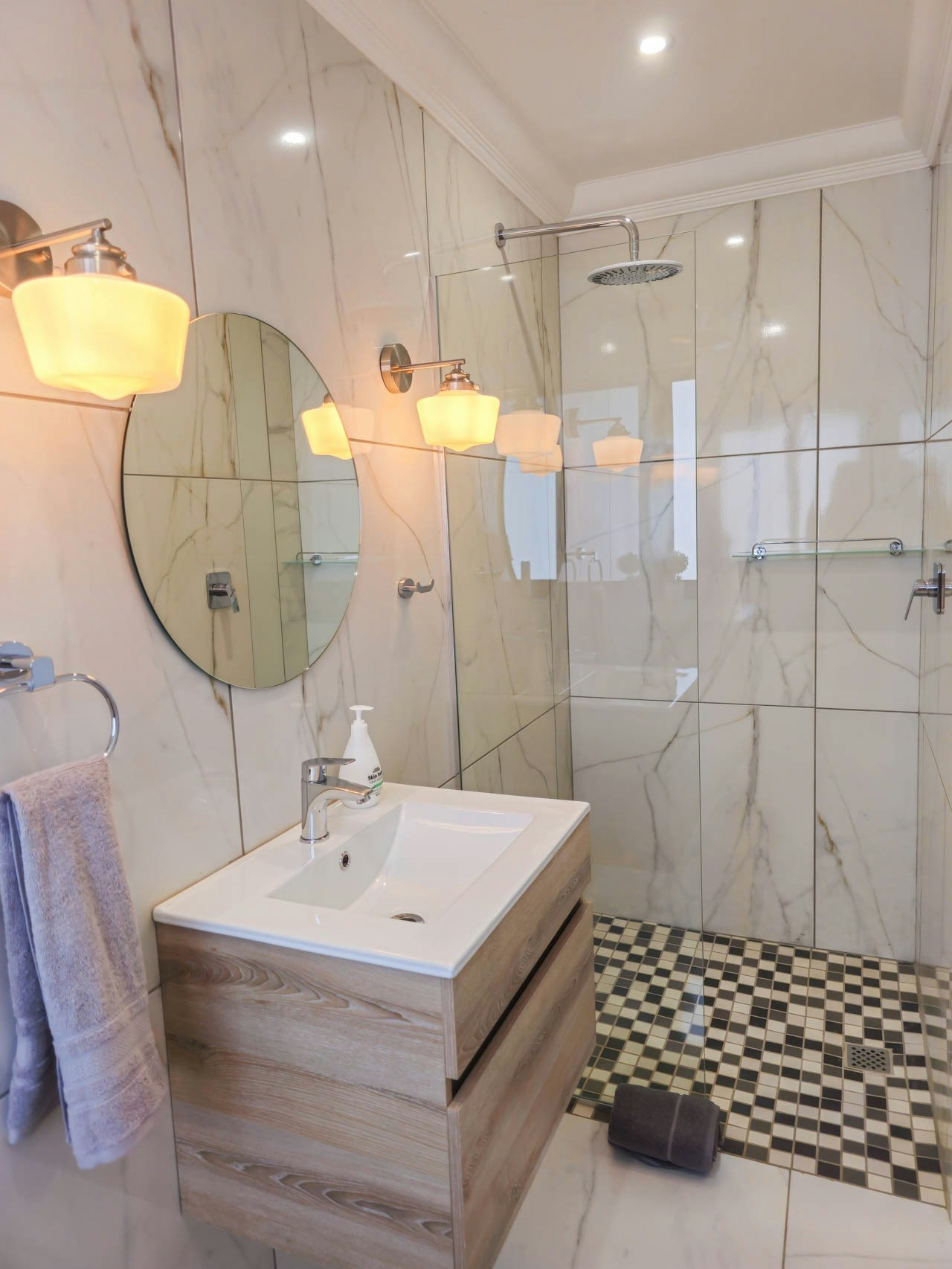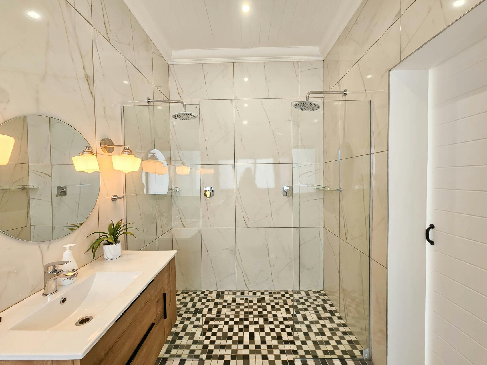 The home boasts a fully equipped kitchen, including a gas stove, oven, microwave, air fryer, kettle, coffee machine, toaster, ice machine, cutlery, crockery, fridge-freezer, and a breakfast bar with stools. Additionally, a dishwasher is available in the separate scullery. The lounge and dining areas offer ample seating for guests to dine and relax, and they also feature an indoor braai. For entertainment, guests can enjoy a TV with a full bouquet of DStv channels and access to free Wi-Fi.