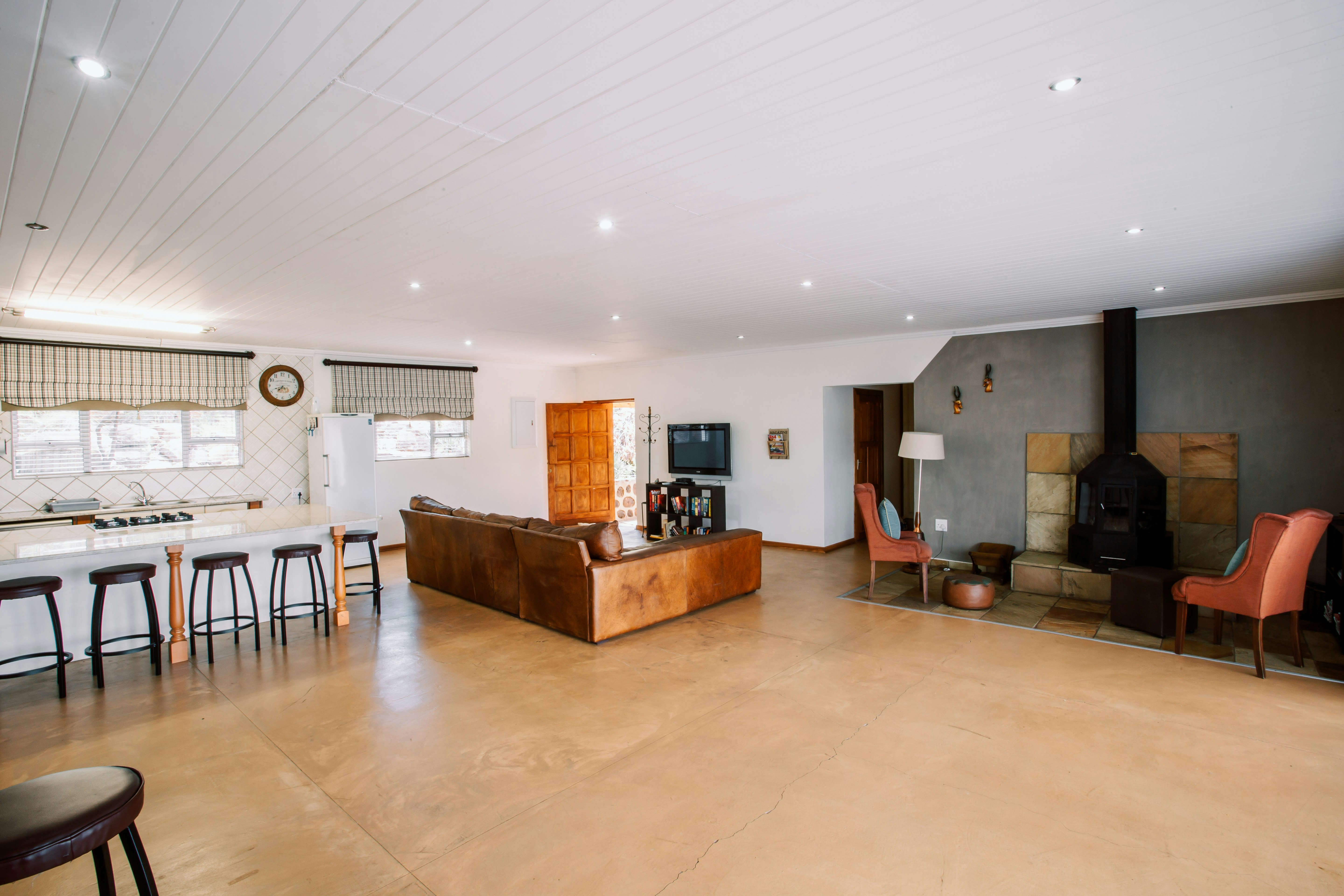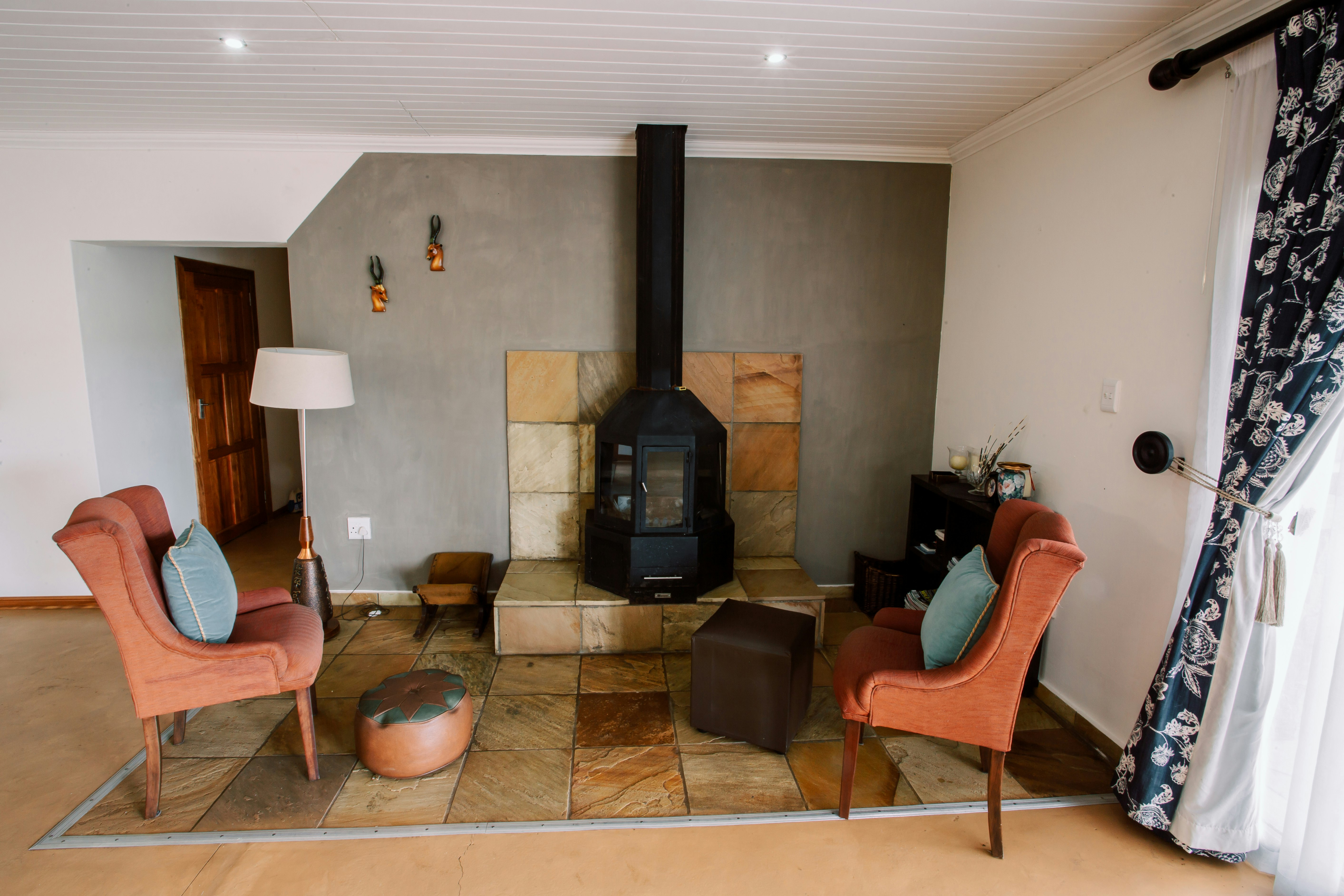 The kitchen is fully equipped for self-catering and includes a gas stove, oven, fridge-freezer, microwave, cutlery, and crockery. The open-plan living area features a dining table, a cosy fireplace, comfortable seating, and a TV with DStv.