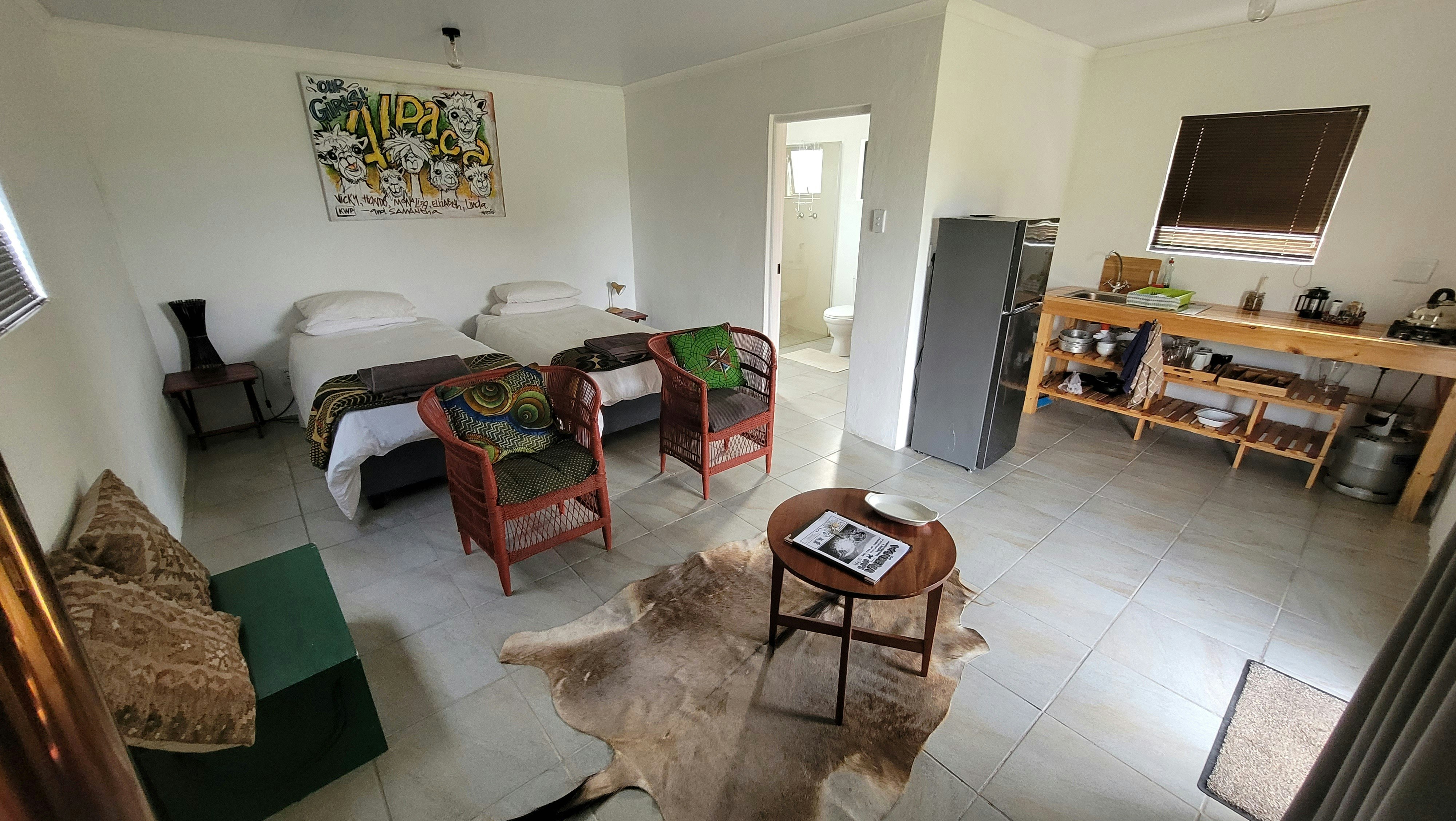 Accommodation at the solar-powered Klein Watervalplaas comprises 3 individually decorated cottages, which can accommodate between 2 to 4 persons. Each cottage consists of separate bedrooms, a private bathroom, a kitchenette with basic appliances to cook meals, as well as an open-plan living area with a fireplace.