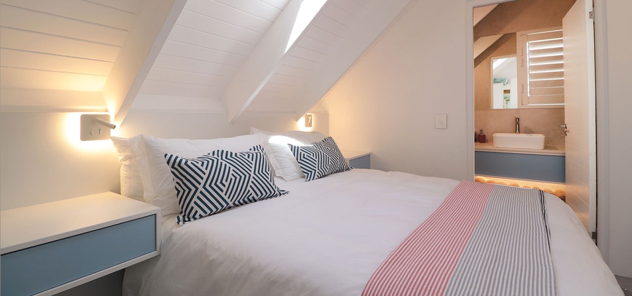 Comfortably furnished for 4 people, the first-floor apartment comprises 2 en-suite double bedrooms, an open-plan kitchen, dining and living area and a lovely balcony with outside braai. Each bedroom contains a queen-size bed and has a shower en suite with a toilet and washbasin. The kitchen is fitted with a fridge, a stove and oven, a microwave, and a dishwasher, and meals can be enjoyed at the 4-seater dining table and chairs. The living area is furnished with a couch, and a flat-screen TV with full DStv, Netflix and YouTube. The lounge opens to a balcony with seating, a large dining table and chairs, and a built-in braai.