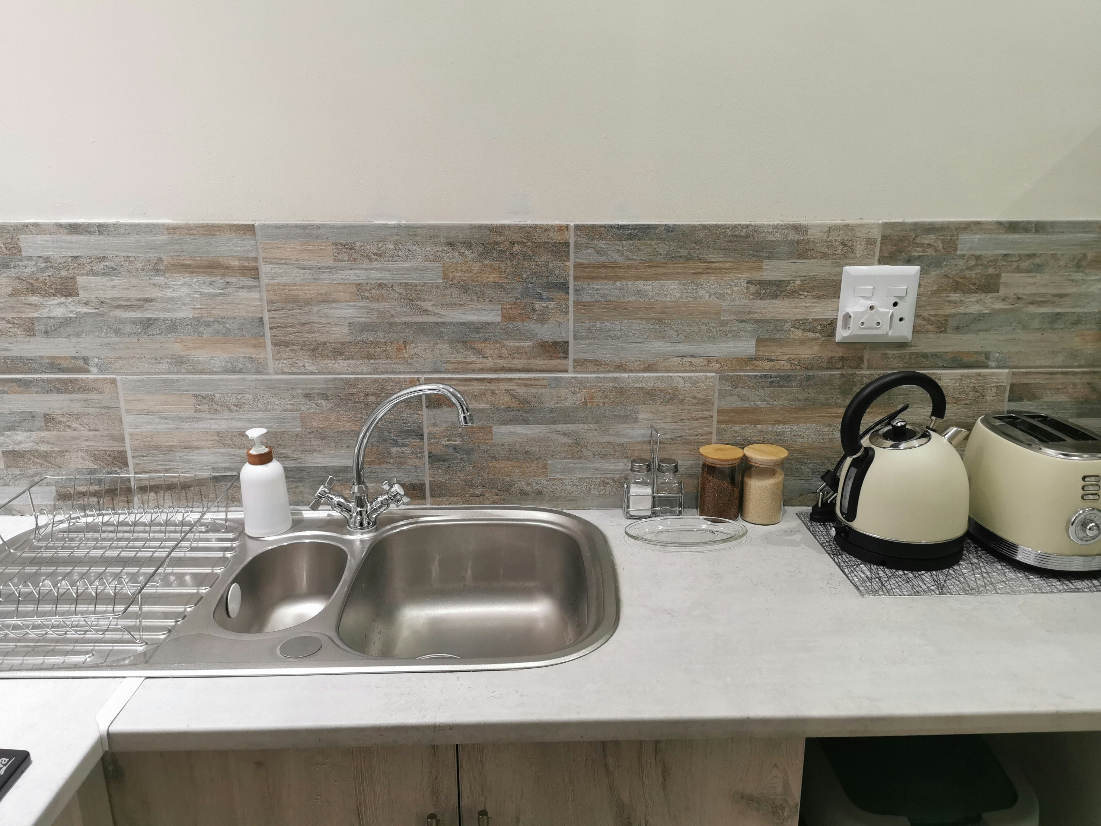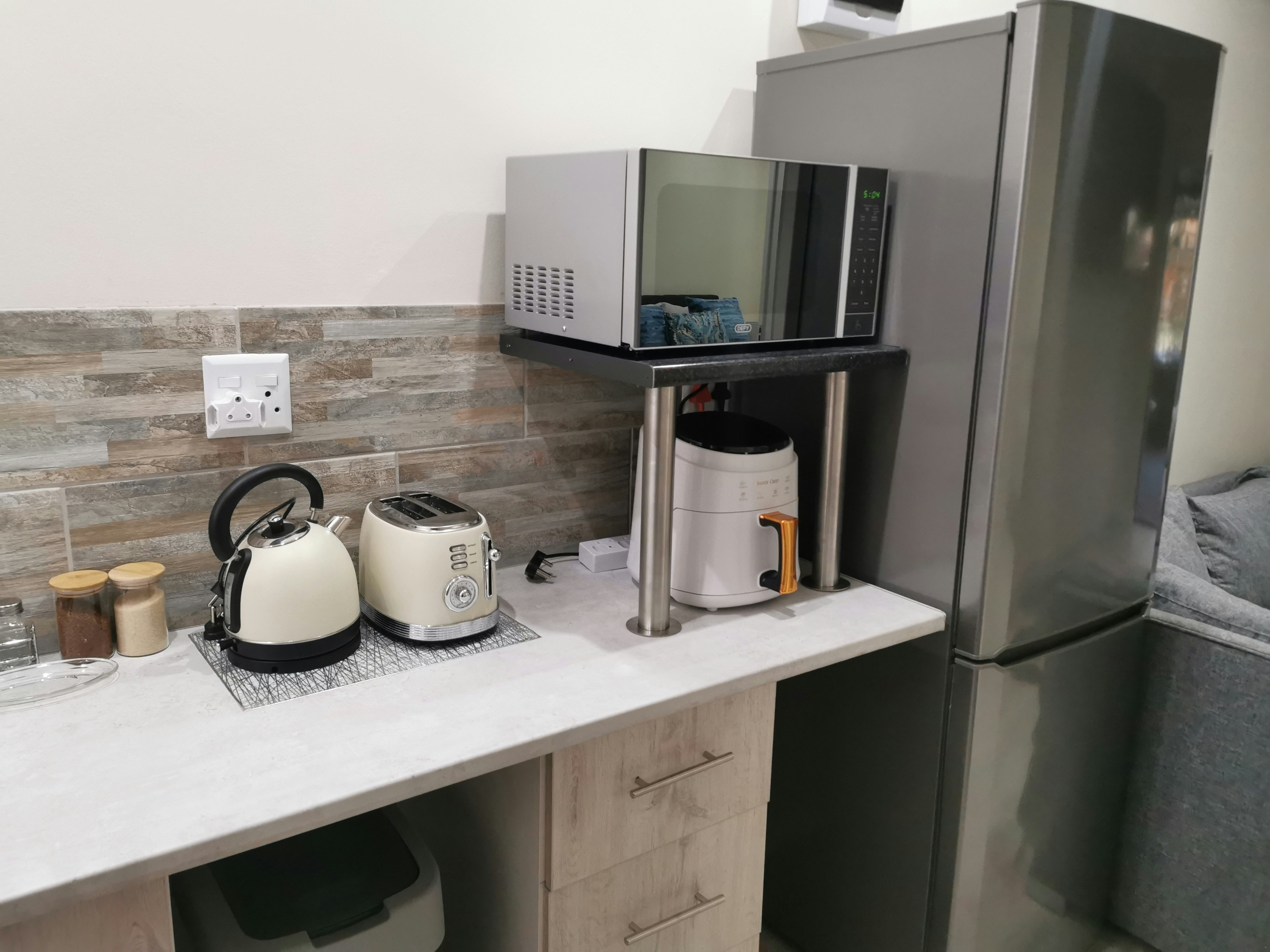 The unit features a well-equipped kitchen that includes a gas stove, oven, air fryer, microwave, kettle, toaster, cutlery, crockery, bar fridge, and a breakfast bar with stools. For entertainment, a smart TV with selected DStv channels and access to free Wi-Fi is available.