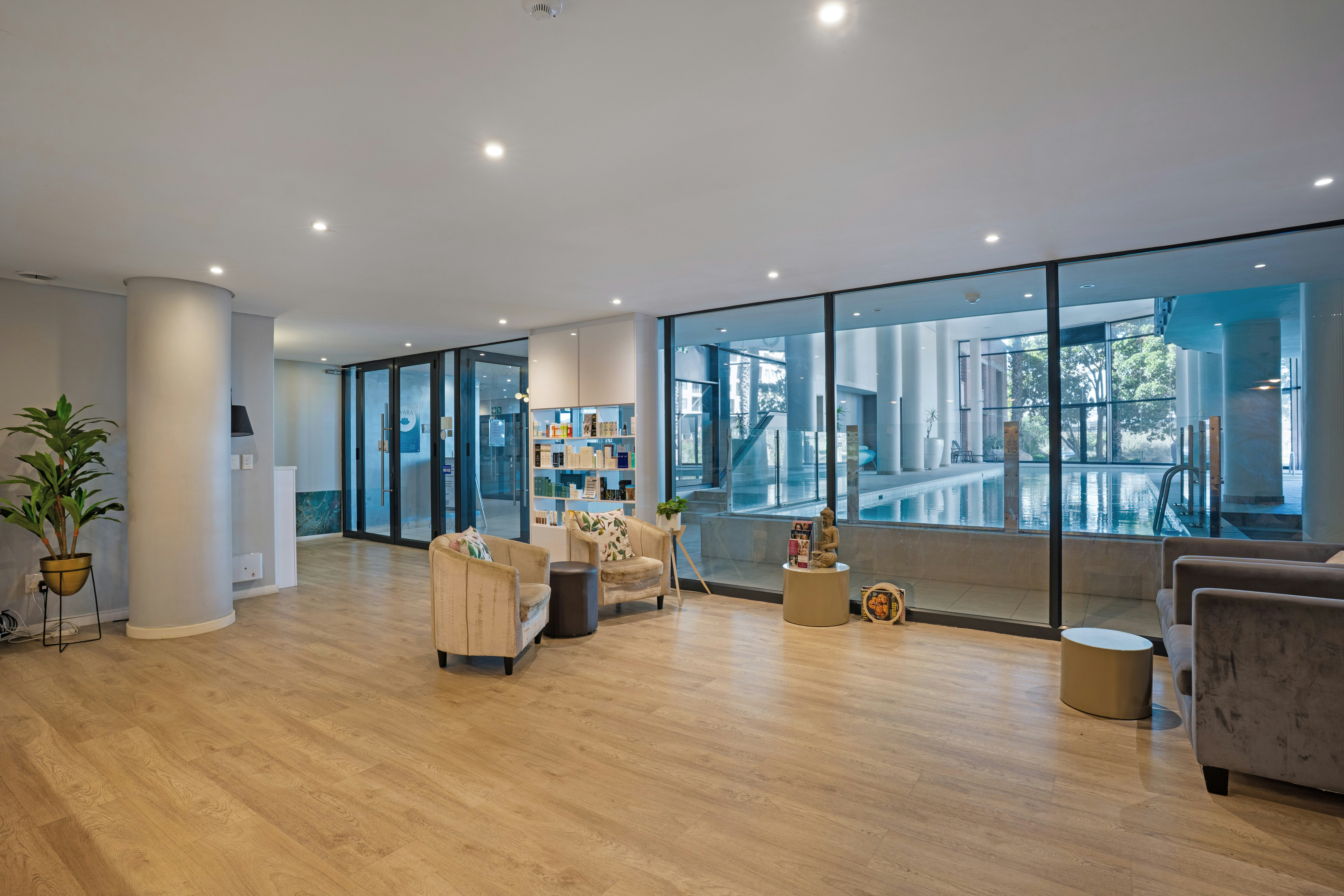 Knightsbridge boasts a myriad of up-market facilities overlooking the 8 km canal and Intaka Island Nature Reserve, these facilities include a 20m-heated indoor swimming pool, a sauna, a steam room, a jacuzzi, as well as a gymnasium, and an executive lounge.