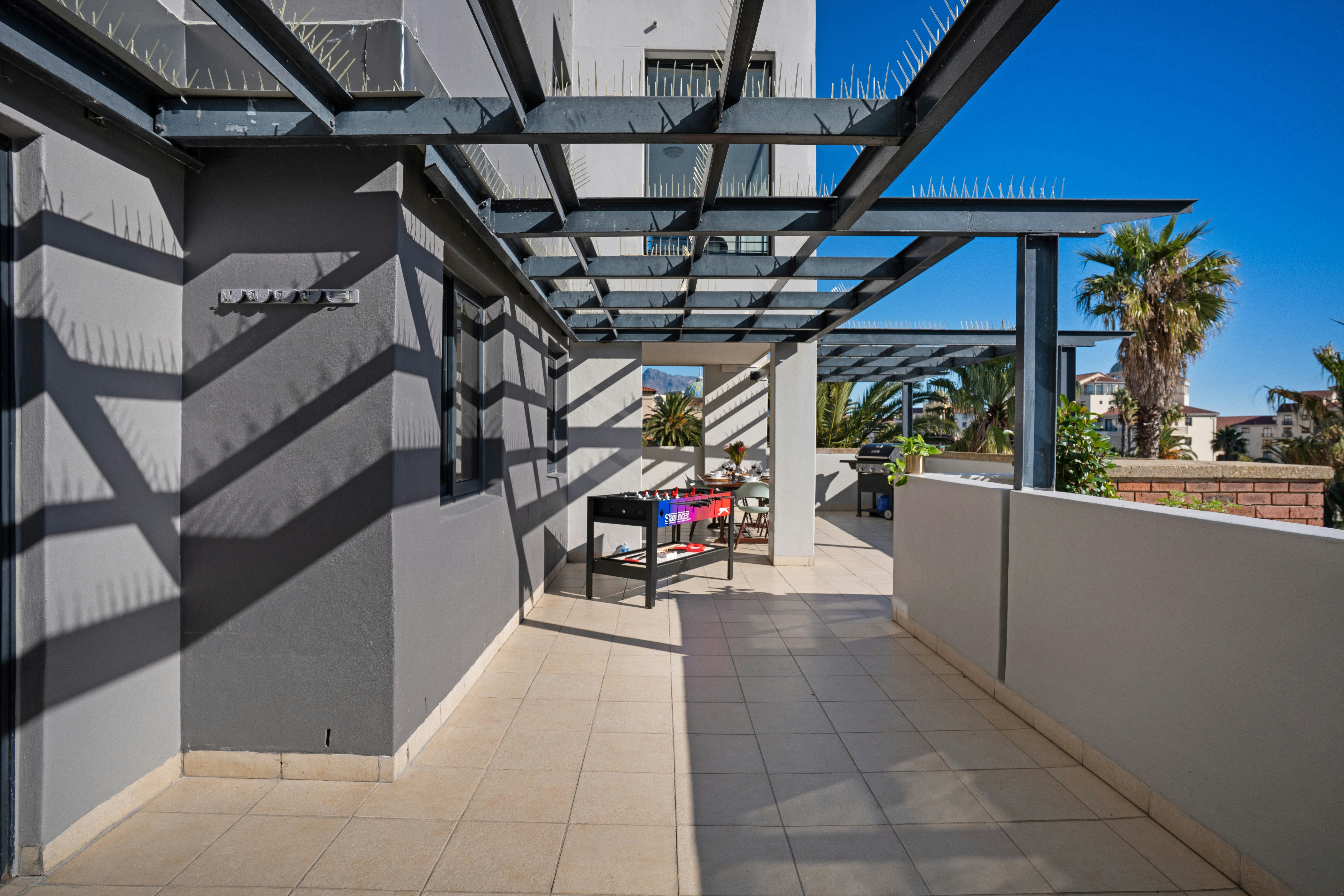 The unit opens up onto a lovely patio with braai facilities and a 6-seater table and chairs and boasts incredible views of Table Mountain and Canal lake.