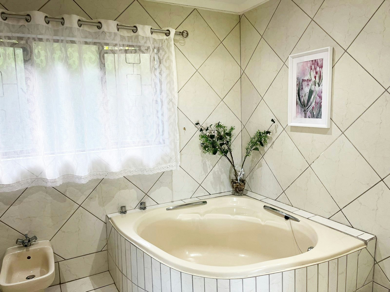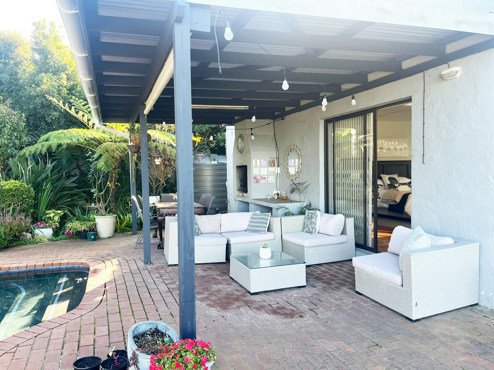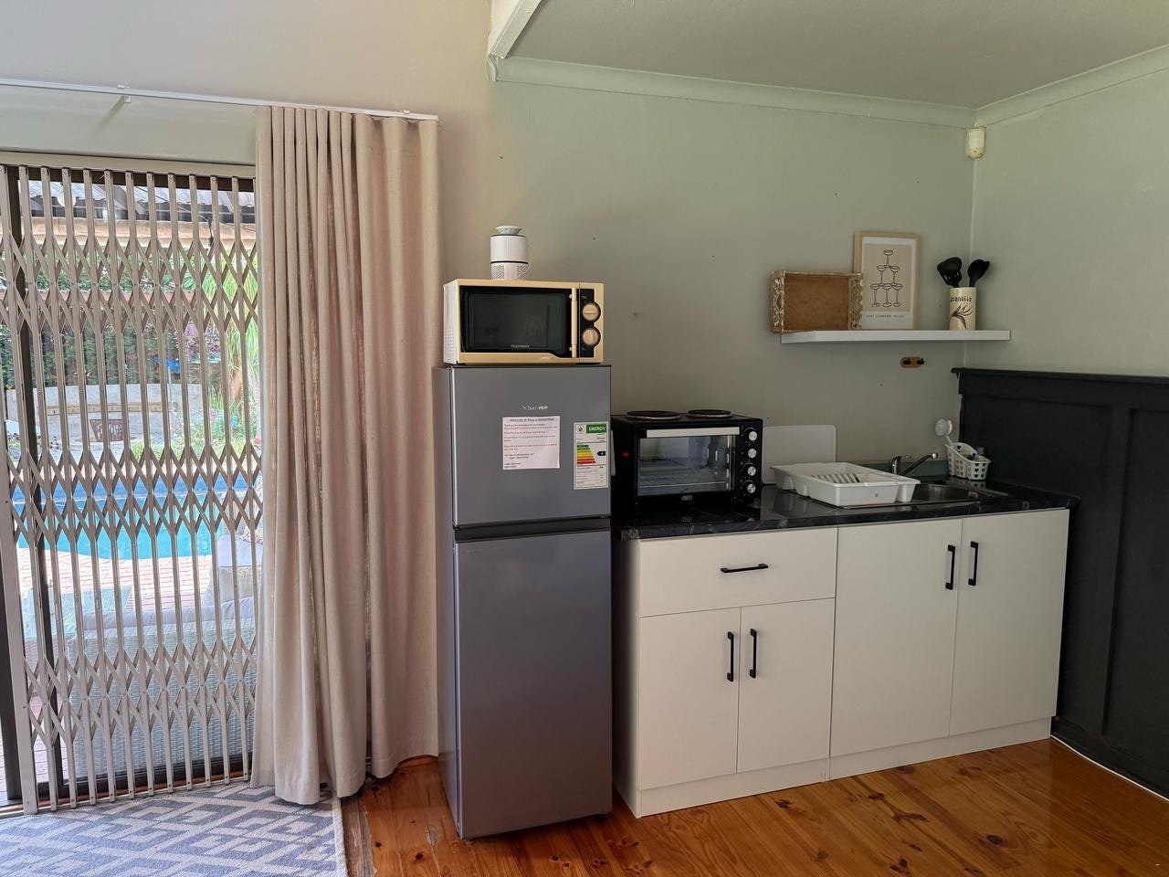 Die kombuisie is met 'n mikrogolfoond, yskassie en ander toebehore toegerus. Die sitarea het 'n TV met DStv en Netflix. Daar is 'n slaapbank vir kinders en die sitarea lei na 'n lieflike kuierarea met 'n uitsig oor die strandmeer, welige tuine, groot swembad en 'n ingeboude braai.