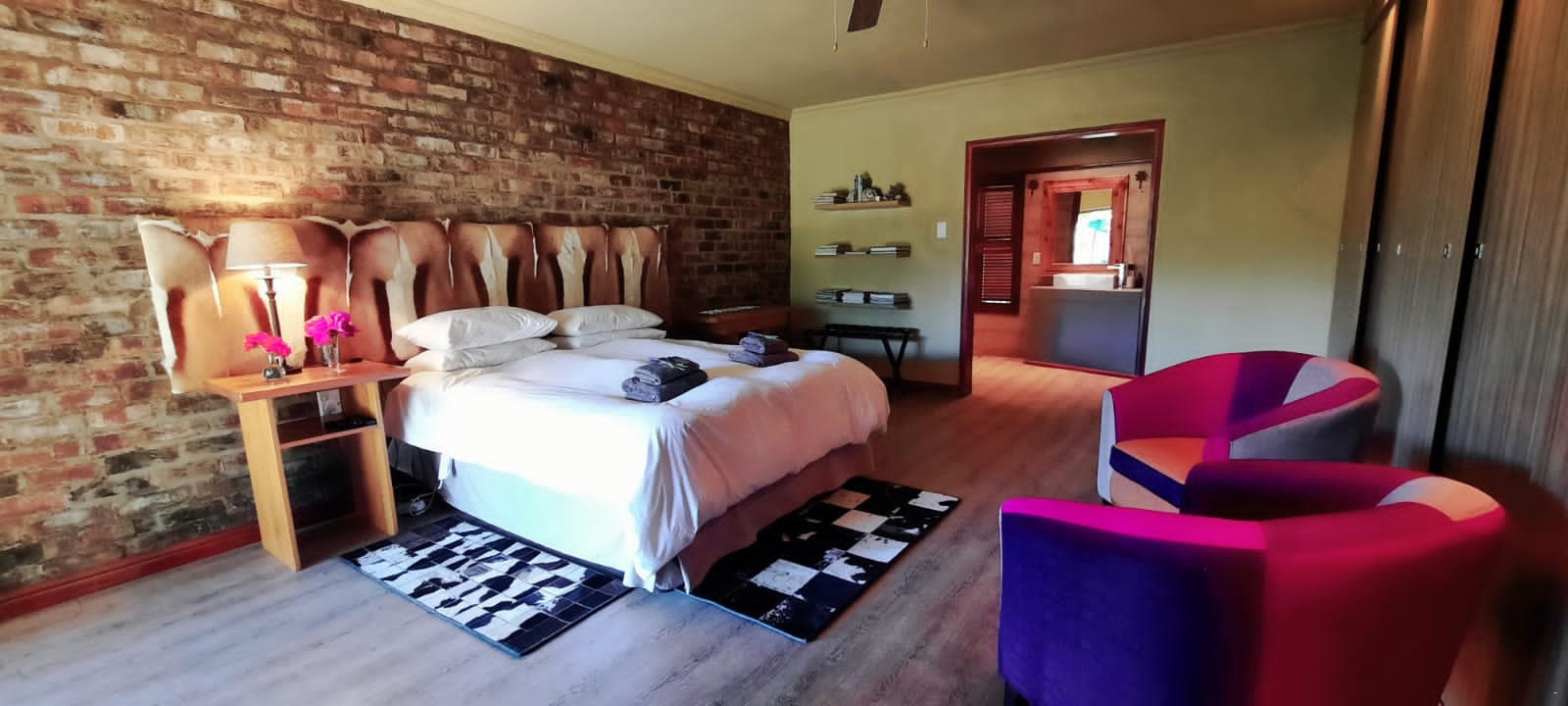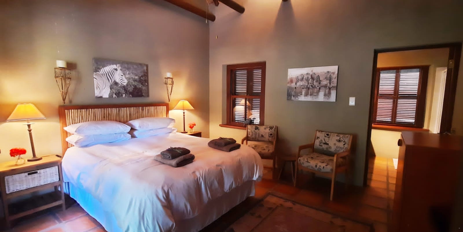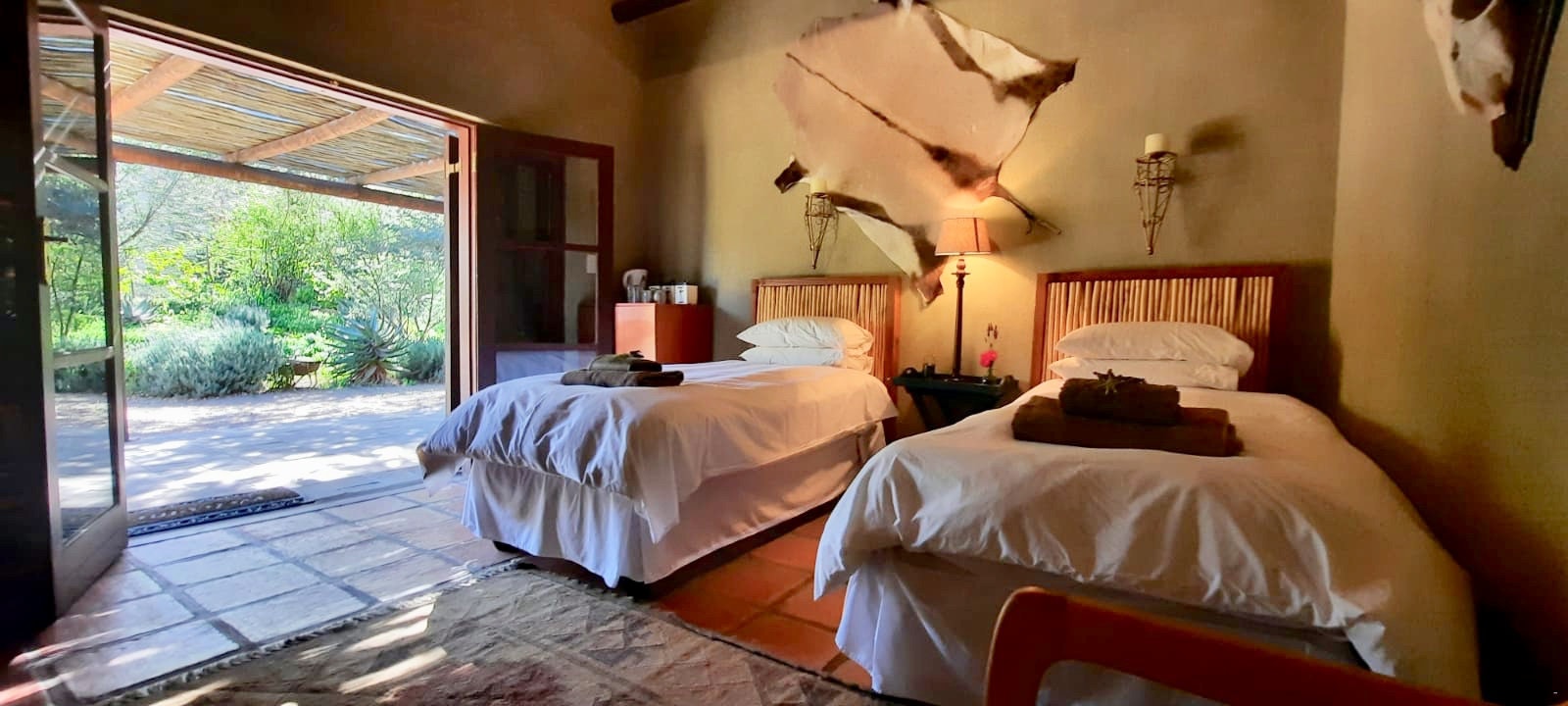 Guests have a choice of lovely rooms that can each accommodate up to 2 people. The Gemsbok and Zebra tooms are adjacent to each other, and each room has a reed roof for a cool feel and have private entrances. The Springbok room is located away from the other rooms and overlooks the garden.
