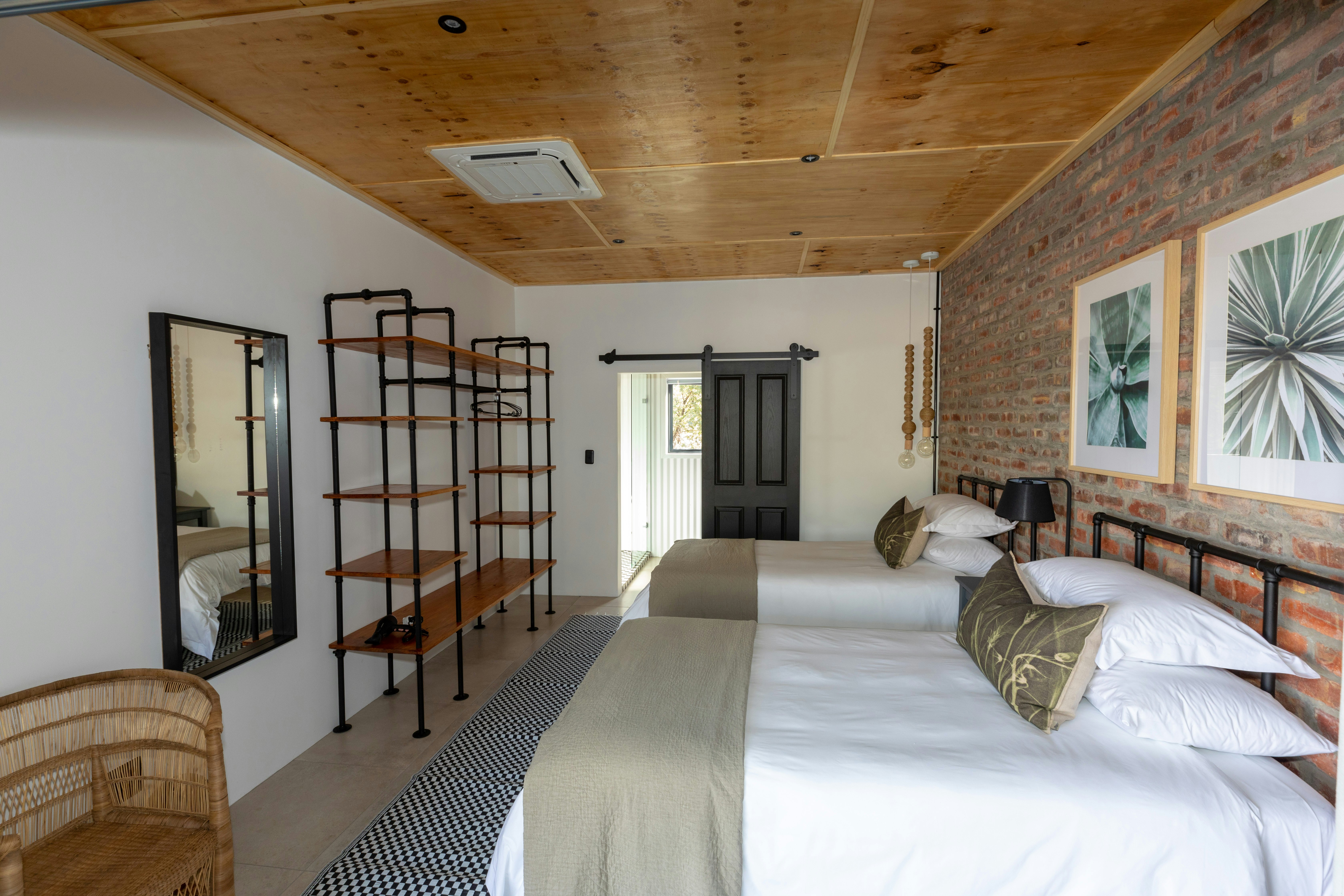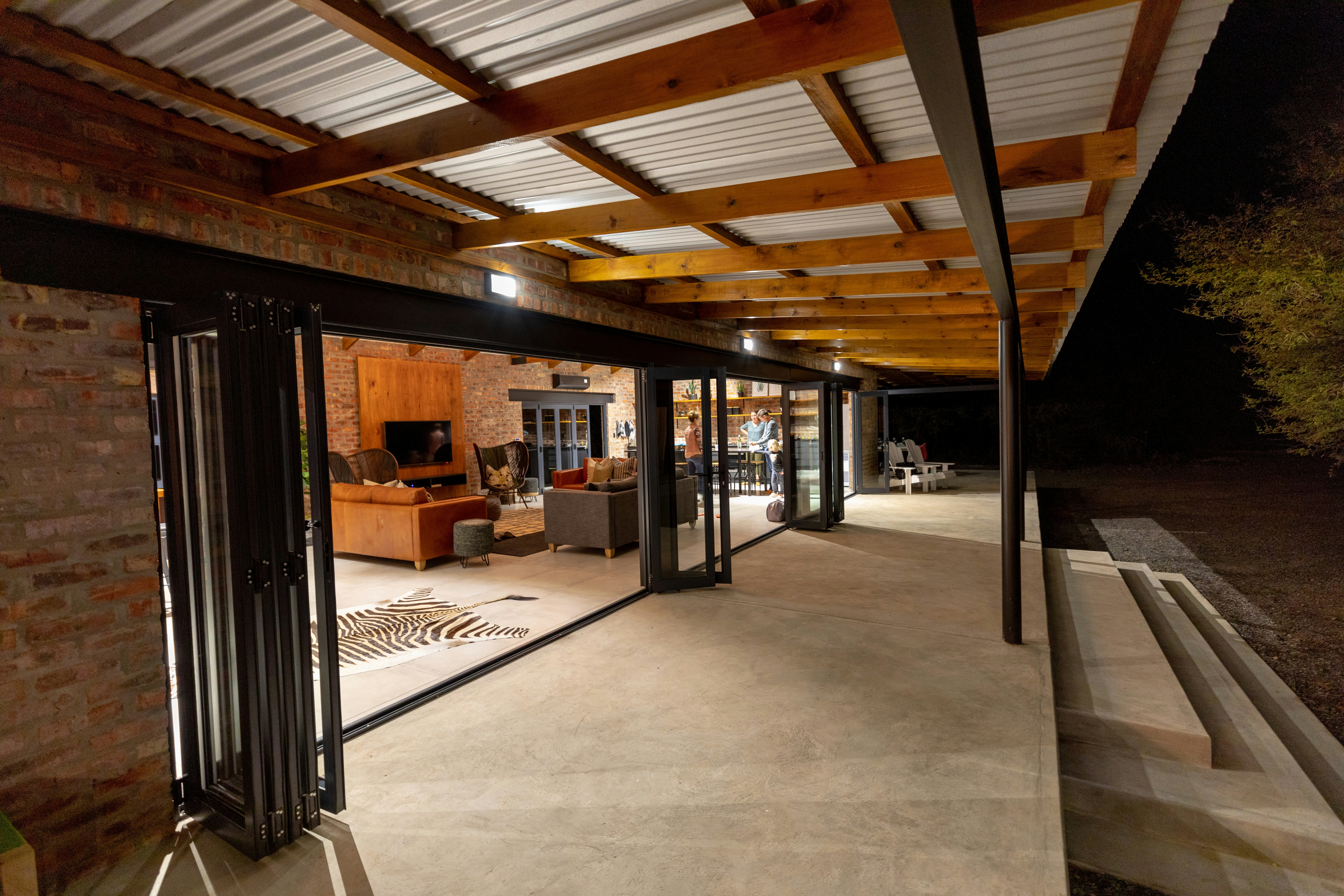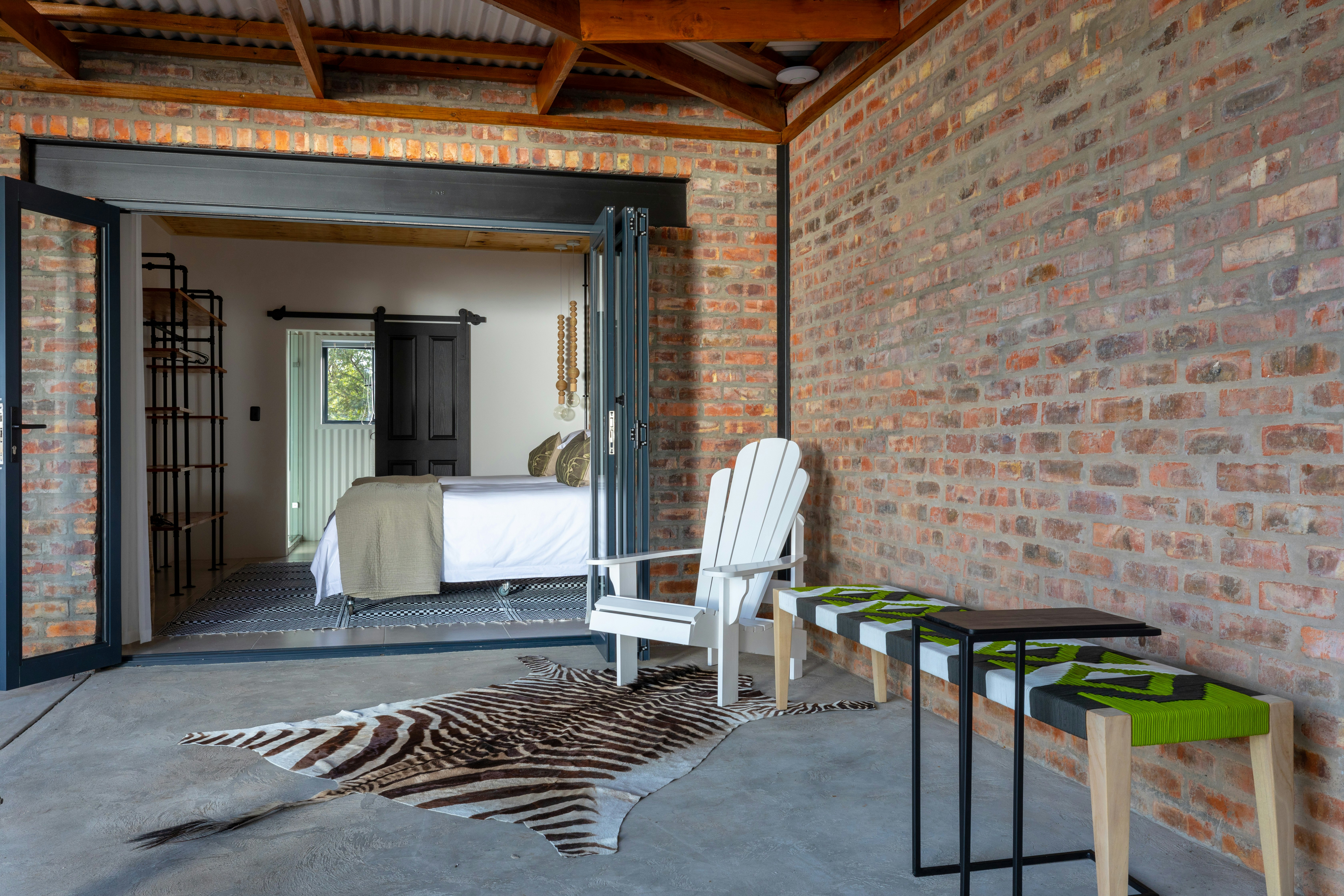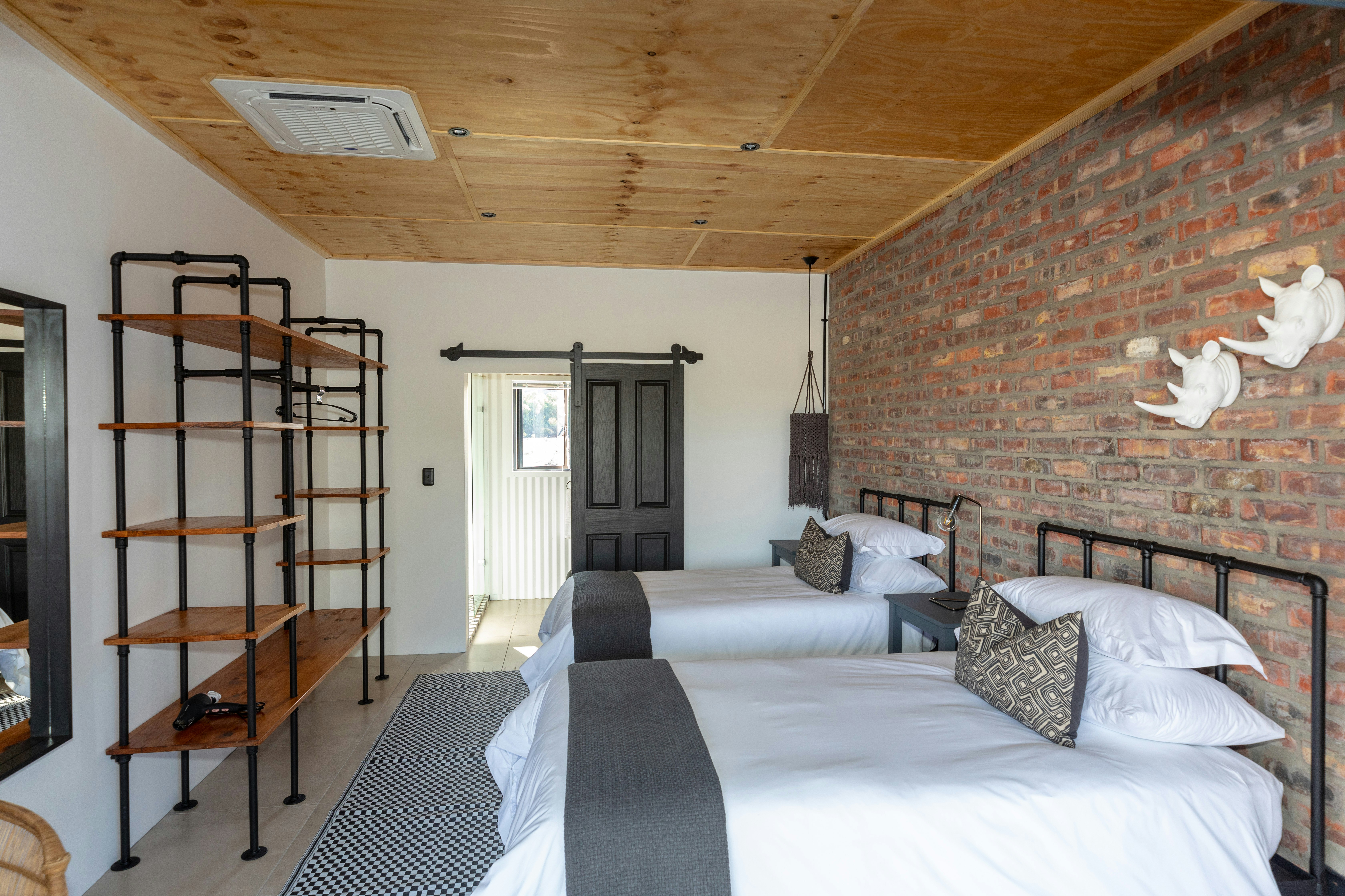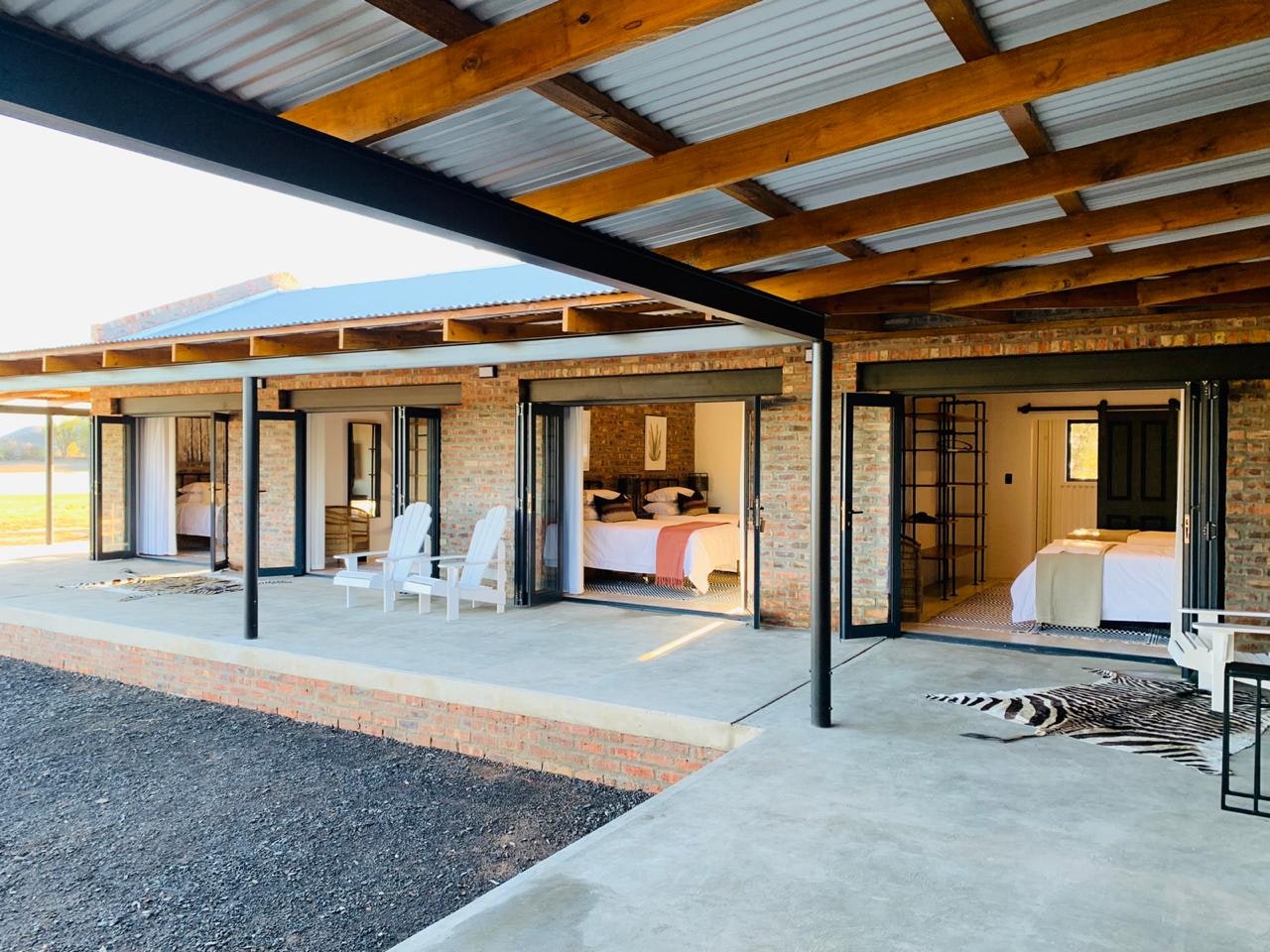 The Nyala Lodge comprises 4 bedrooms, 4 en-suite bathrooms, and an open-plan kitchen and living area. The kitchen is fully equipped for self-catering. The lounge has a comfy lounge suite and a wall-mounted flat-screen TV with selected DStv channels. The living area opens up onto a wraparound verandah which has outdoor patio furniture, an outdoor dining set, and braai facilities.