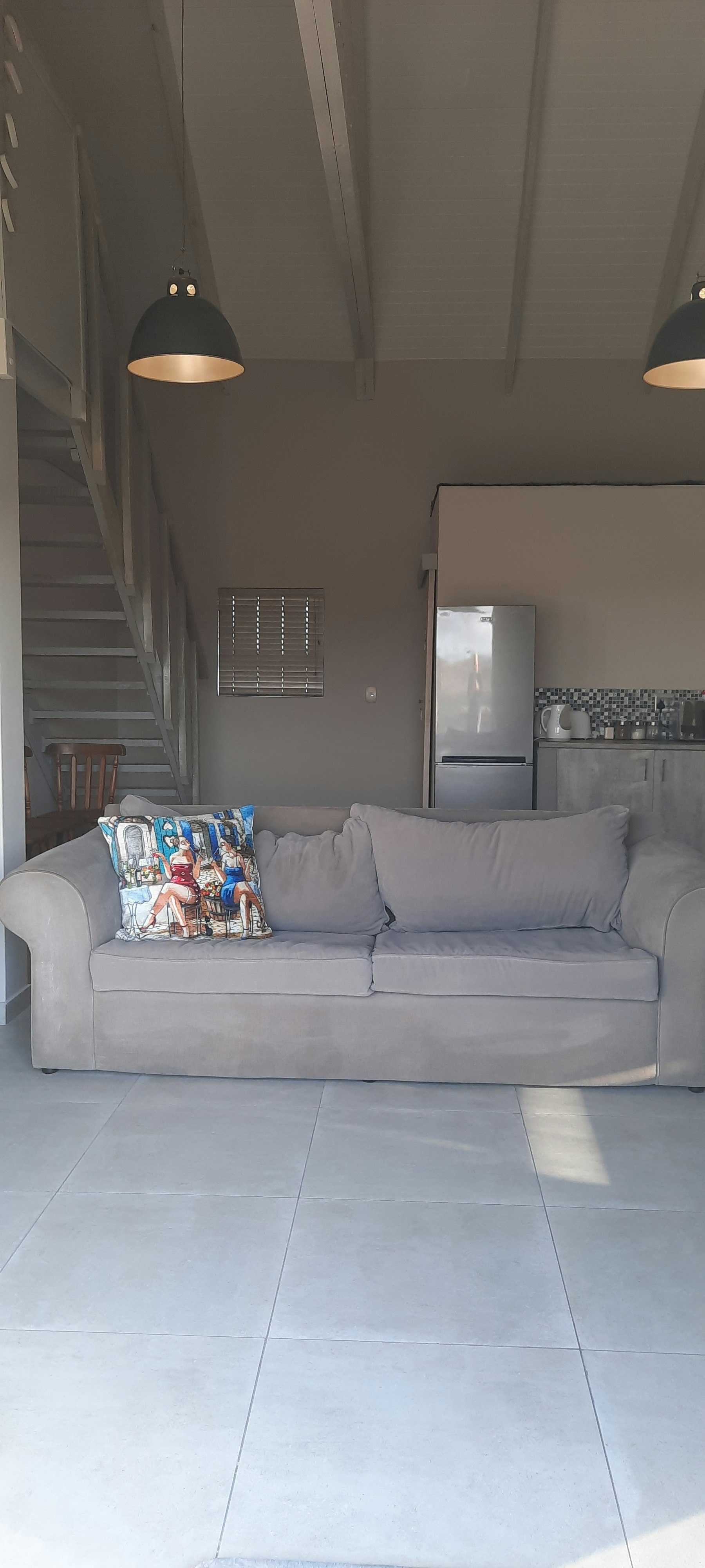 The open-plan living area features a well-equipped kitchen that includes a gas stove, electric oven, microwave, air fryer, tea- and coffee-making facilities, and a fridge-freezer. There is also a separate scullery with a washing machine. The lounge and dining area have comfortable seating for guests to dine and relax and includes an indoor braai. For guests' entertainment, a smart TV with streaming channels and access to free Wi-Fi are available.
