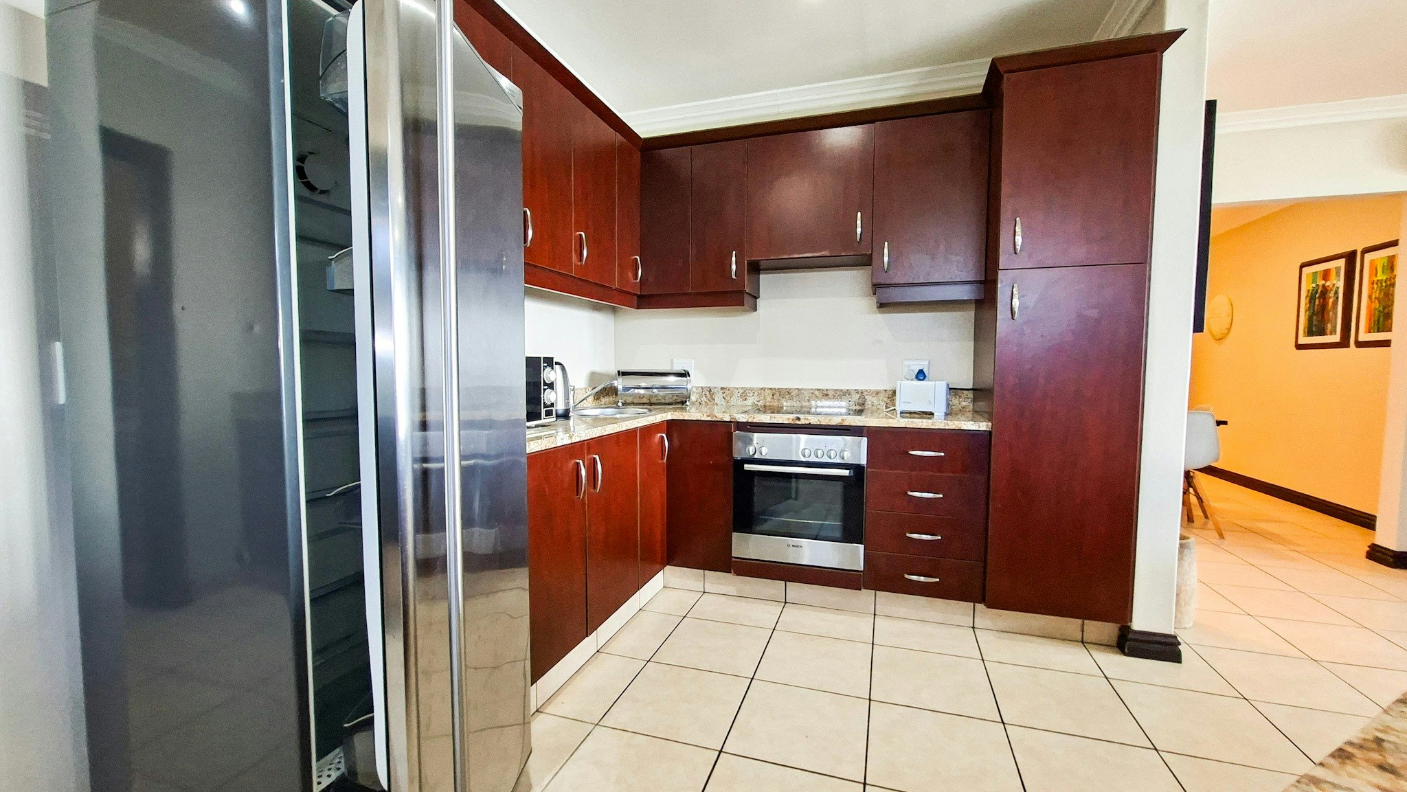 The kitchen is fully equipped for self-catering and includes a stove and oven, a fridge-freezer, a microwave, and a breakfast bar with stools. The living area contains a flat-screen TV. The living area contains an aircon, opens through sliding doors to a covered balcony with outdoor furniture.