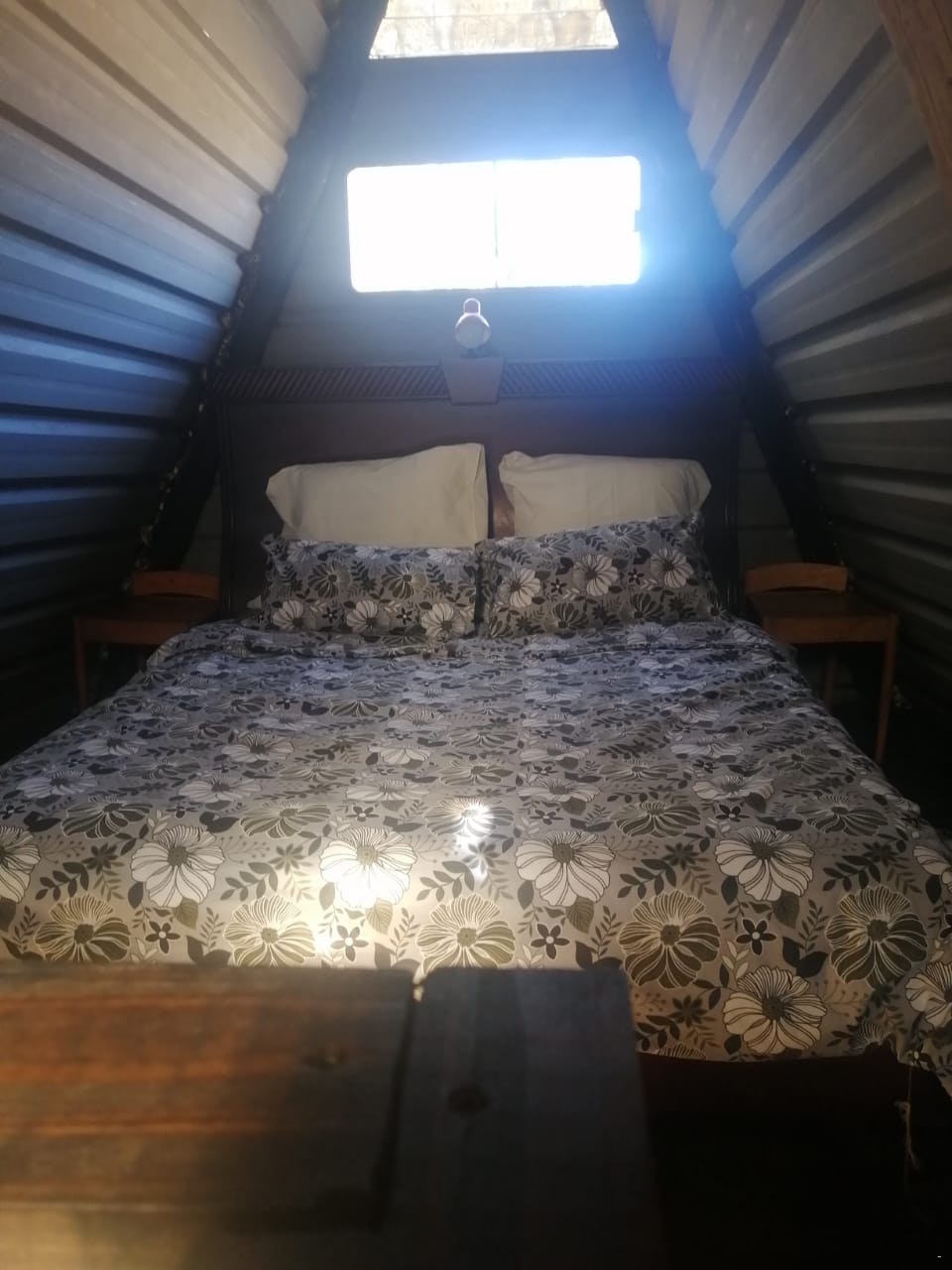 This A-frame design unit can accommodate 2 guests and comprises 1 bedroom and 1 bathroom. The loft bedroom is comfortably furnished with a queen-size bed, and the bathroom is fitted with a shower, toilet, and washbasin.