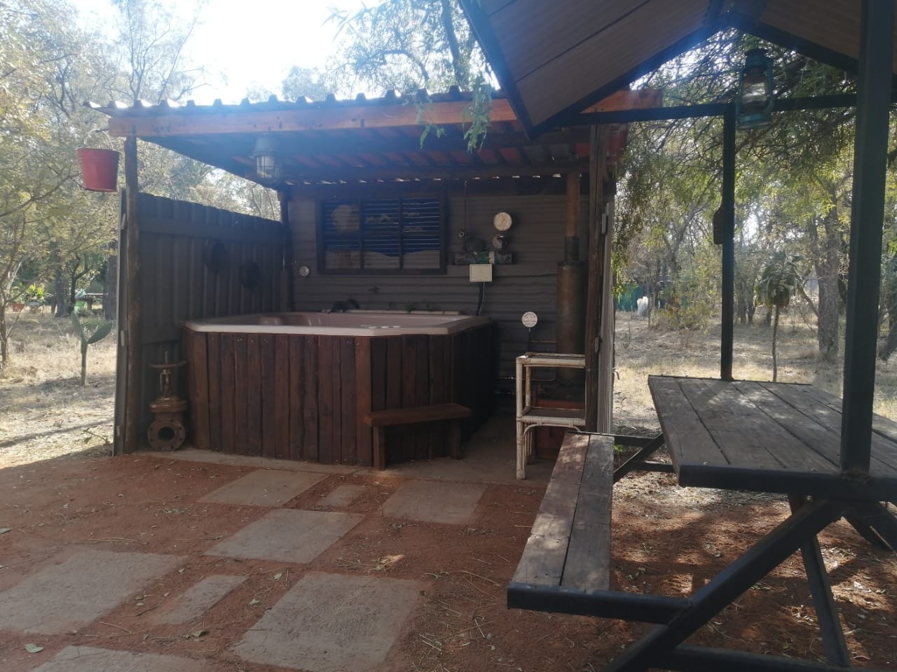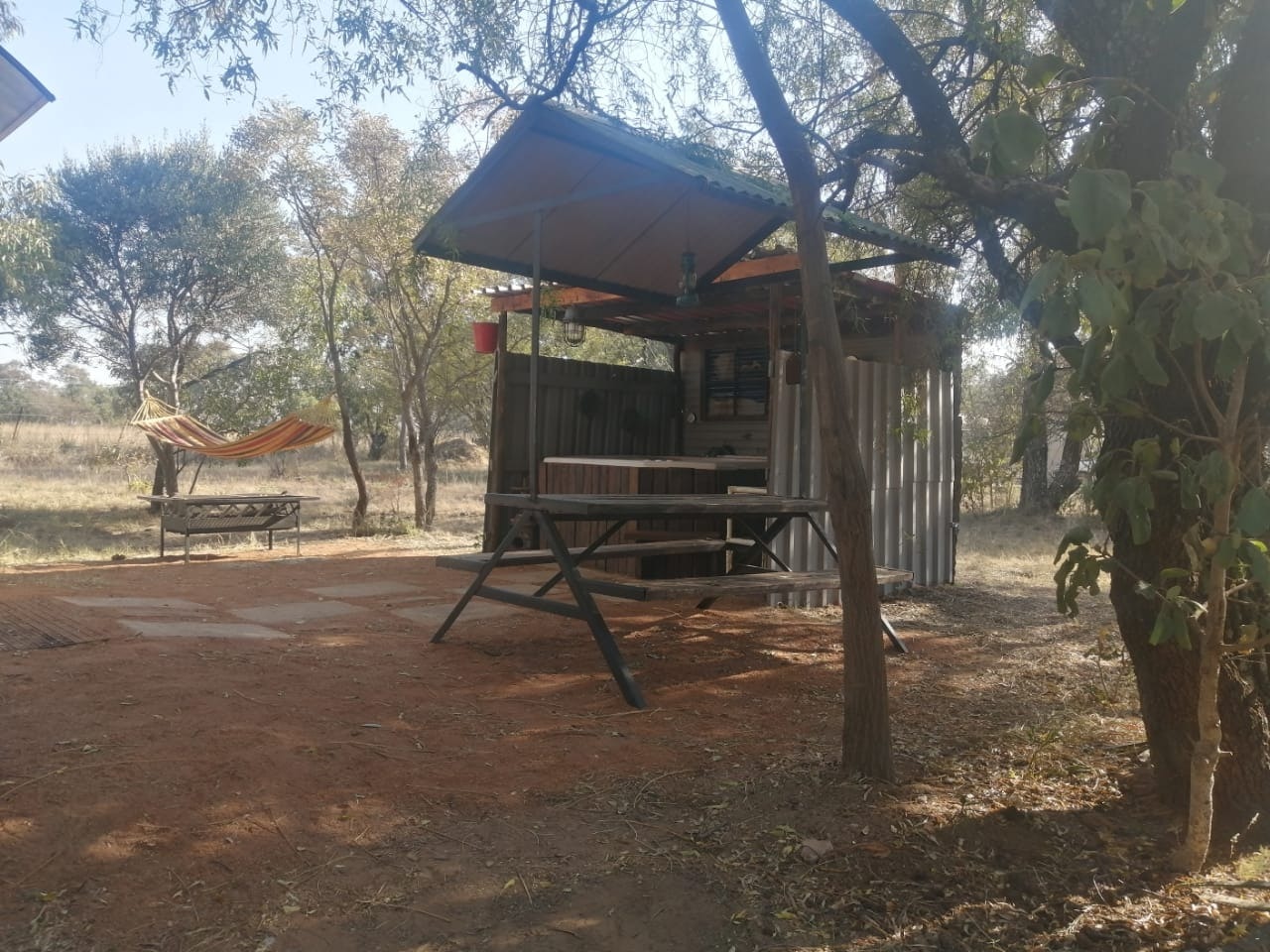 Kwamakaya Lodge is a cosy self-catering unit built entirely from recycled and repurposed materials. Situated on a bushveld farm, it is approximately 800 meters from the Dinokeng Game Reserve gate, 15 kilometers from the self-drive route, and 20 kilometers from Cullinan, making it an ideal location to explore the region.