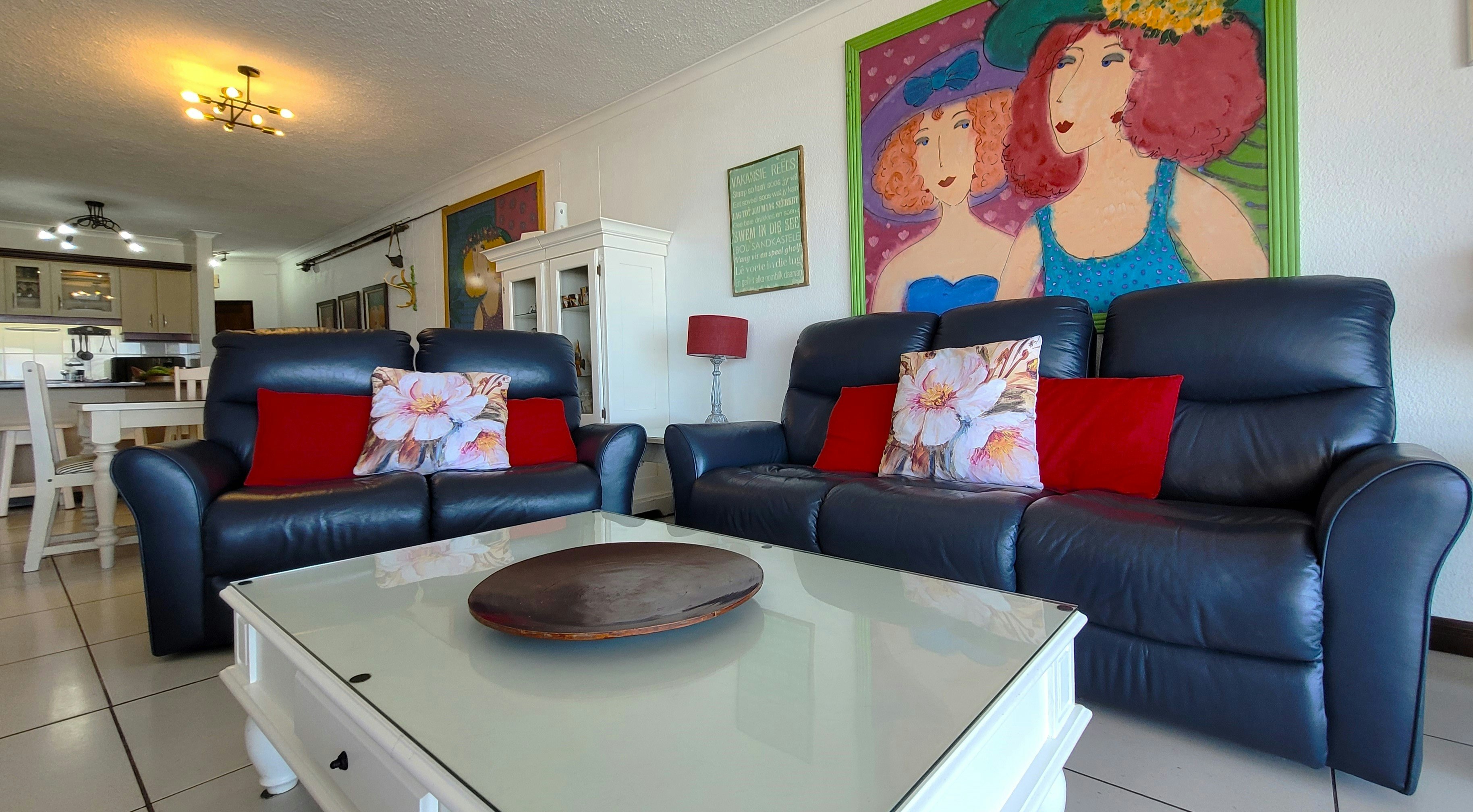 The lounge has comfortable sofas to relax on, and there is a TV with a DVD player and full DStv viewing. Sliding doors open from the living area onto the covered patio, where there are charcoal braai facilities to use, a table with chairs, and lovely sea and surround views to admire.