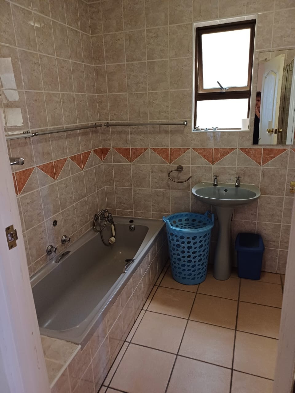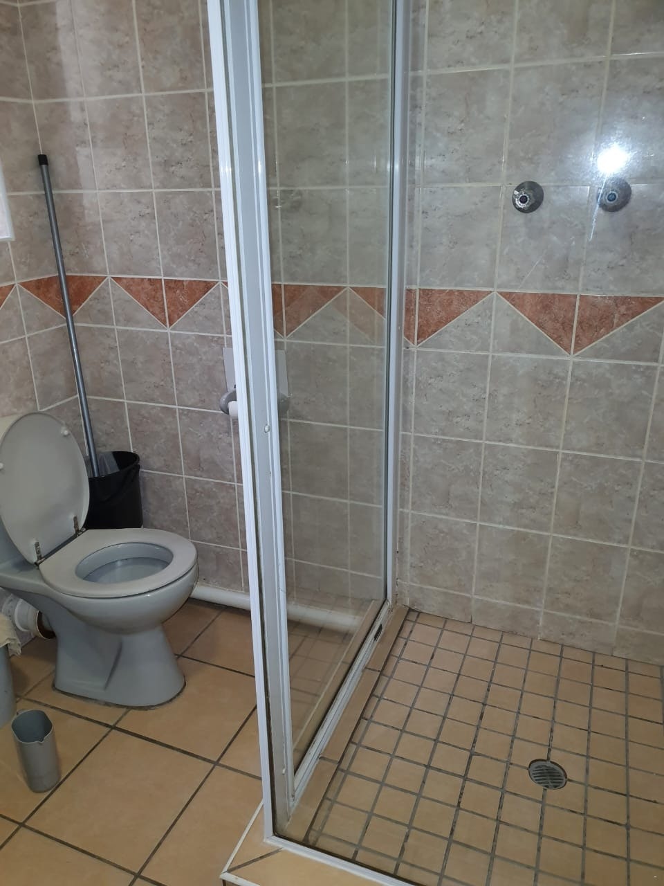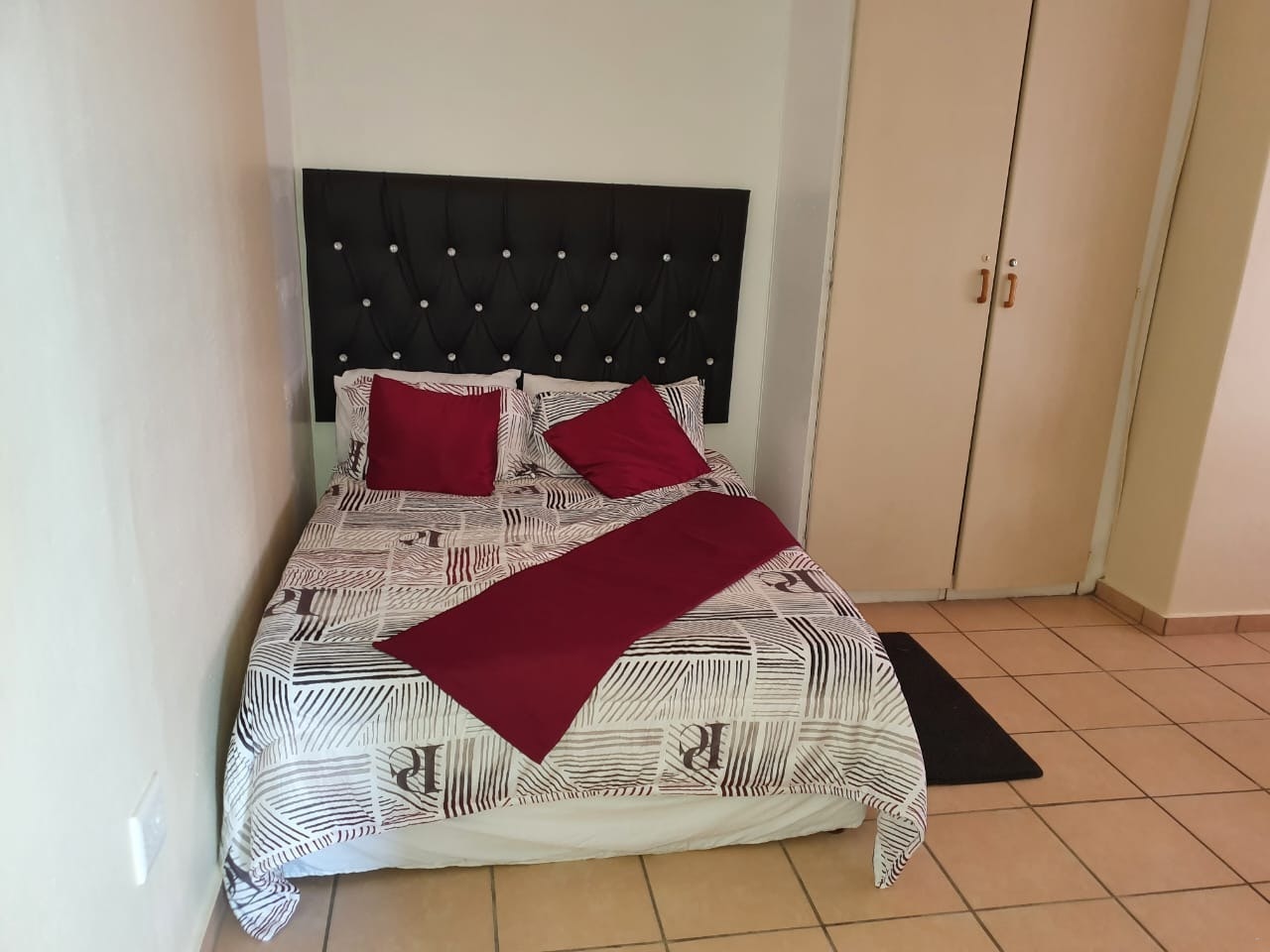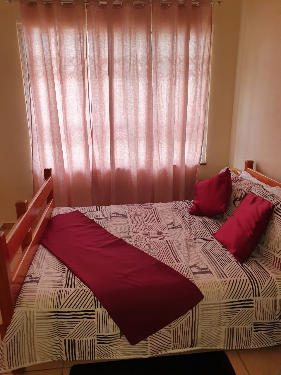 The open-plan living area features comfortable seating, a TV, a dining table, and a well-equipped kitchen. The kitchen includes a fridge-freezer, stove, oven, microwave, and coffee- and tea-making facilities. Guests also have access to a communal swimming pool and braai facilities within the complex, and visitor parking is available.