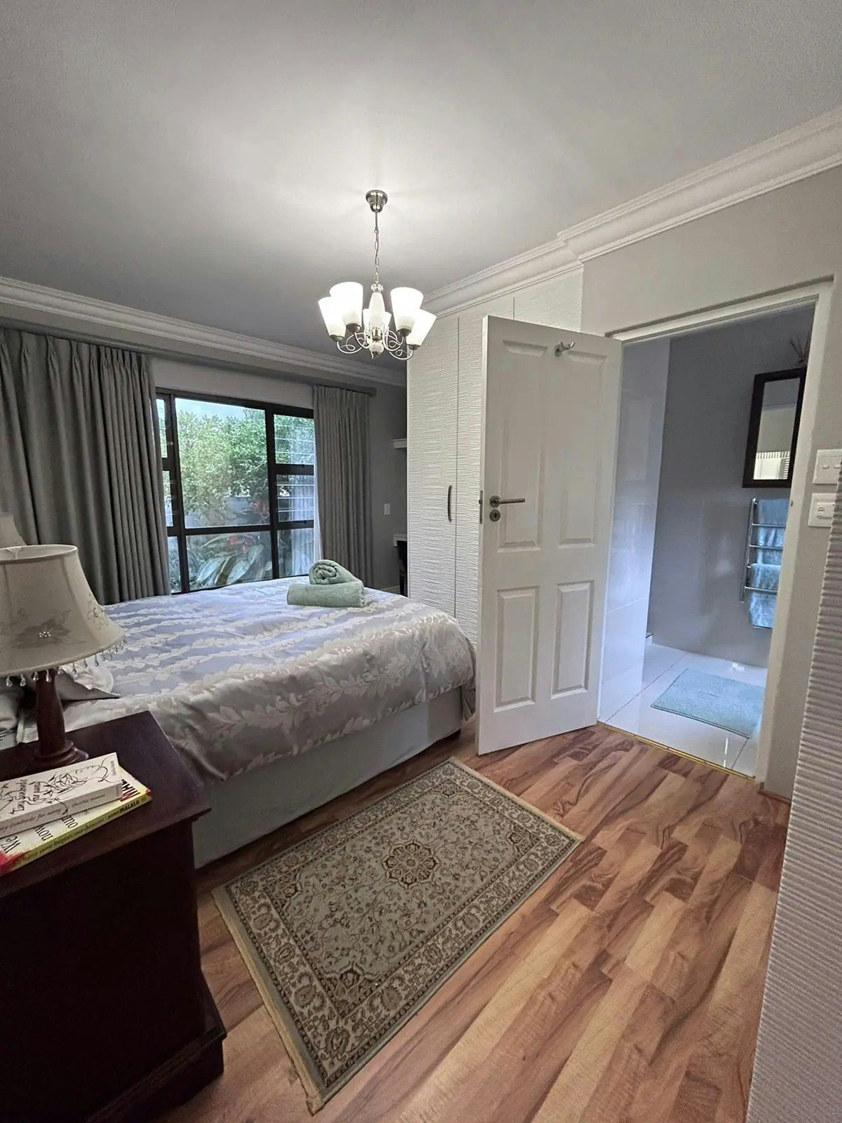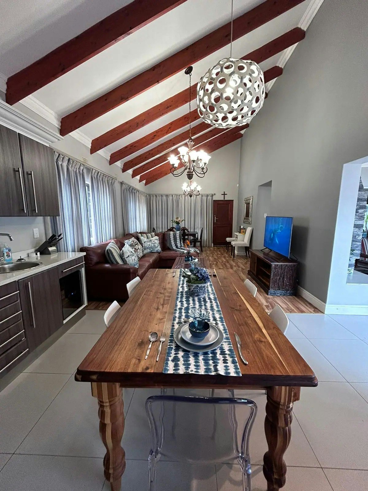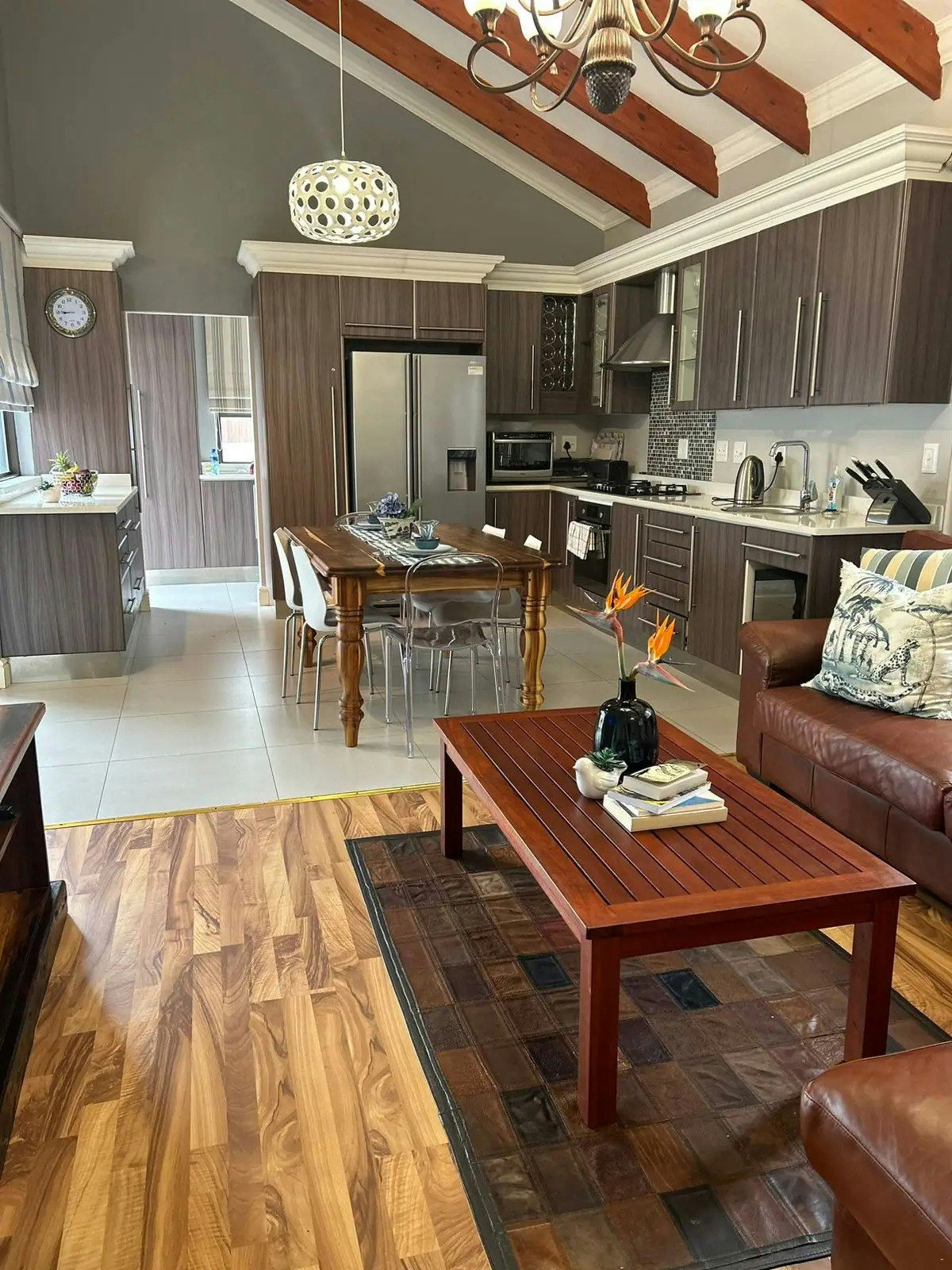 The open-plan kitchen is equipped with a fridge-freezer, gas hob, oven, microwave, cutlery and crockery, as well as tea- and coffee-making facilities. The scullery is equipped with an air fryer, dishwasher, washing machine, and tumble dryer. There’s a dining table where guests can enjoy their meals together and the spacious living area has a comfortable leather couch and a flat-screen TV installed with DStv. Free Wi-Fi is also available.