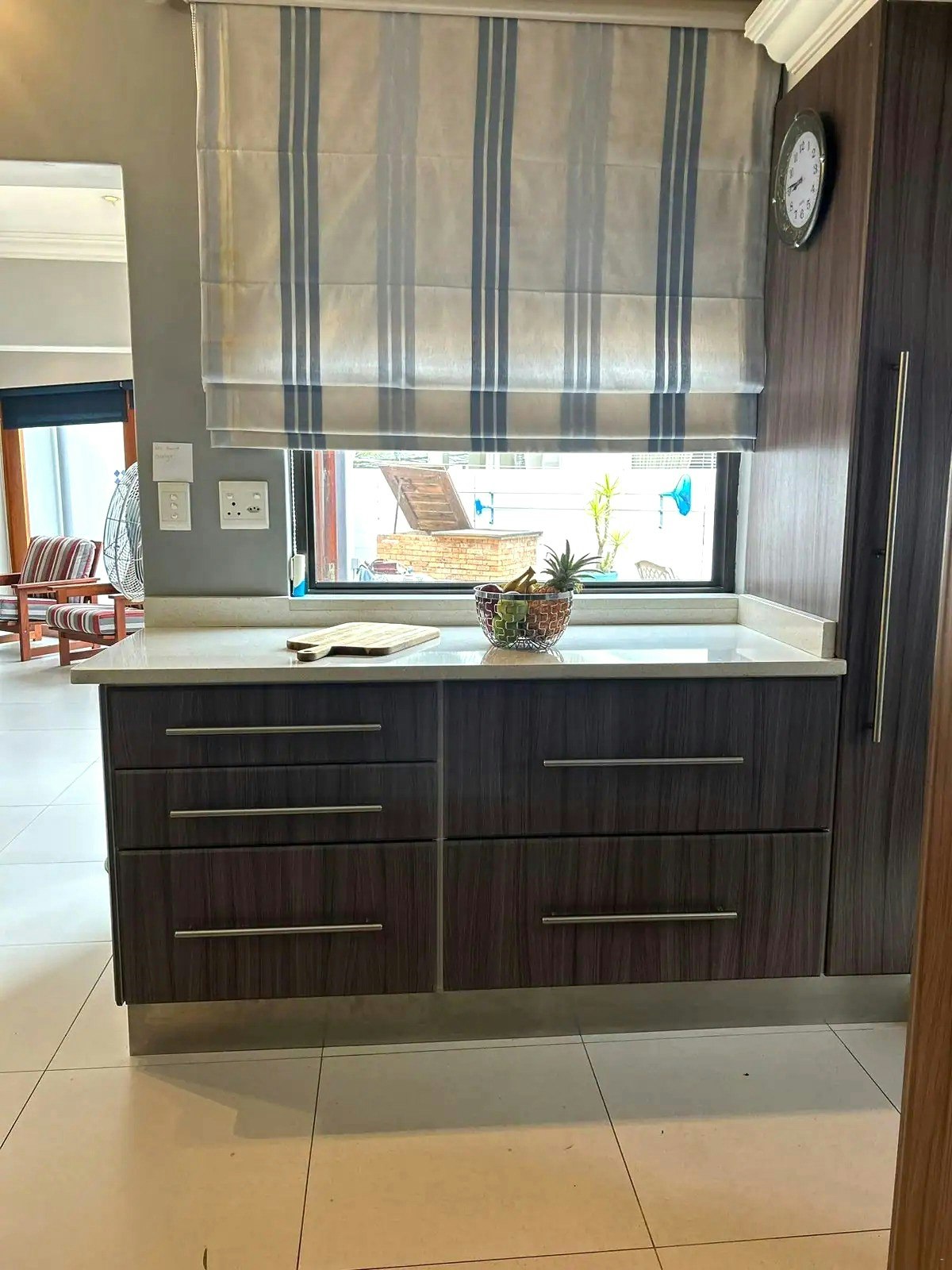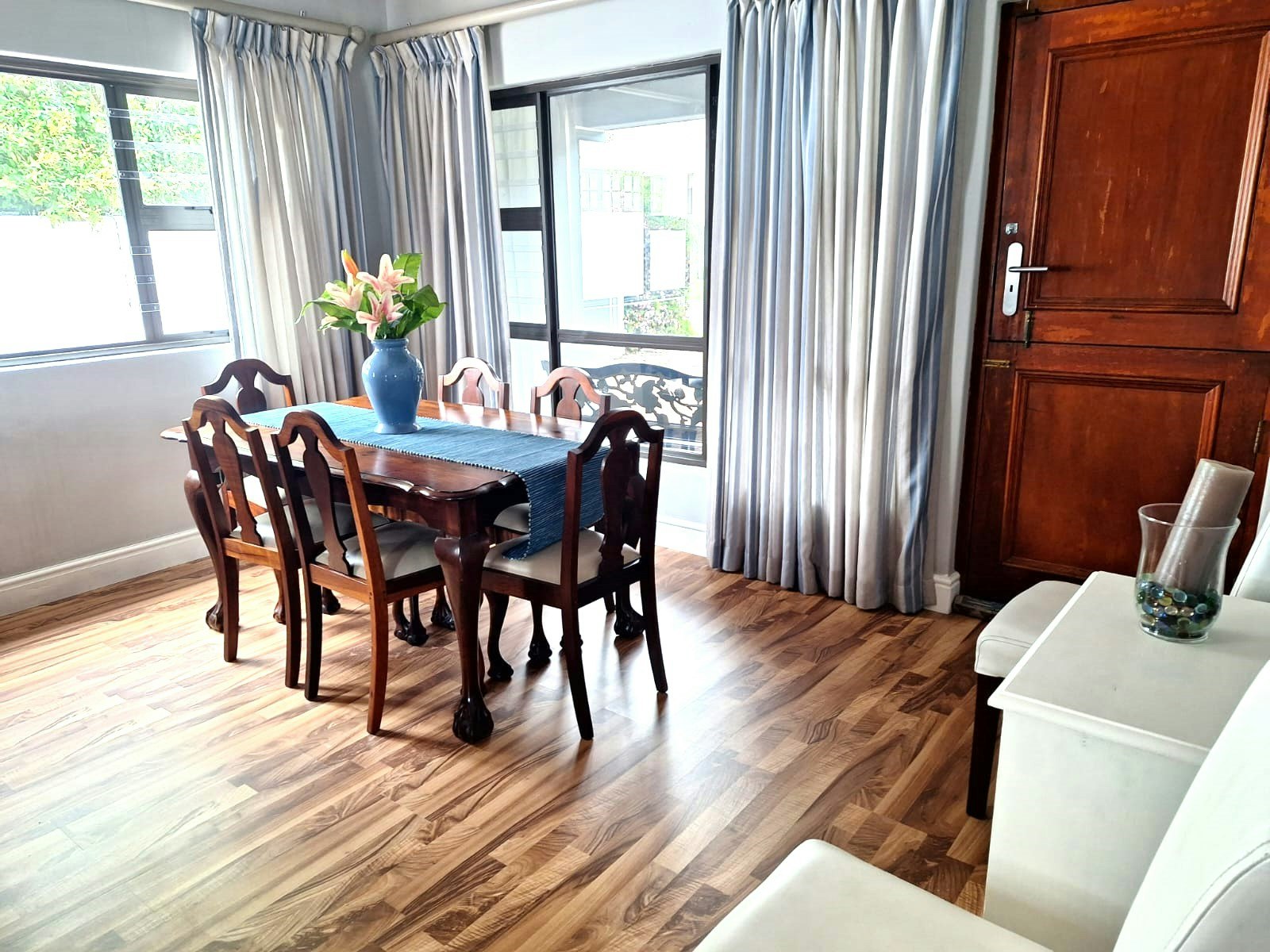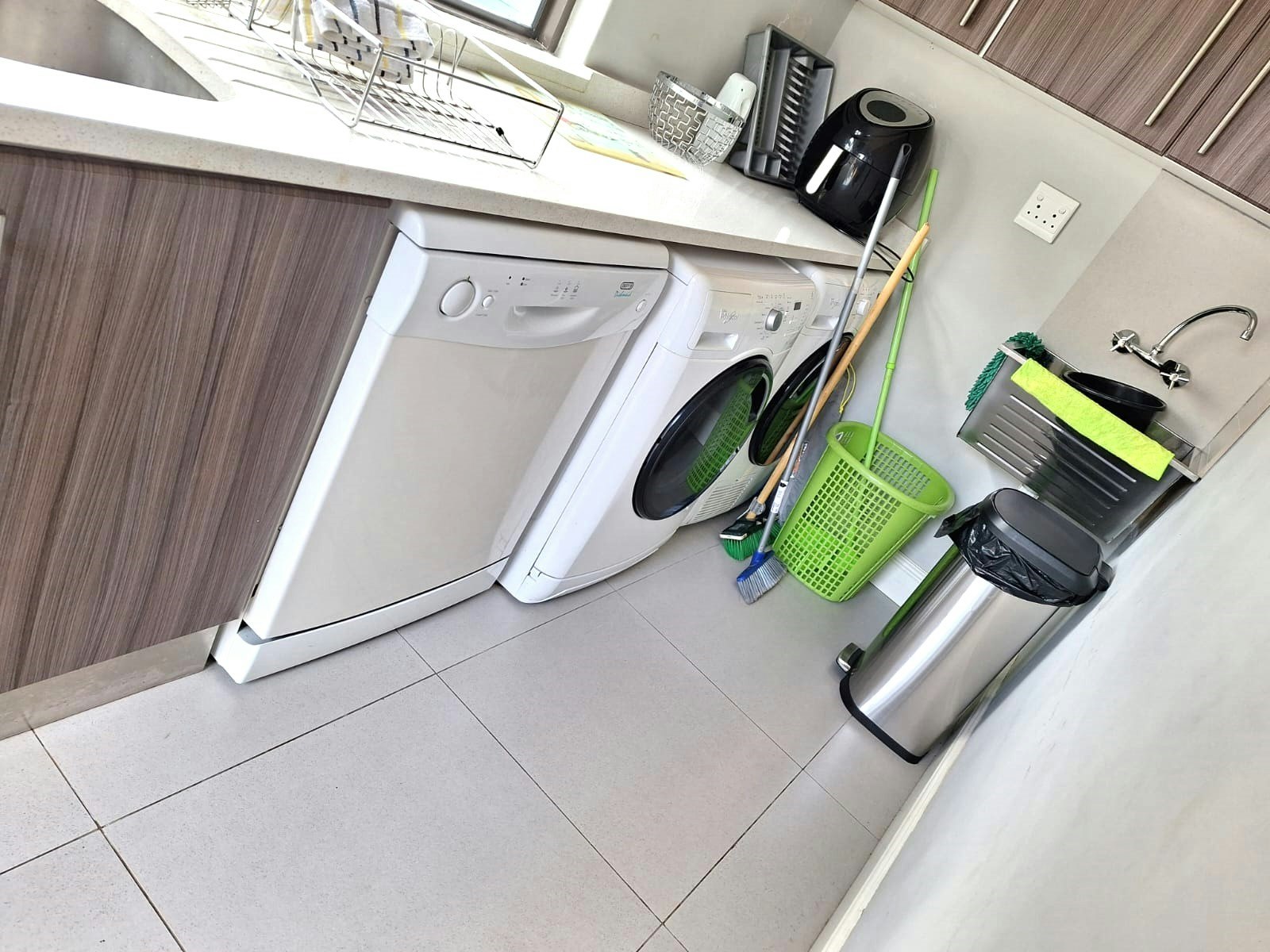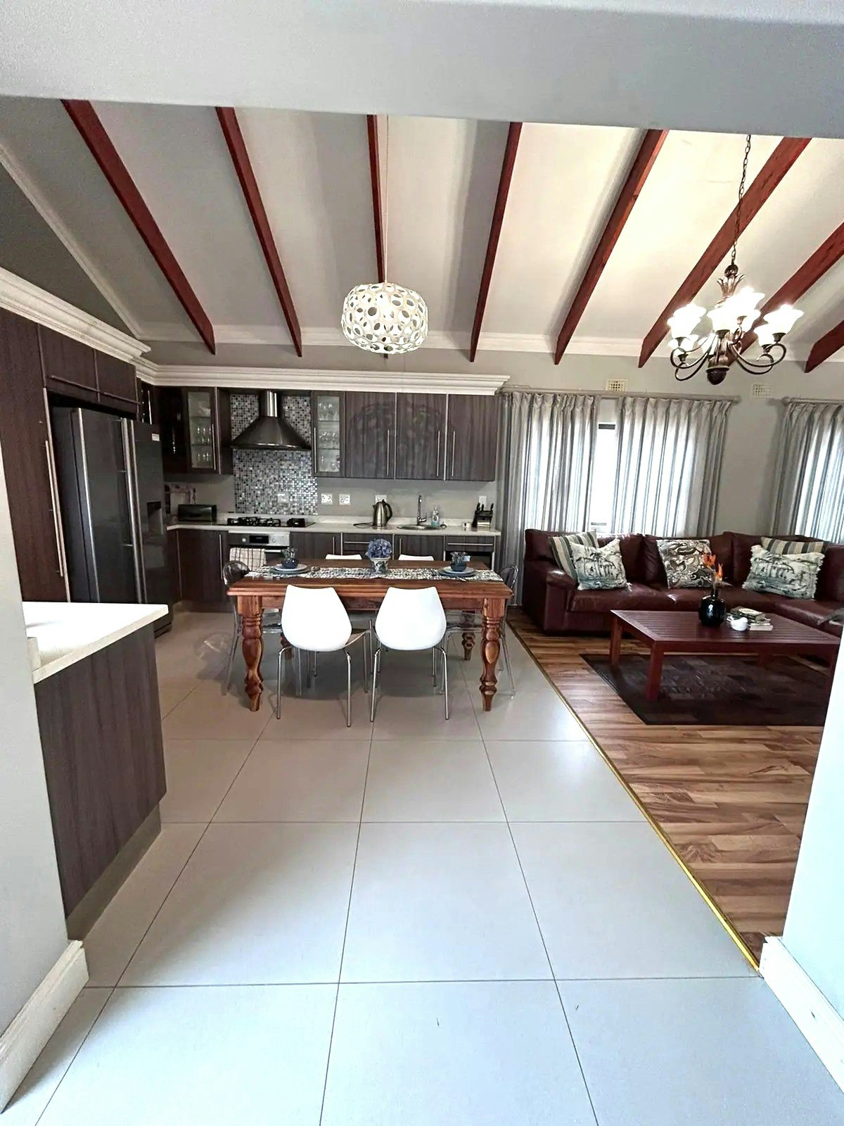 The open-plan kitchen is equipped with a fridge-freezer, gas hob, oven, microwave, cutlery and crockery, as well as tea- and coffee-making facilities. The scullery is equipped with an air fryer, dishwasher, washing machine, and tumble dryer. There’s a dining table where guests can enjoy their meals together and the spacious living area has a comfortable leather couch and a flat-screen TV installed with DStv. Free Wi-Fi is also available.