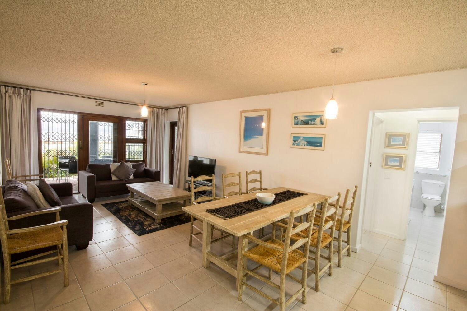 The living area features an open-plan design with a fully equipped kitchen, including a stove, oven, microwave, fridge-freezer, cutlery, and crockery. A 6-seater dining table adjacent to the kitchen is perfect for meals. The lounge area is furnished with comfortable seating, a TV with DStv channels, and free Wi-Fi facilities.