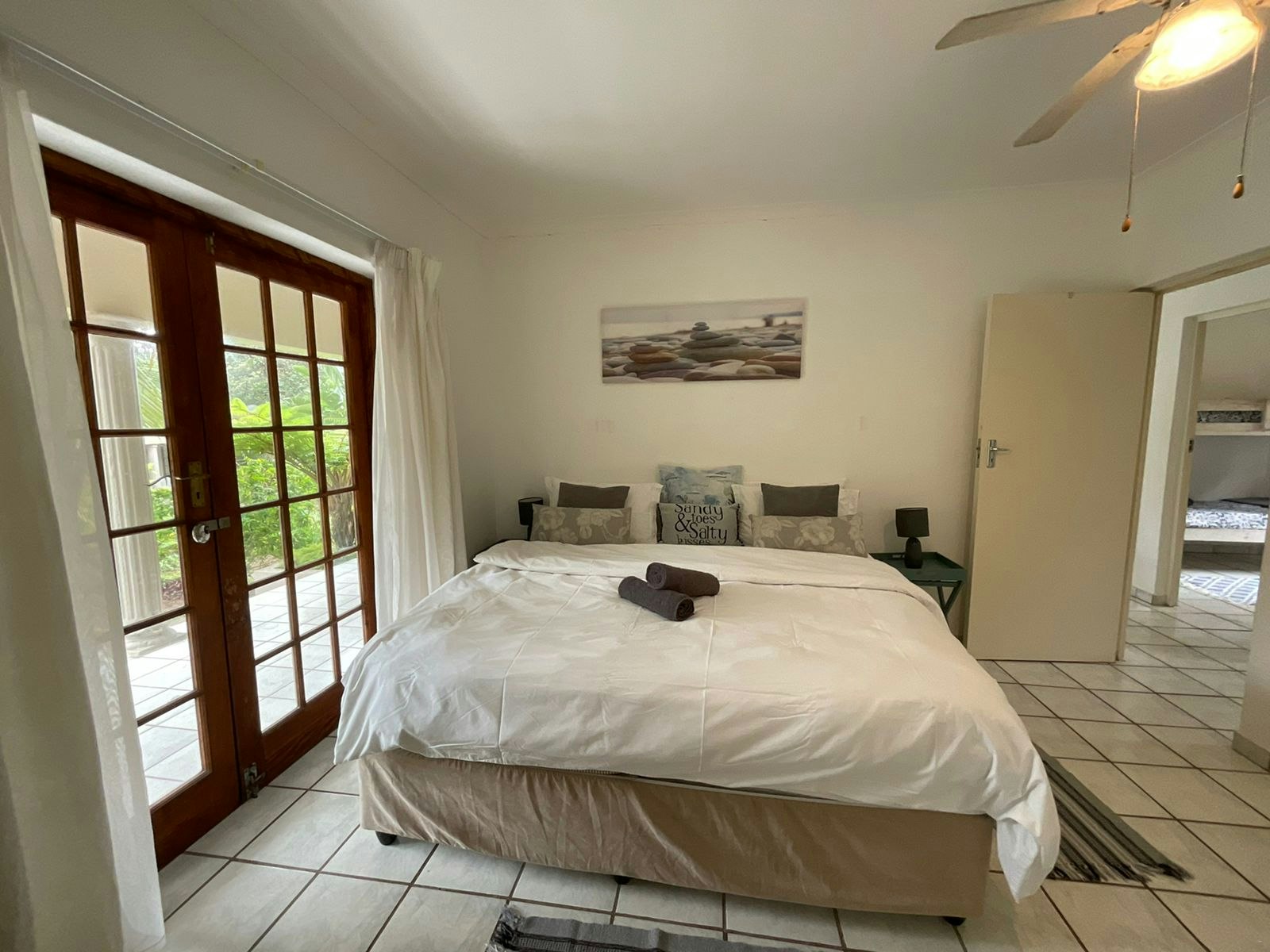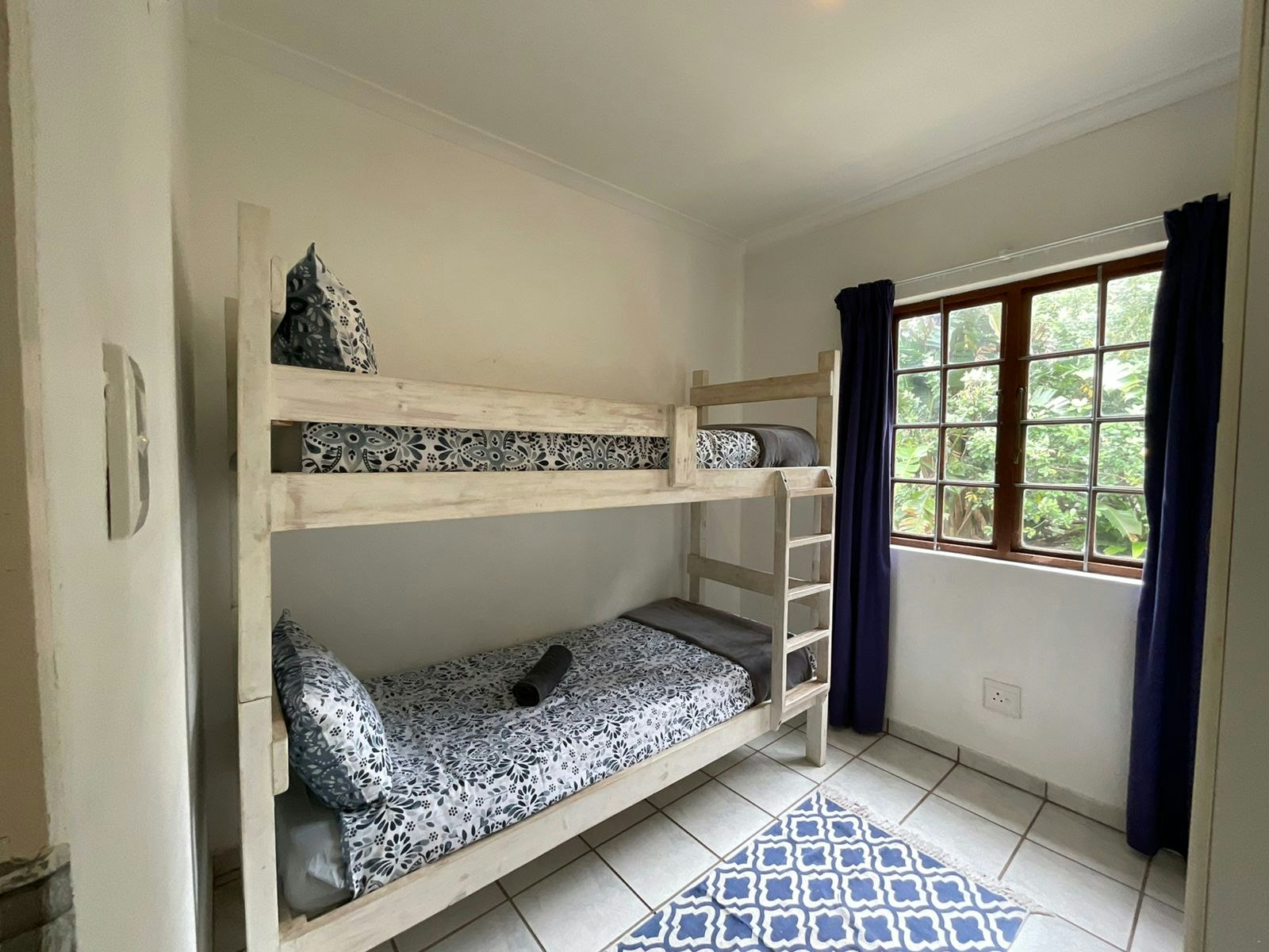 The Tassel-Berry, Sausage Tree, Milkwood, and Onionwood villas each have 3 bedrooms, 2 bathrooms, a kitchen and a living area. The main bedroom has a king-size bed and features an en-suite bathroom fitted with a shower, toilet with a bidet, and a washbasin. The second bedroom has 2 single beds and the third bedroom has a bunk bed. These two bedrooms share the second bathroom fitted with a bath, toilet, and washbasin.