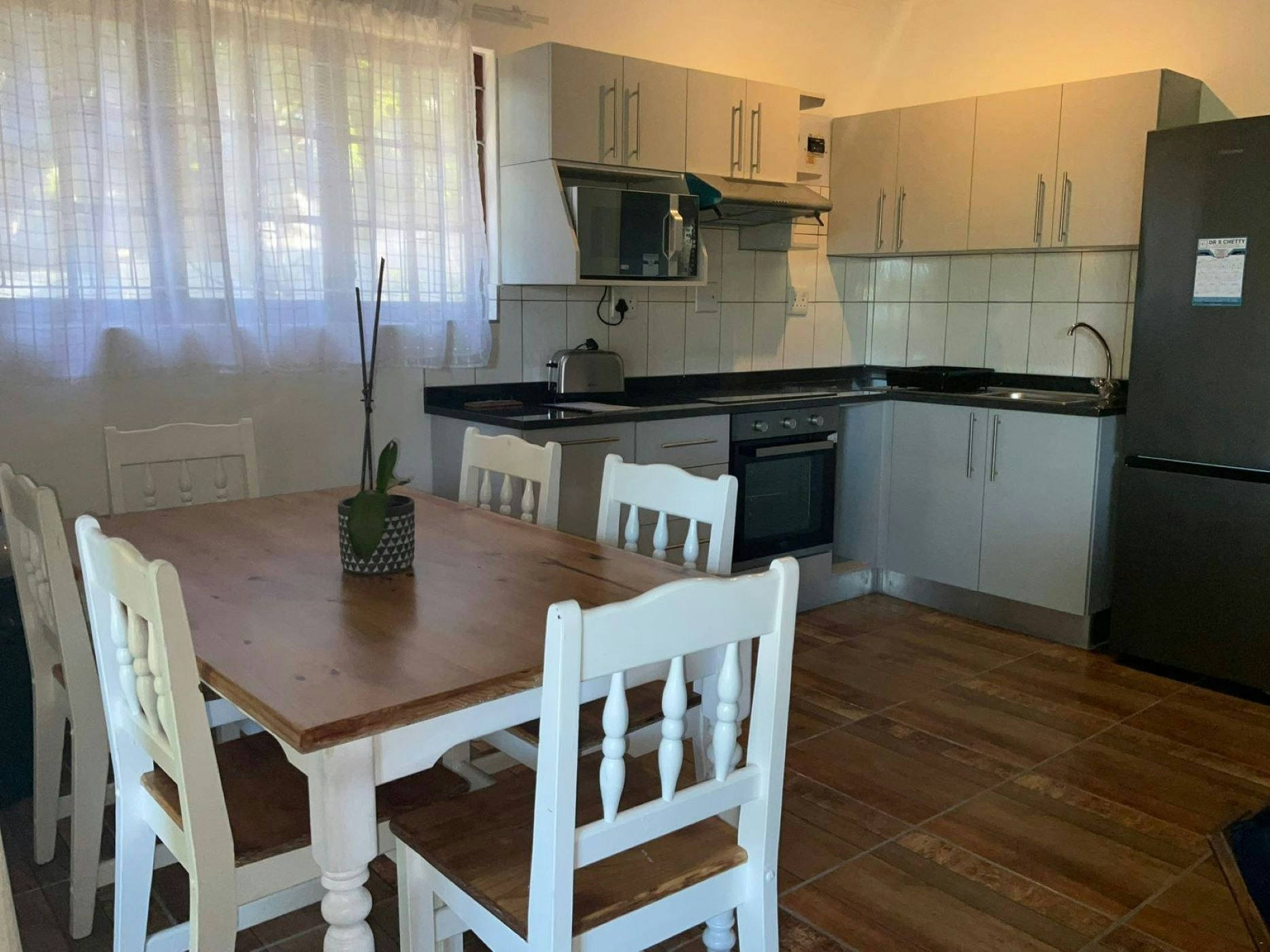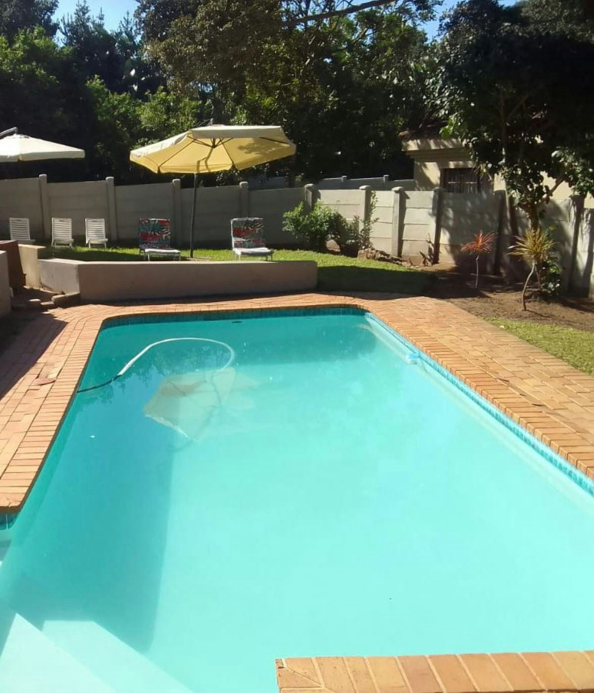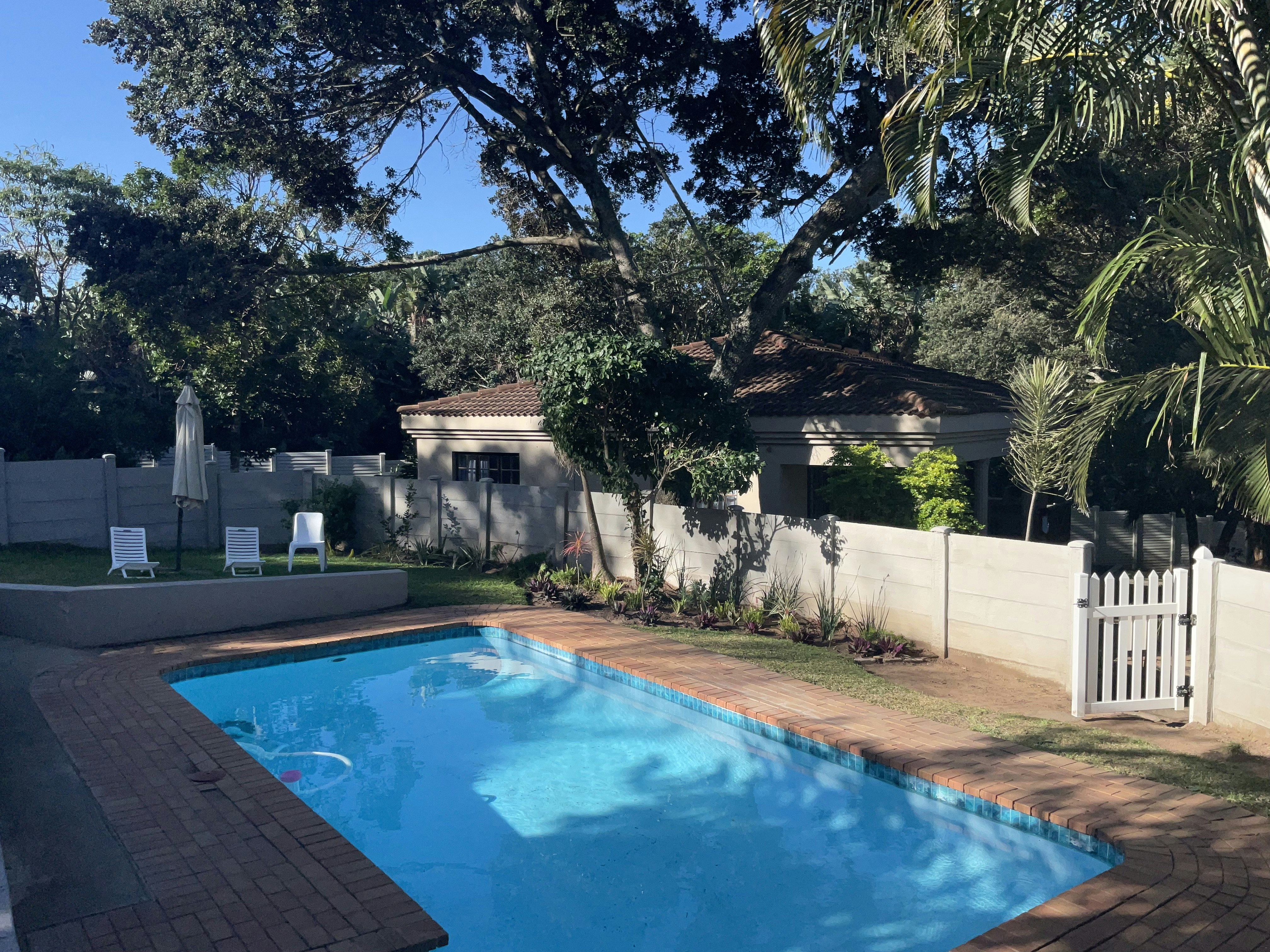The stack doors open onto a stunning patio with its own private braai area. The lounge and entertainment area is ideal for relaxing with family and friends, playing board games, reading, and a flat-screen TV installed with Openview. Adjacent to the lounge is the fenced shared swimming pool. The chalets are positioned to maximise privacy, nestled among beautiful indigenous trees with abundant birdlife and where the little Blue Duiker and Bushbuck may be spotted. The property is fully electric fenced, with secure parking.