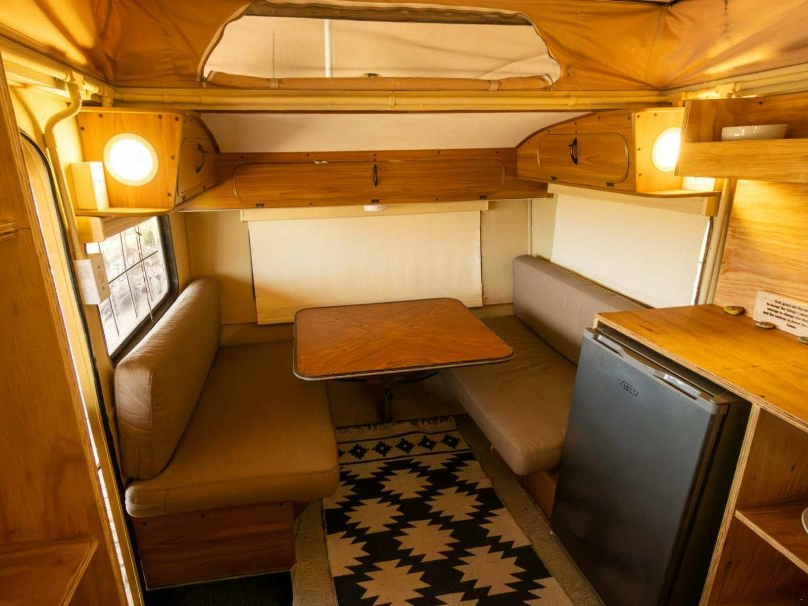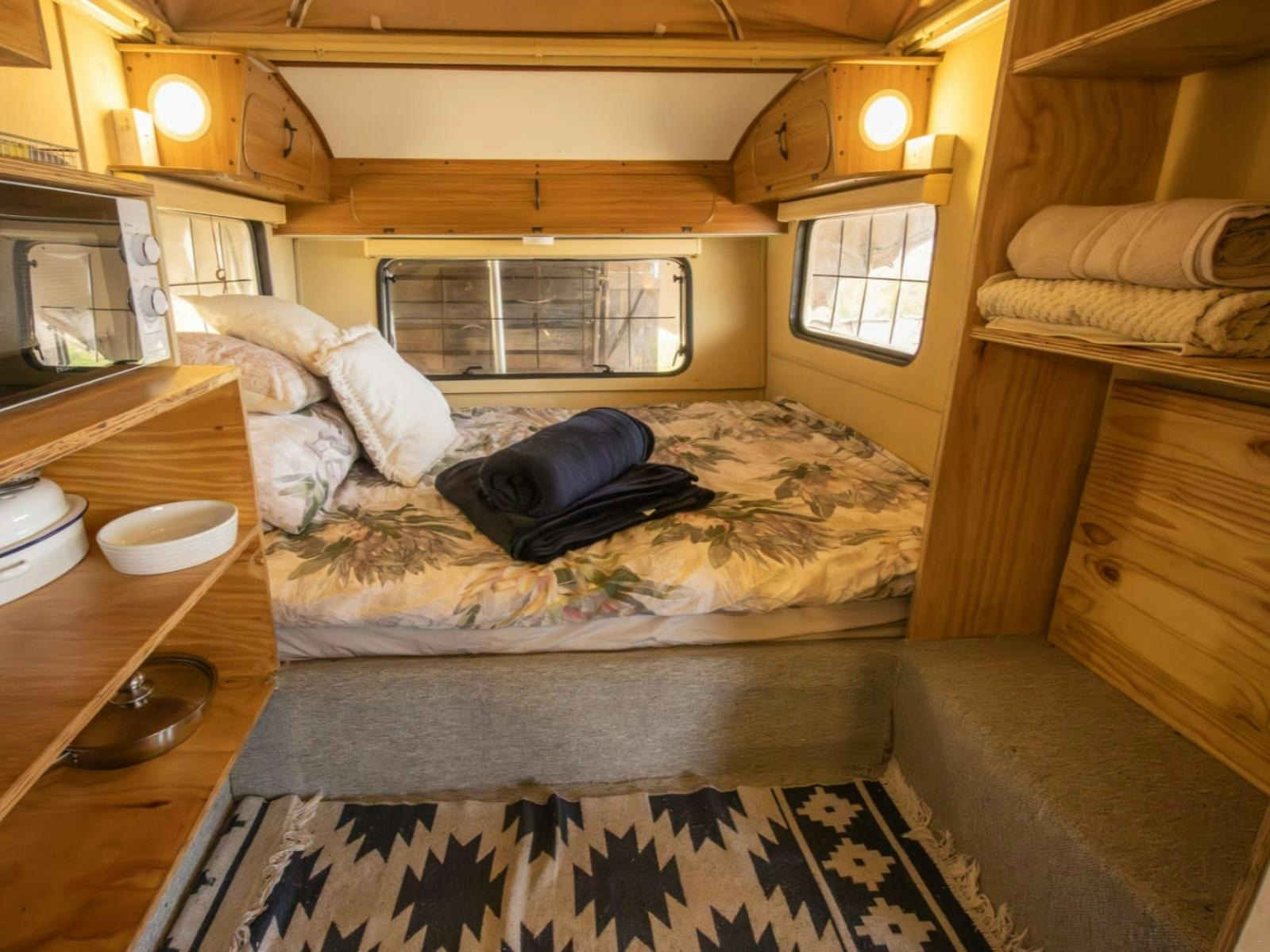 Locum Igni offers a unique glamping experience and can accommodate up to 4 guests at a time (2 adults and 2 children). This charming caravan features a comfortable queen-size bed and a three-quarter bed suitable for two children. The bathroom is fitted with a shower, basin, and toilet. Linen and towels are provided.