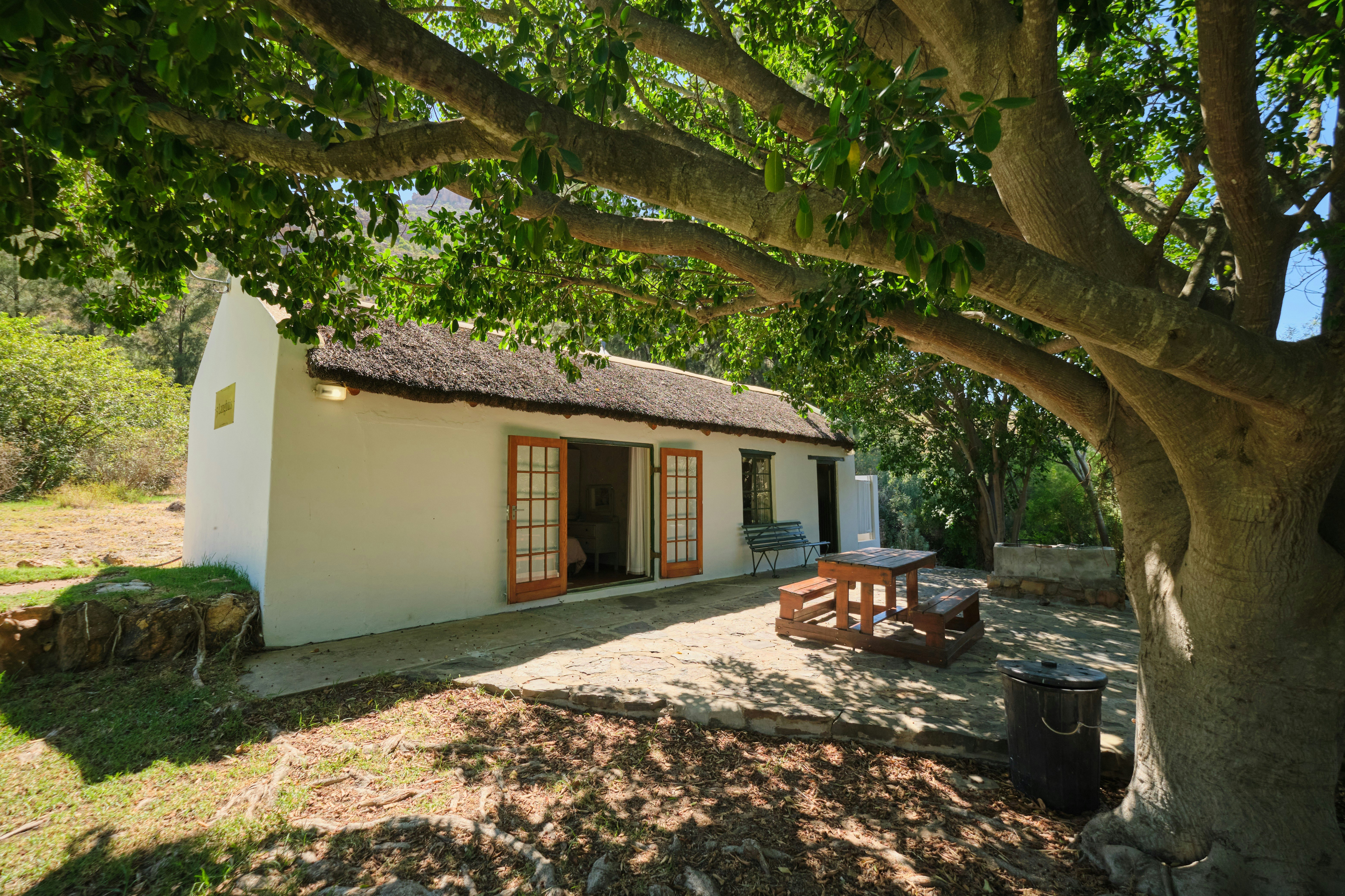 Outside there is a lovely patio with a picnic table and a built-in braai which is the perfect spot for guests to fully relax with a sundowner while overlooking the surrounding countryside.